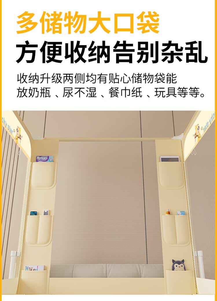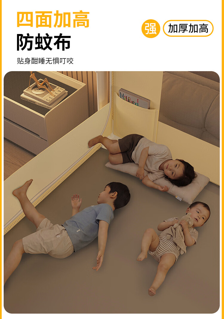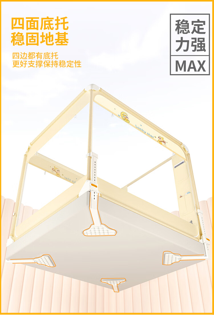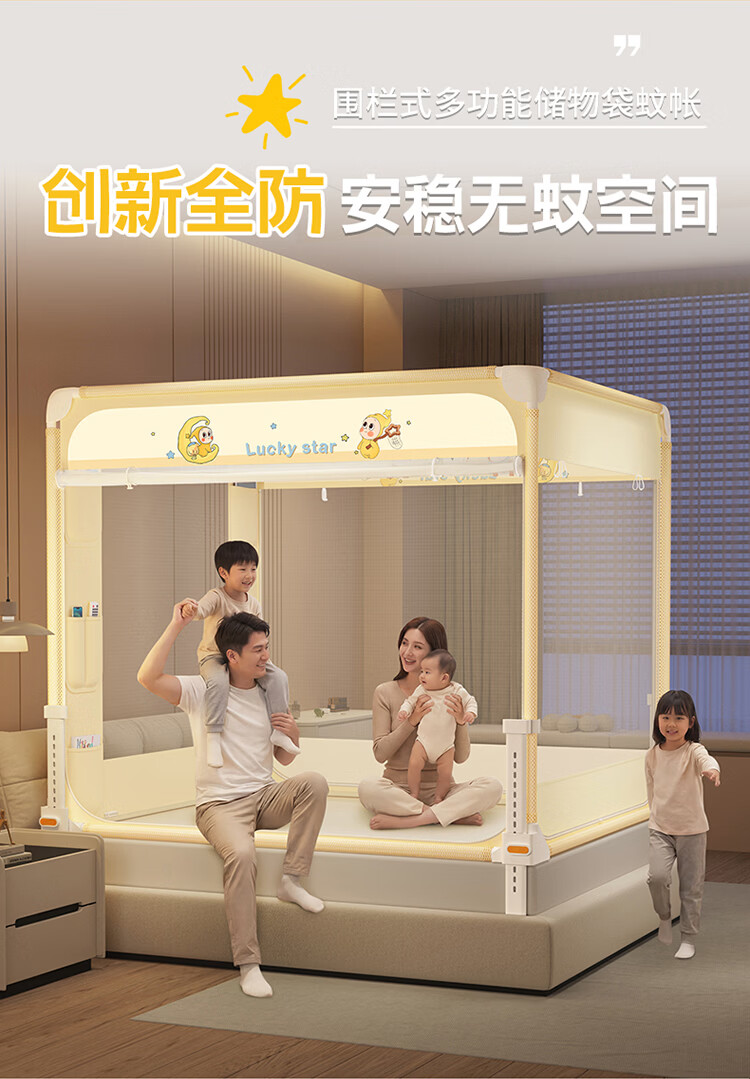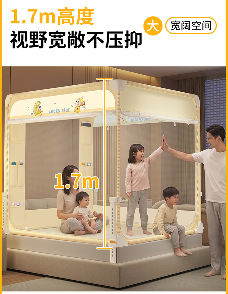 无印良品A类家用蚊帐1.5米x2米全底可升降蚊帐架卧室儿童一体式防摔床围栏 Lucky星宝【加密帐纱 防摔防蚊】 120cm*200cm*170cm 【围栏支架】