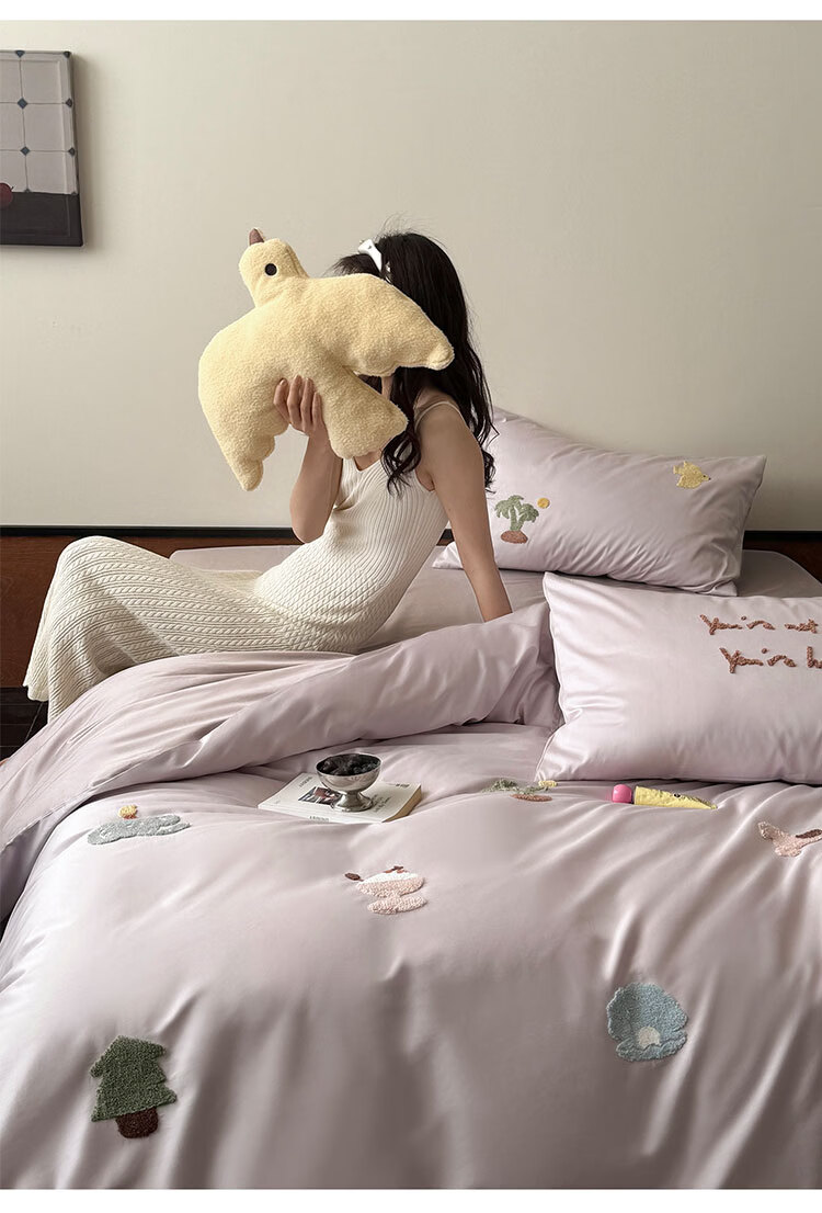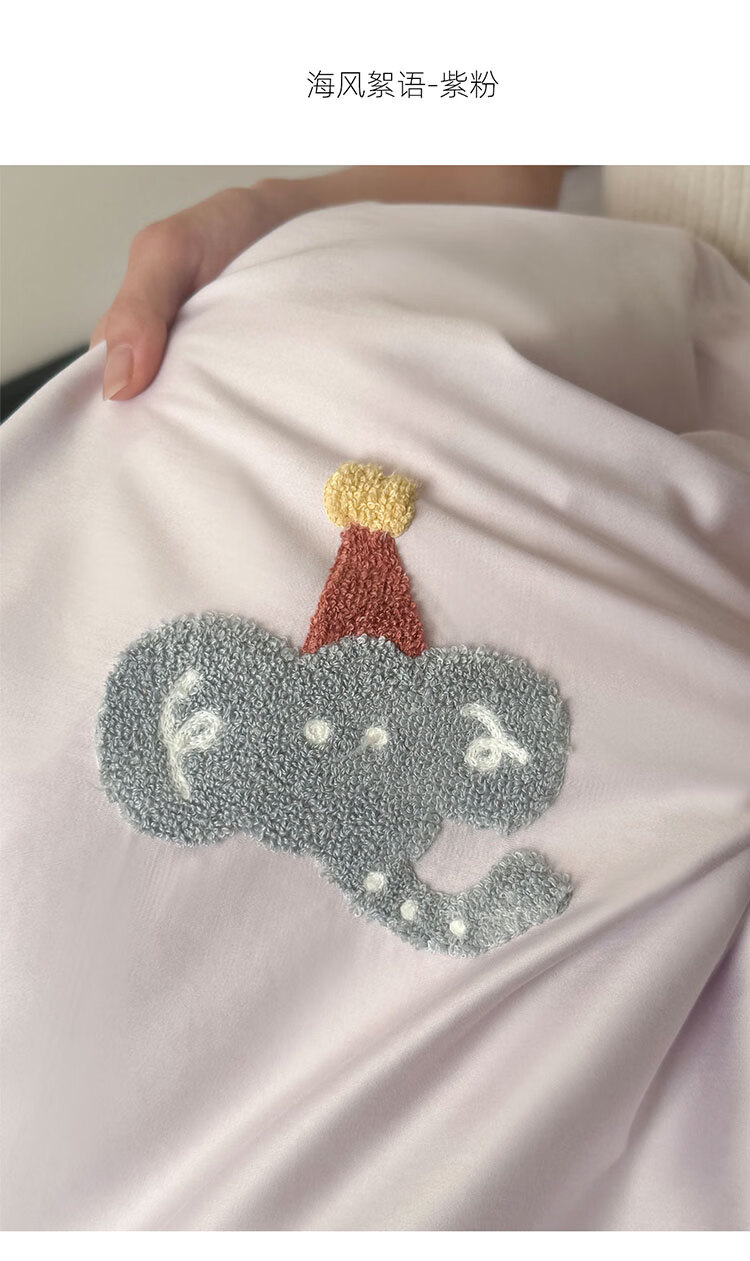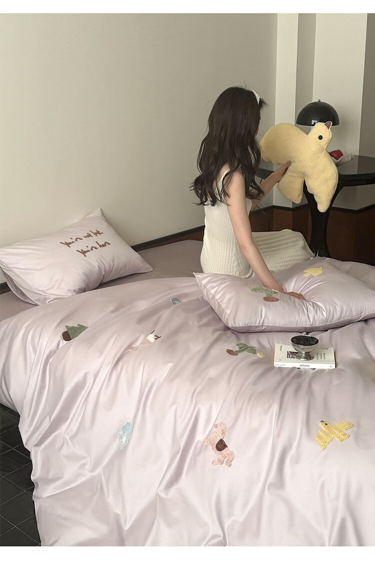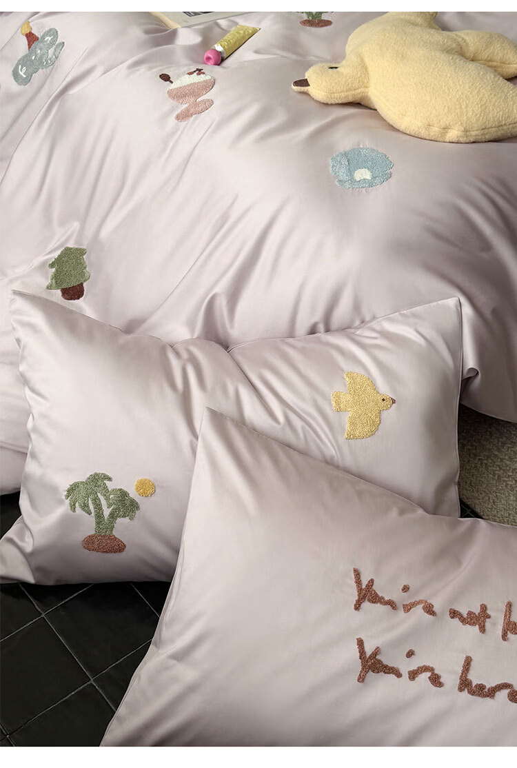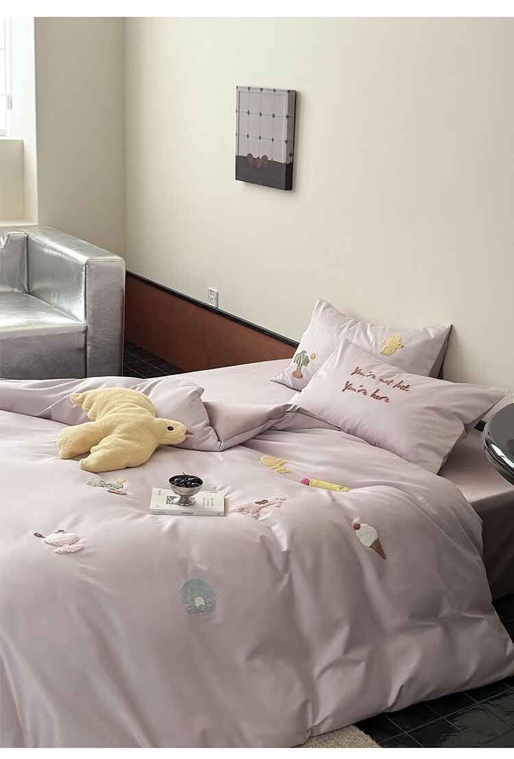 ROLAND LIVE春夏新款长绒棉毛巾绣四件套纯棉透气被套全棉床单单双人床套件 LB 长绒棉套件-海风絮语紫粉 1.2米床 床单款 【被套150*200cm】