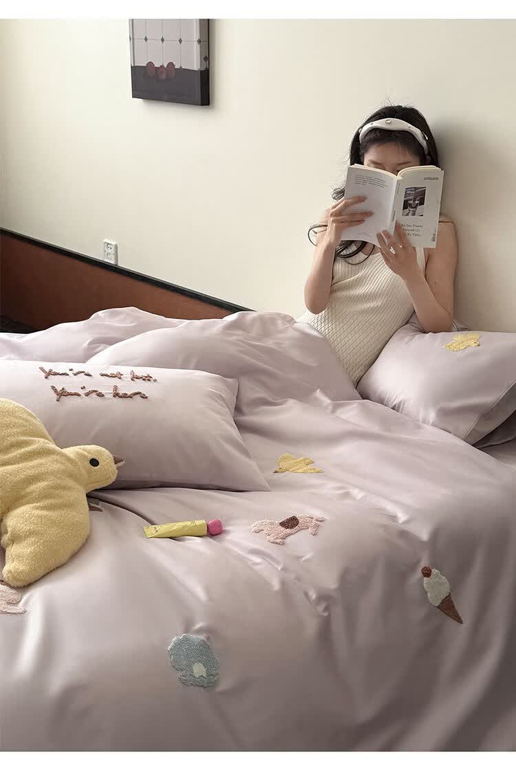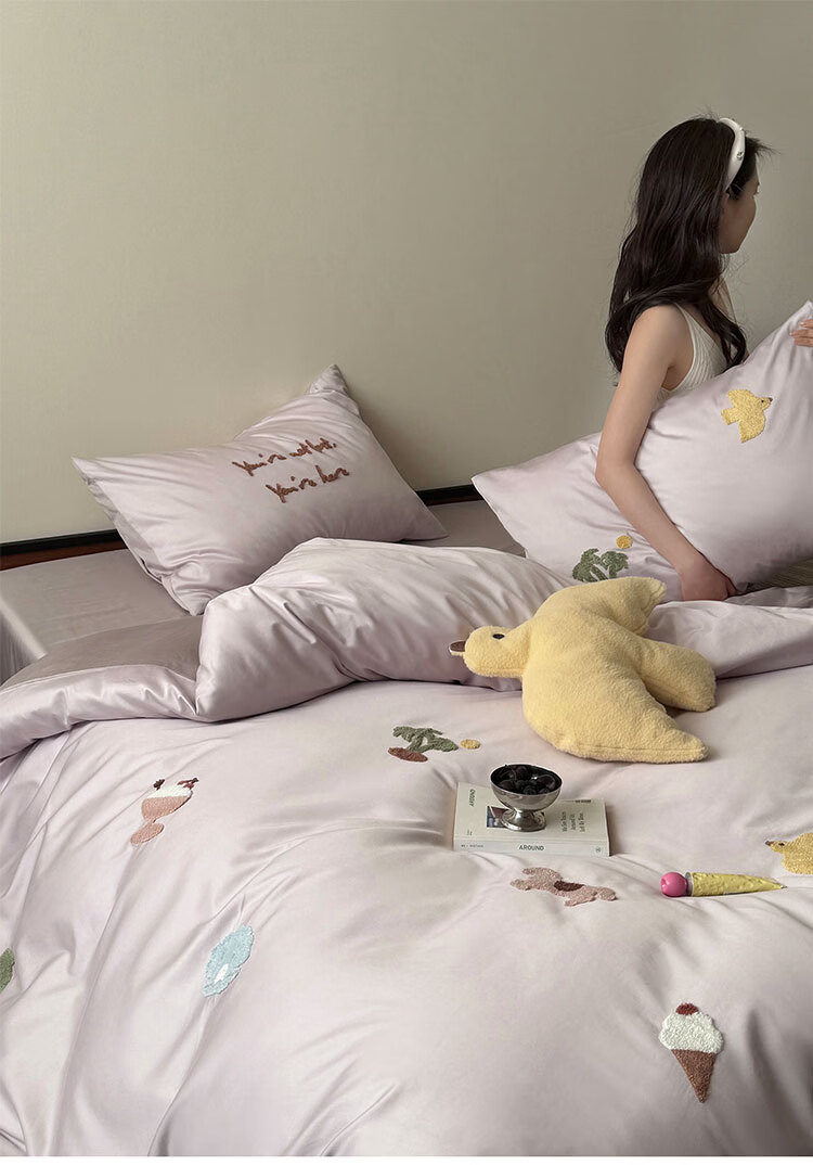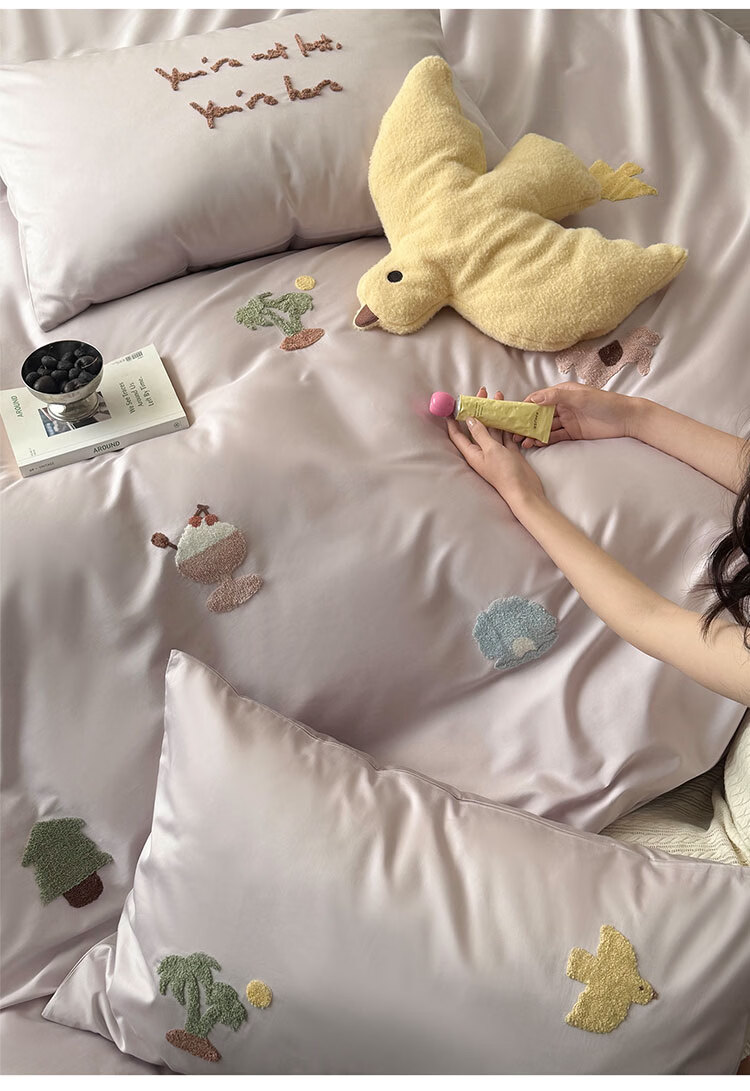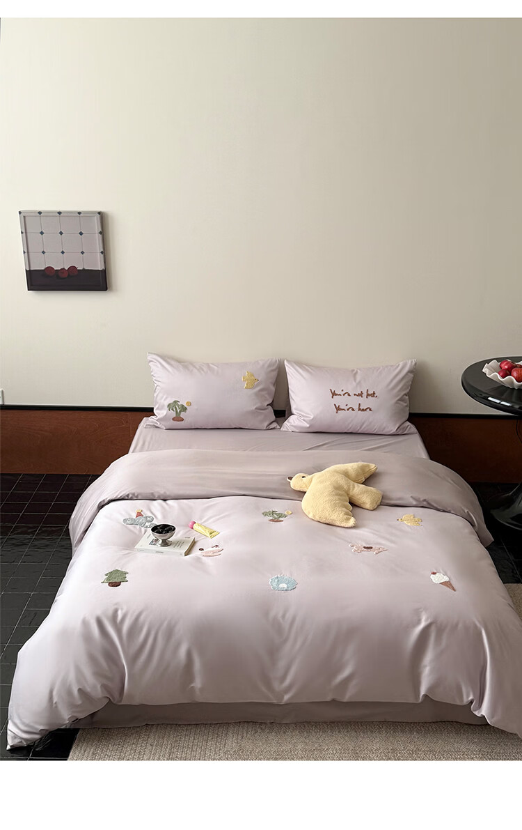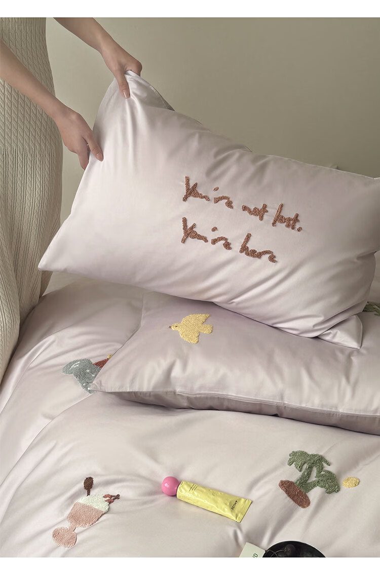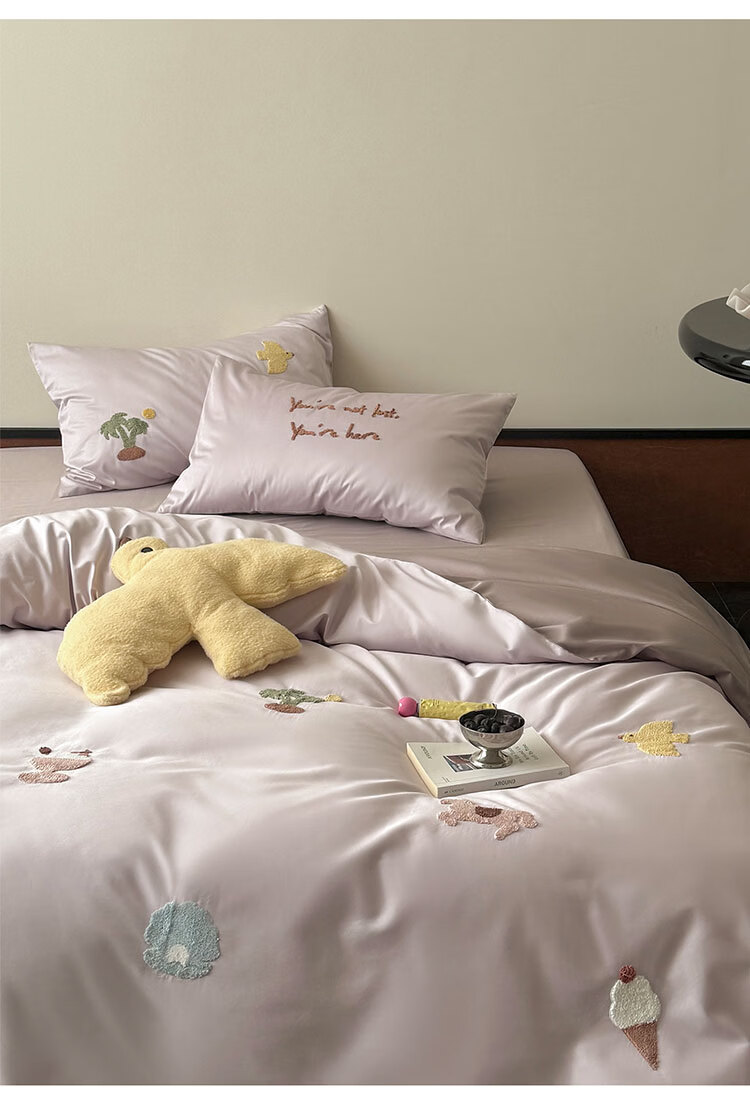 ROLAND LIVE春夏新款长绒棉毛巾绣四件套纯棉透气被套全棉床单单双人床套件 LB 长绒棉套件-海风絮语紫粉 1.2米床 床单款 【被套150*200cm】