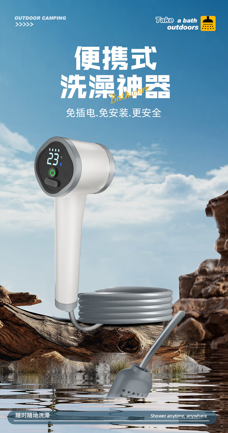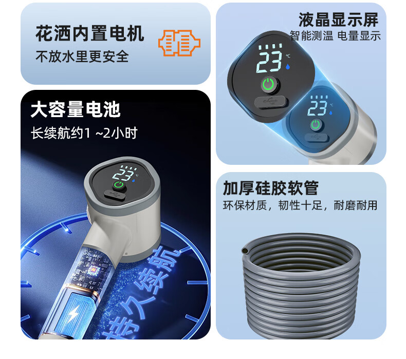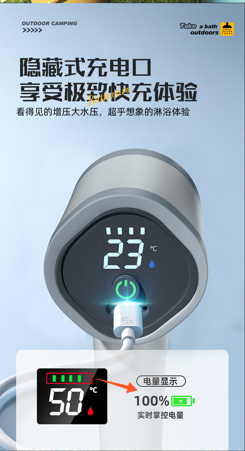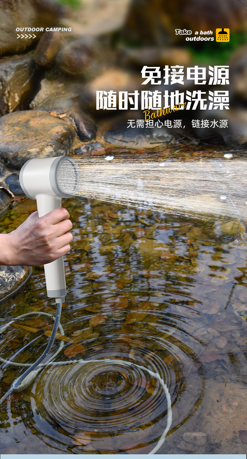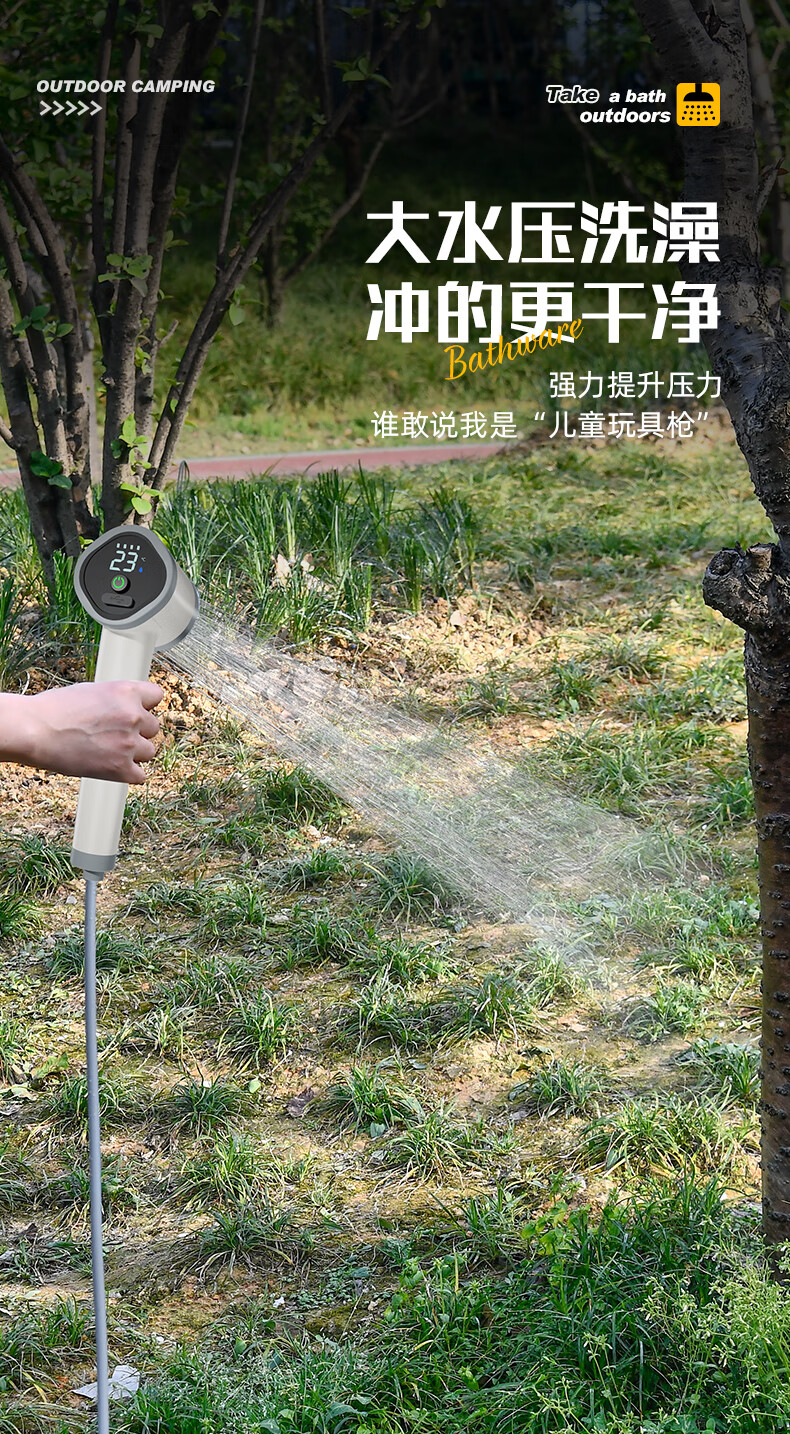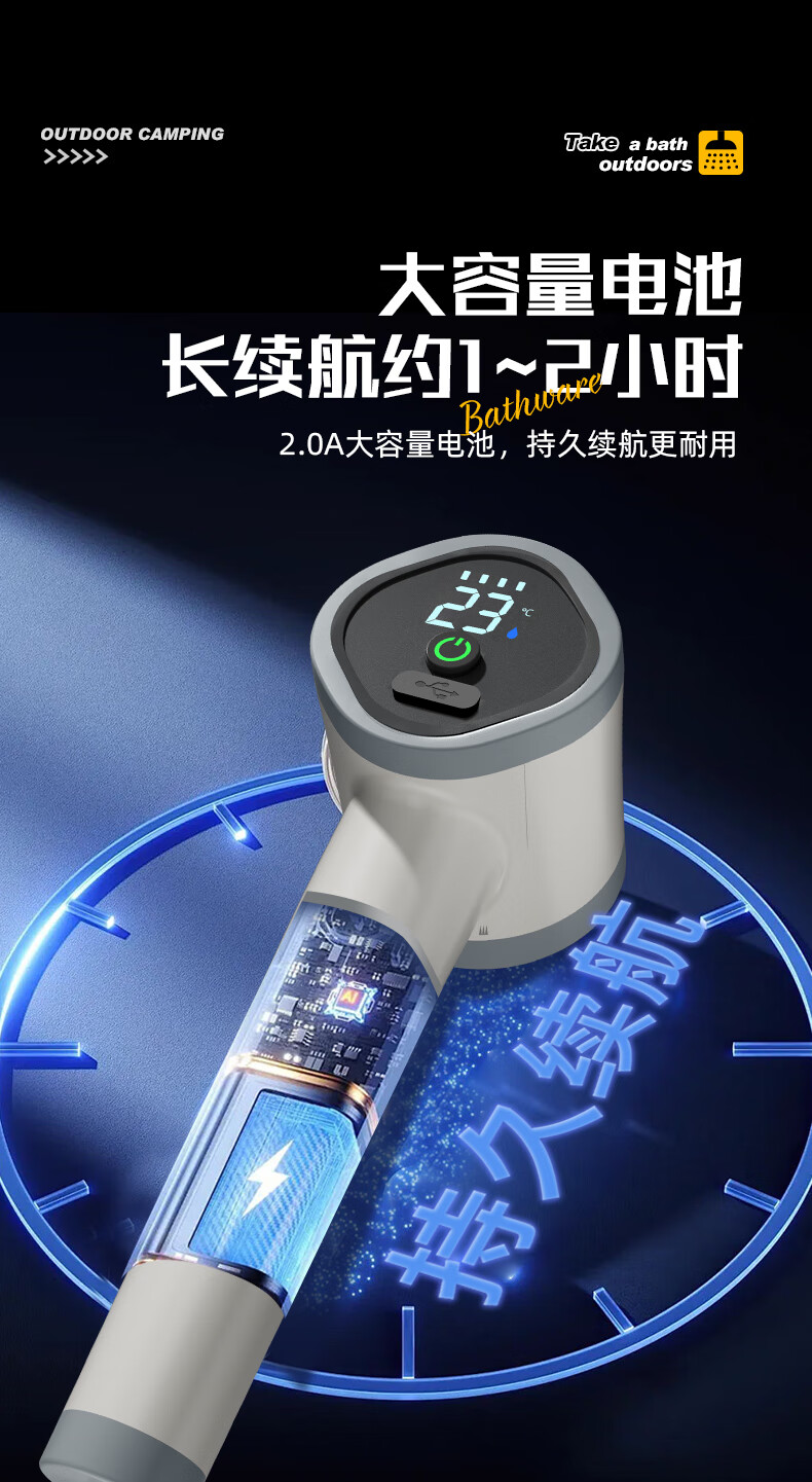 便携式智能充电一体花洒户外移动洗澡神器简易学生宿舍增压淋浴器 免安装户外花洒/测温/超长续航 2000毫安/水电分离-3.7V安全电压