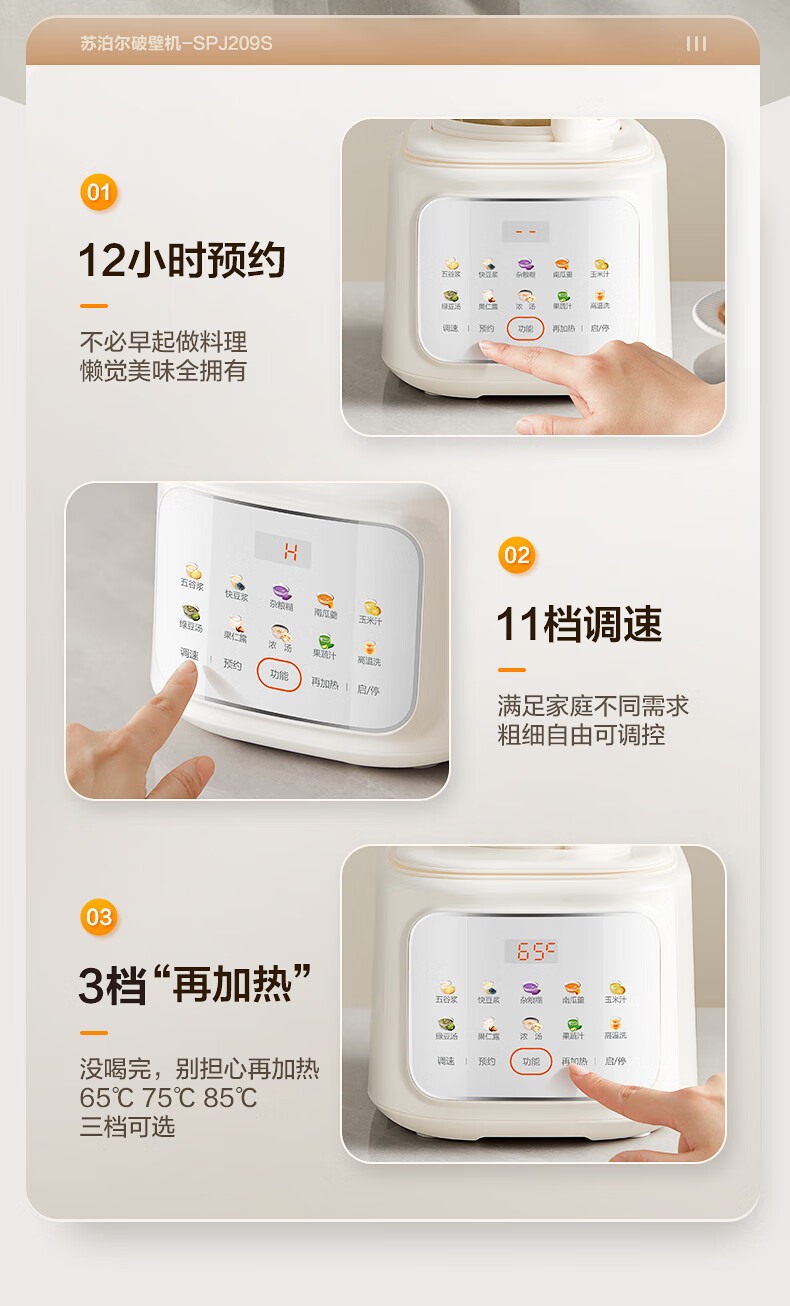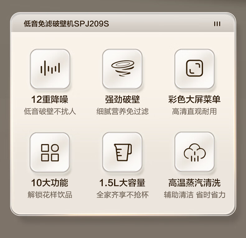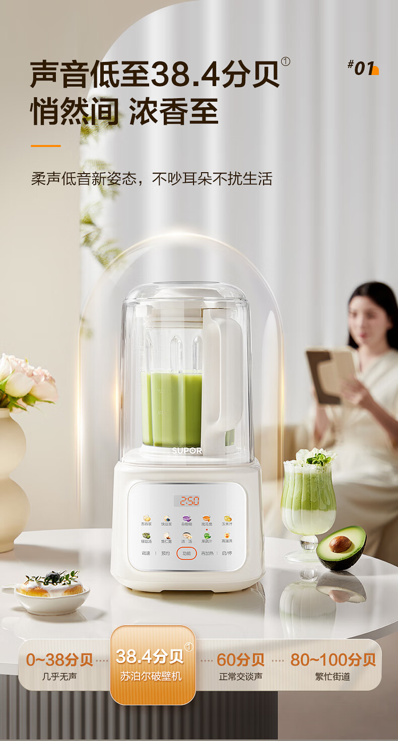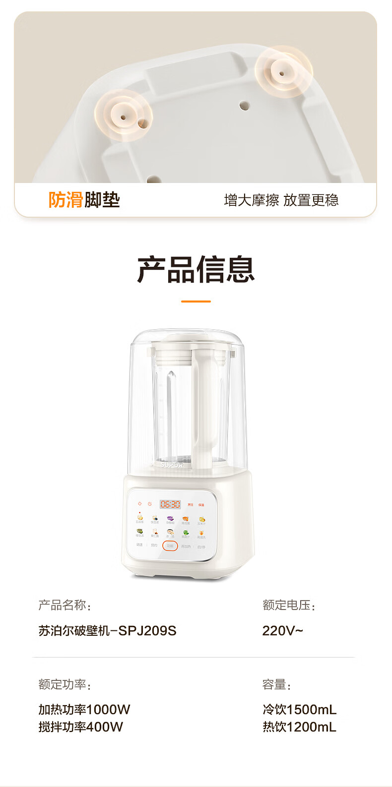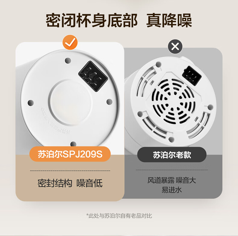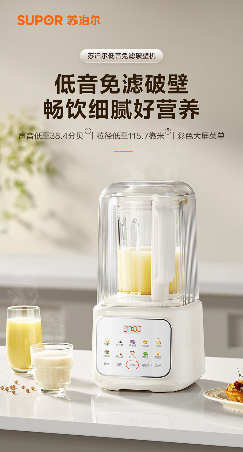 苏泊尔(SUPOR)轻音破壁机 1.5L低音有罩降噪家用豆浆机 预约加热免滤全自动辅食料理机 破冰碎冰榨汁机 SPJ209S