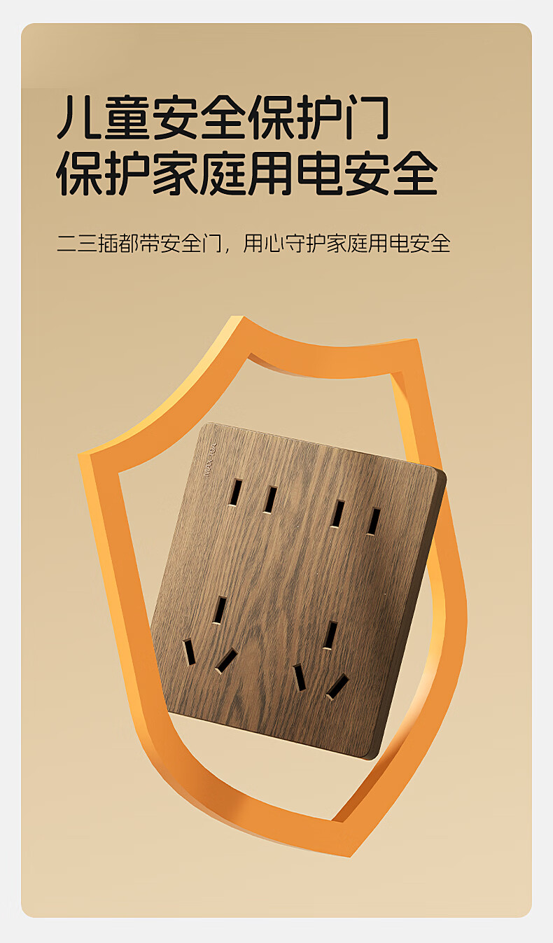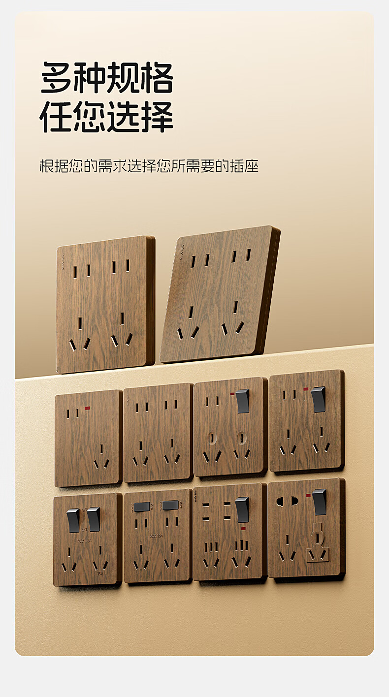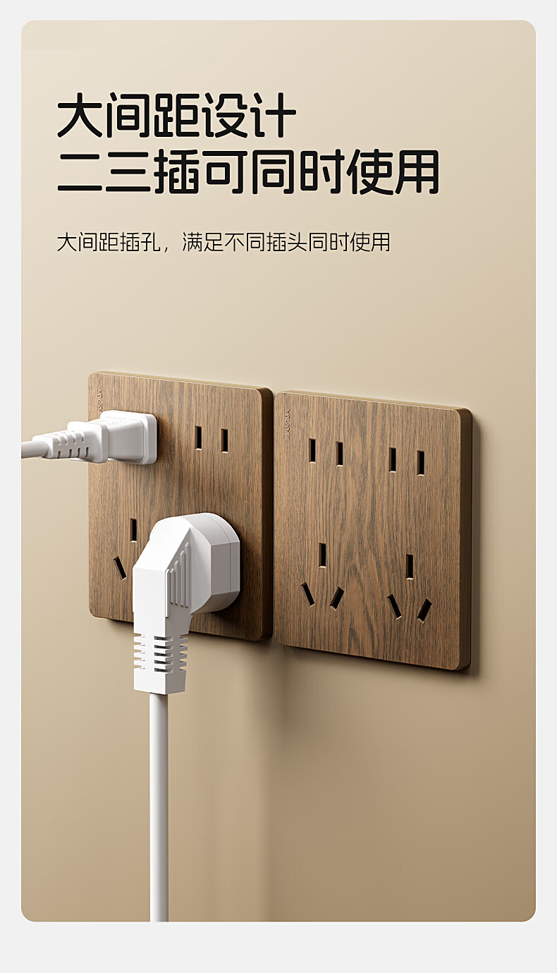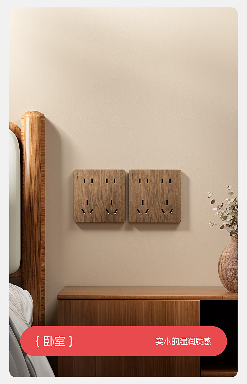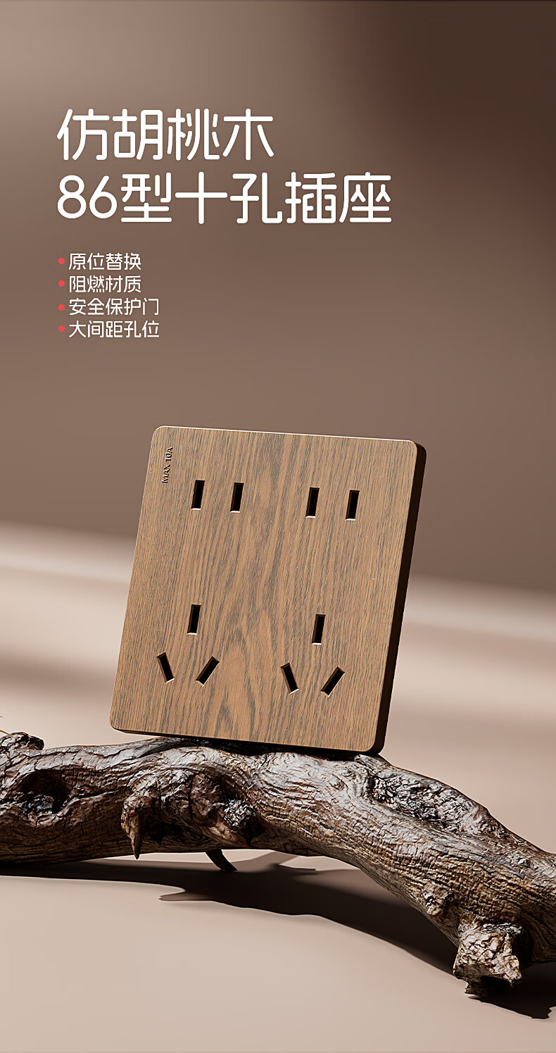 国际电工中古风木纹开关插座86型暗装面板家用民宿卧室国标十孔电源插板 胡桃木纹错位五孔