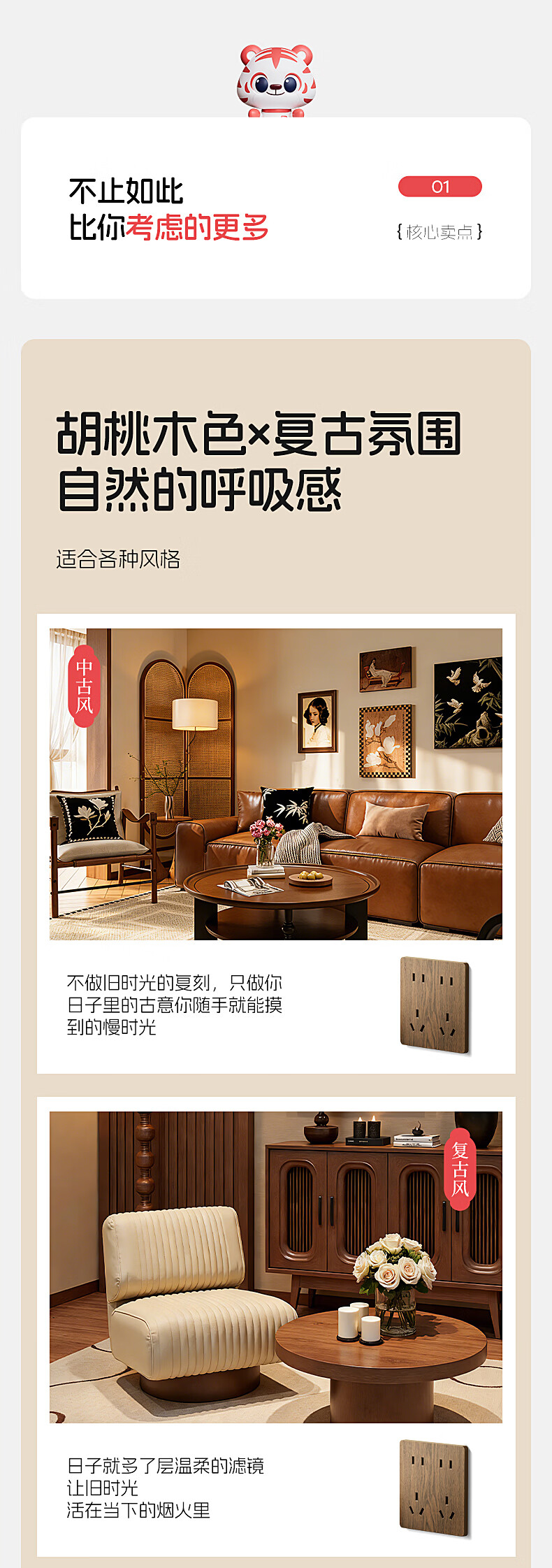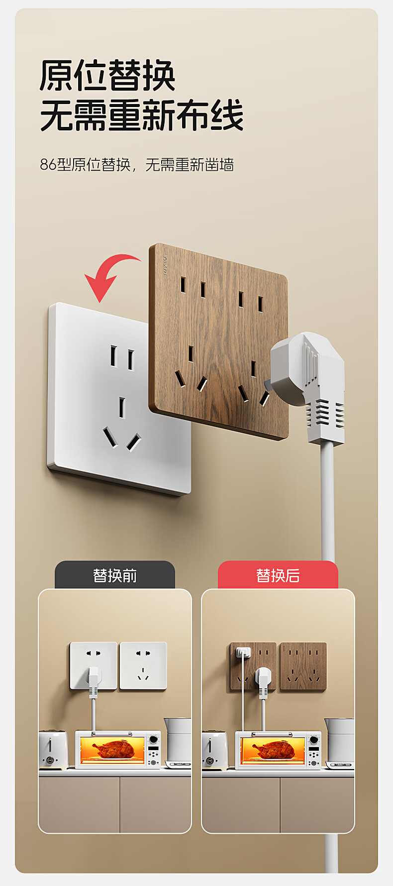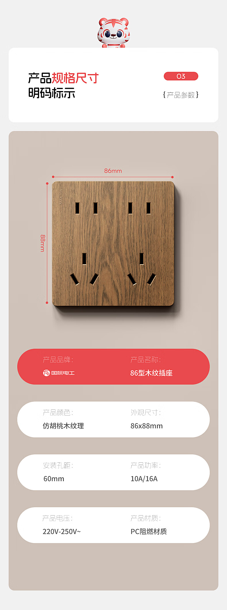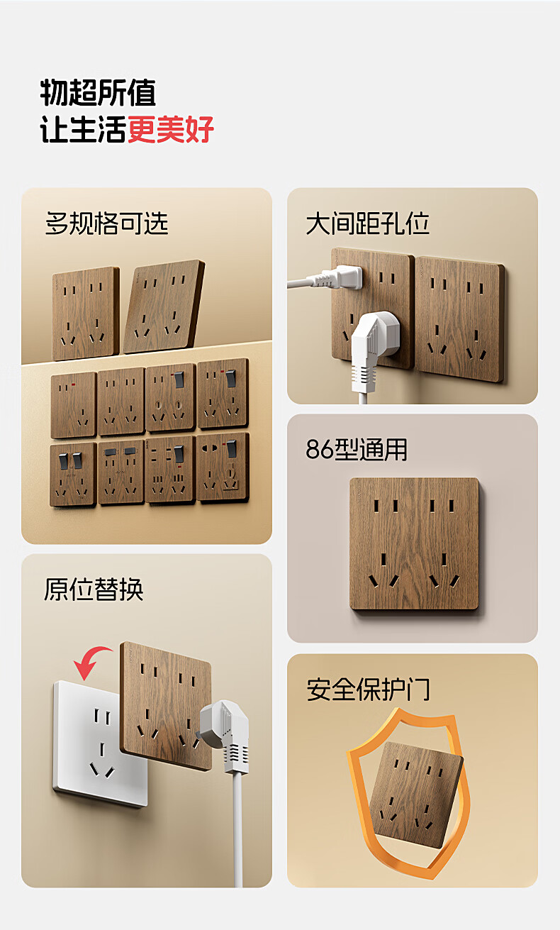 国际电工中古风木纹开关插座86型暗装面板家用民宿卧室国标十孔电源插板 胡桃木纹错位五孔