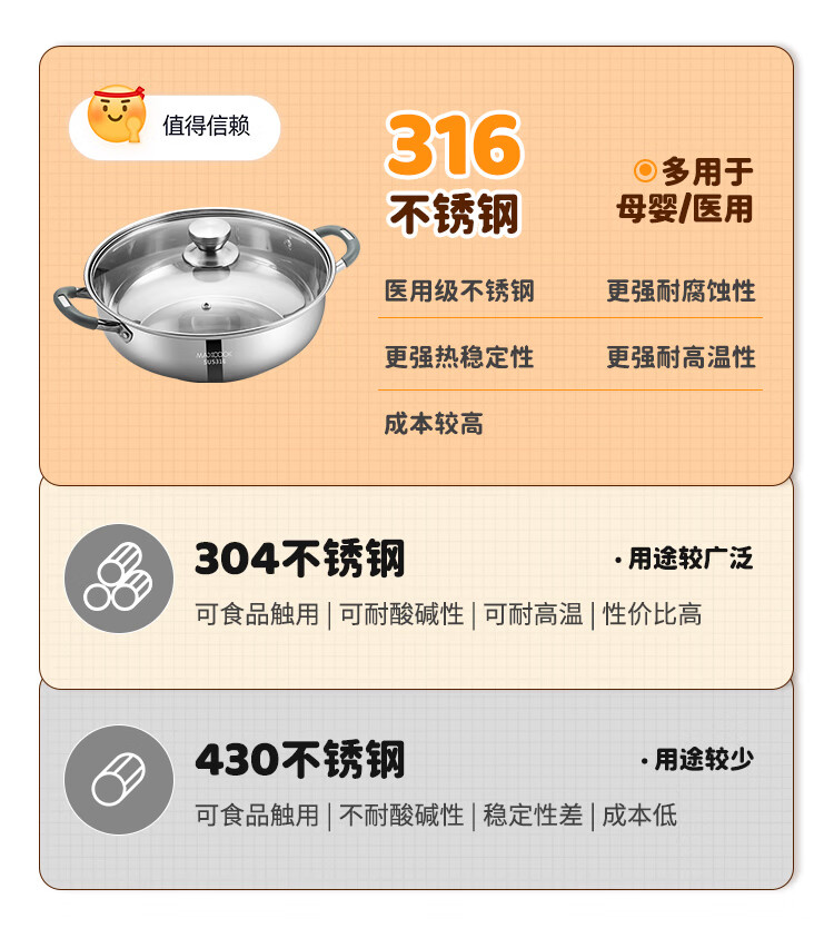 美厨(MAXCOOK)316不锈钢火锅28cm 汤锅火锅复底带盖 燃气电磁炉通用 MCT1969