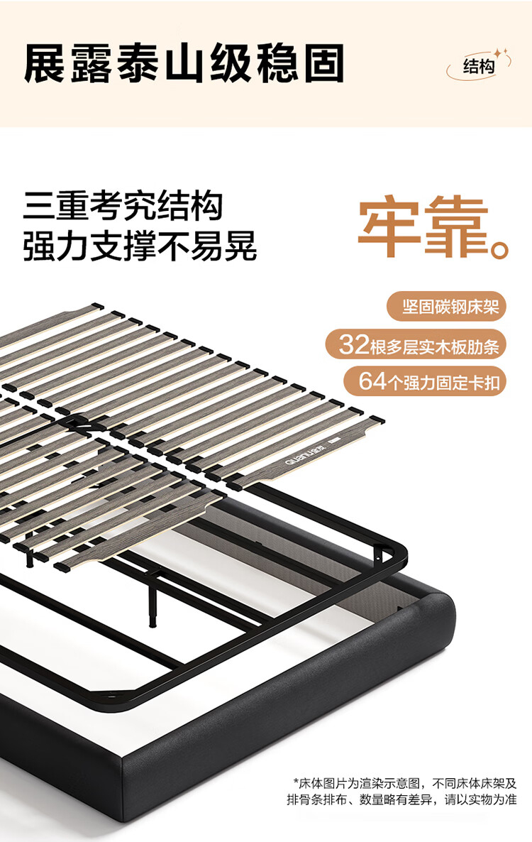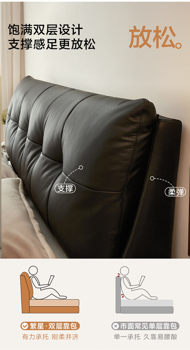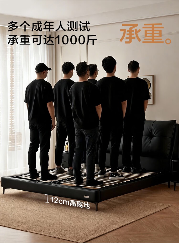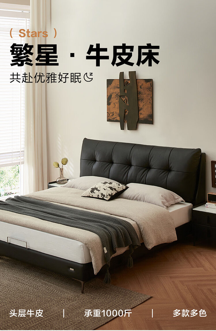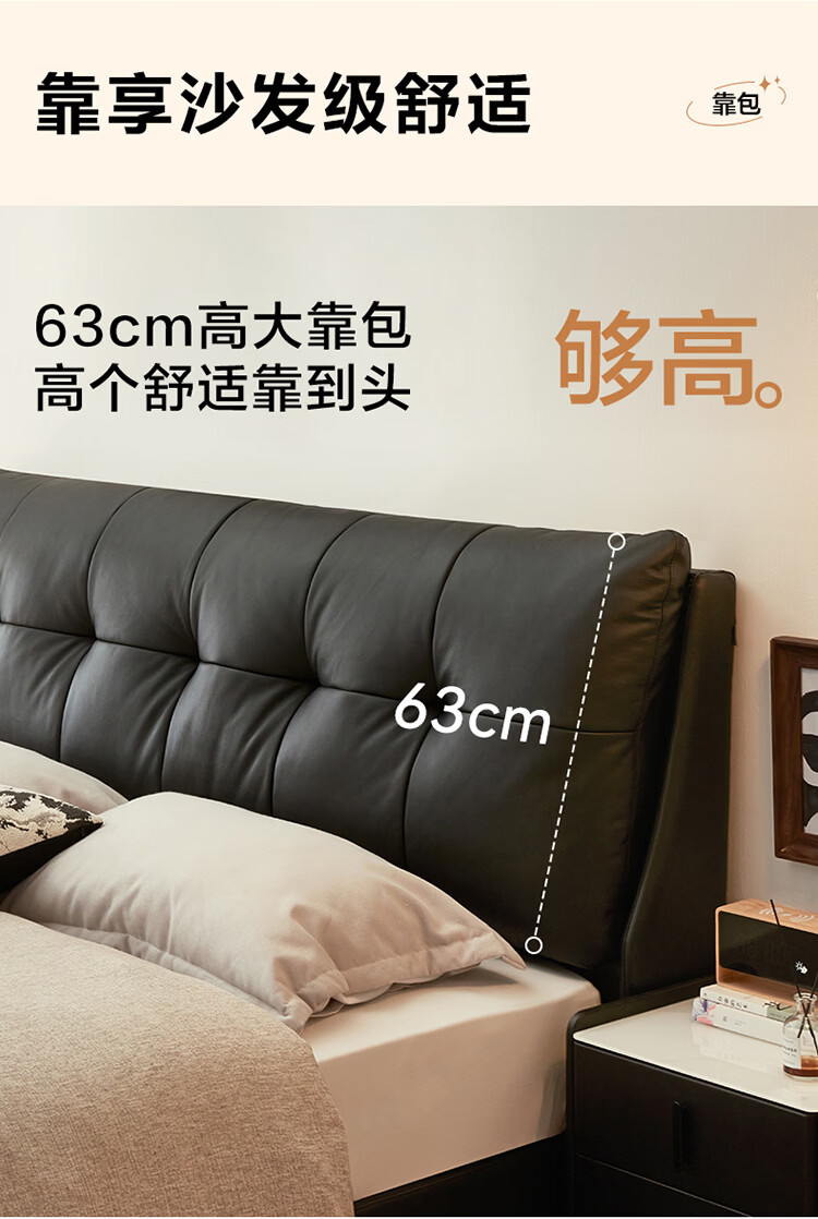CBD家居现代简约真皮软包床双人主卧大床奶油风婚床头层牛皮甜心悬浮 甜心悬浮-水墨黑单床 卷帘排骨架 1800*2000