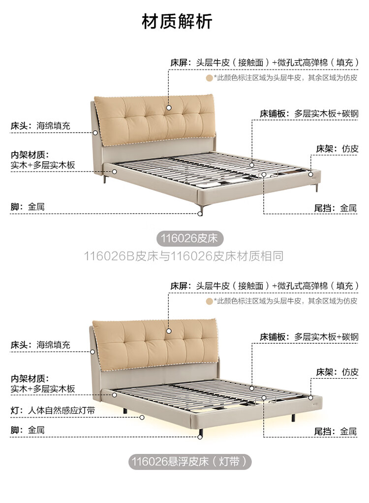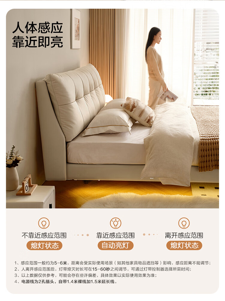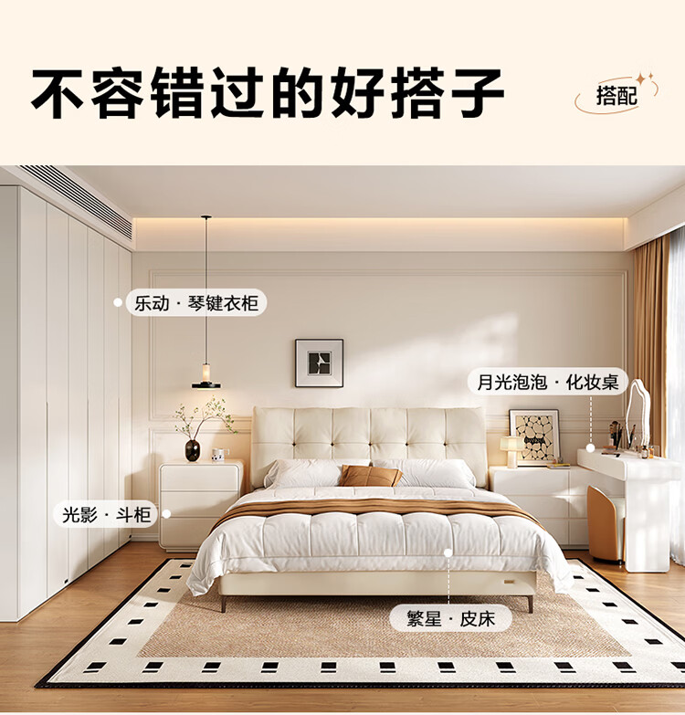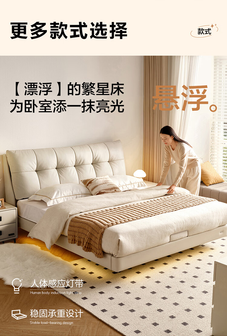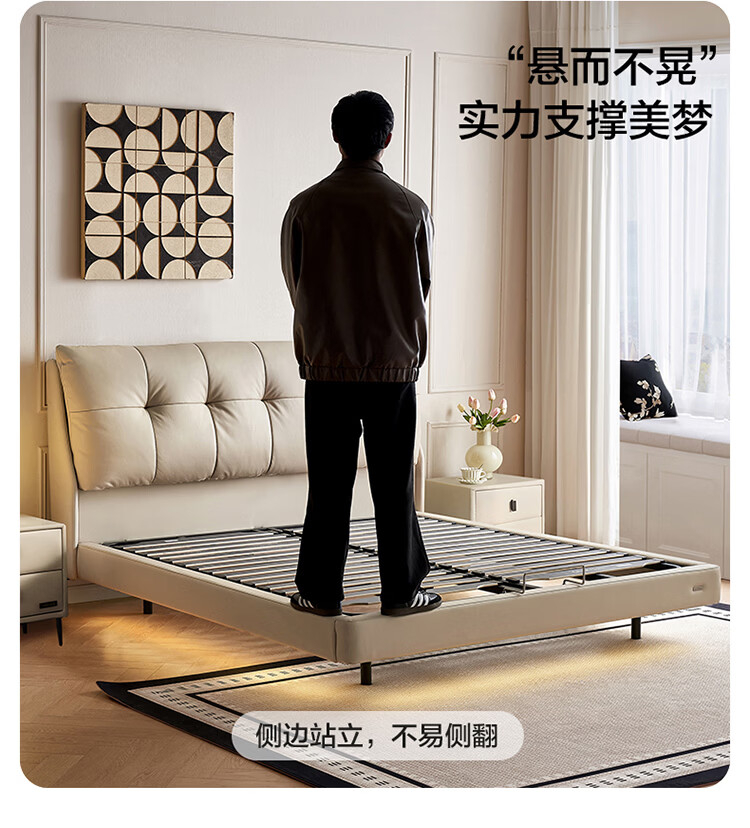 CBD家居现代简约真皮软包床双人主卧大床奶油风婚床头层牛皮甜心悬浮 甜心悬浮-奶油白单床 卷帘排骨架 1500*2000