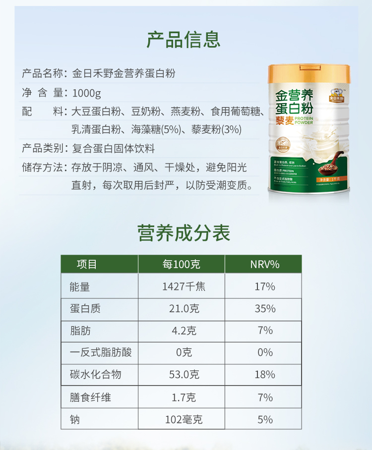 金日禾野金营养蛋白粉1000g罐装 燕麦片冲饮谷物营养早餐过年送礼营养品
