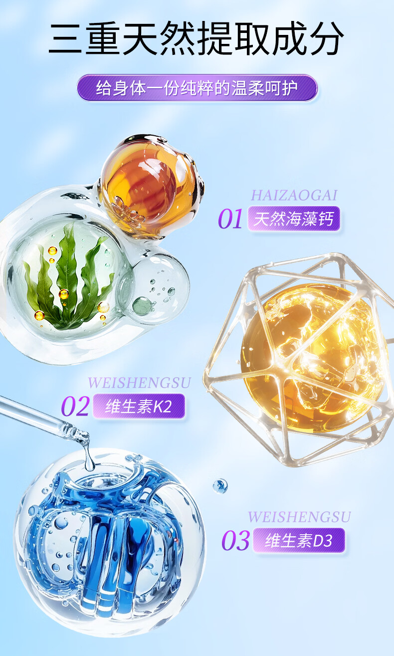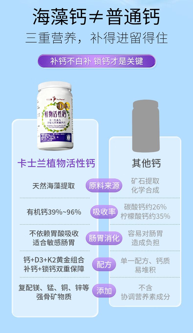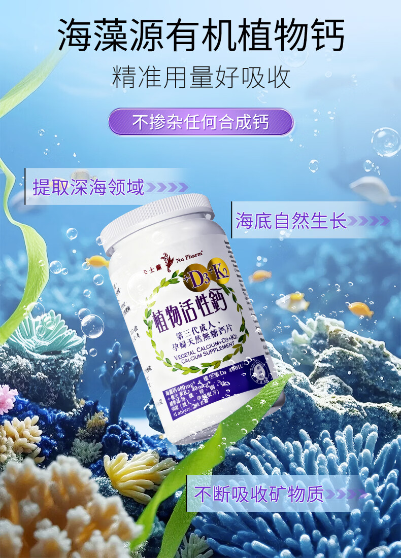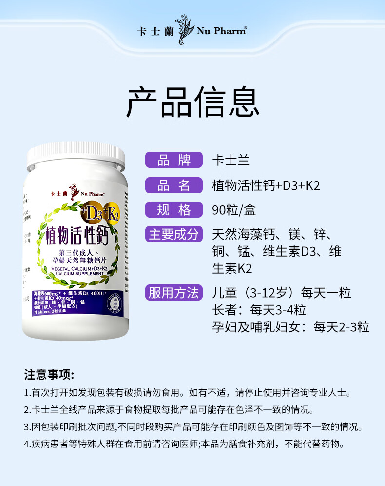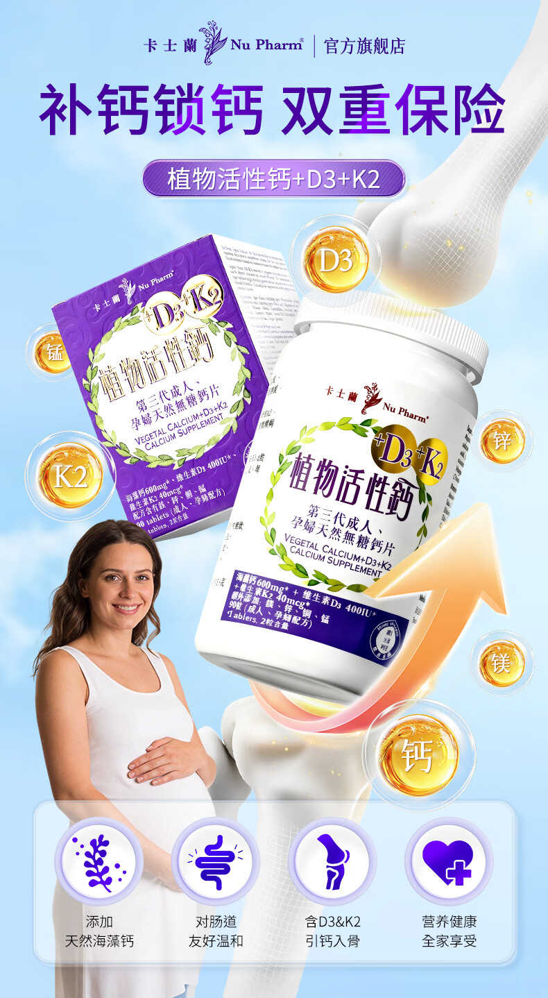 卡士蘭海藻钙维生素D3K2孕妇哺乳期成人男女性儿童补钙片中老年人腿抽筋 【周期推荐】 90粒*3瓶 【买3送1共发4瓶】