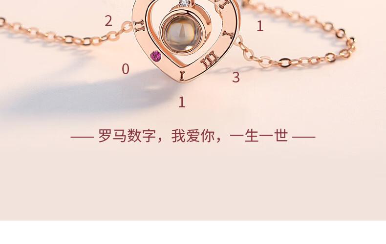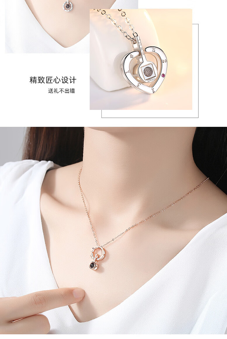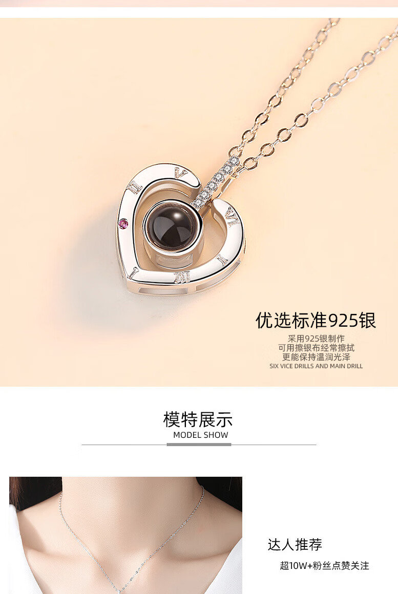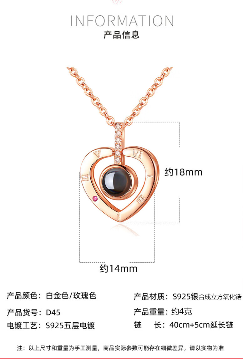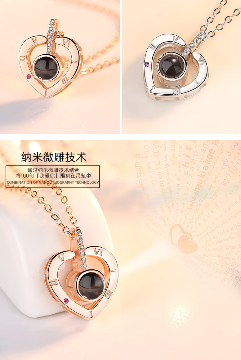 ZAVO定制投影100种语言吊坠爱的记忆纯银项链女款银饰生日送女生礼物 金色【定制版+证书+升降玫瑰礼盒】下单备注或联系客_