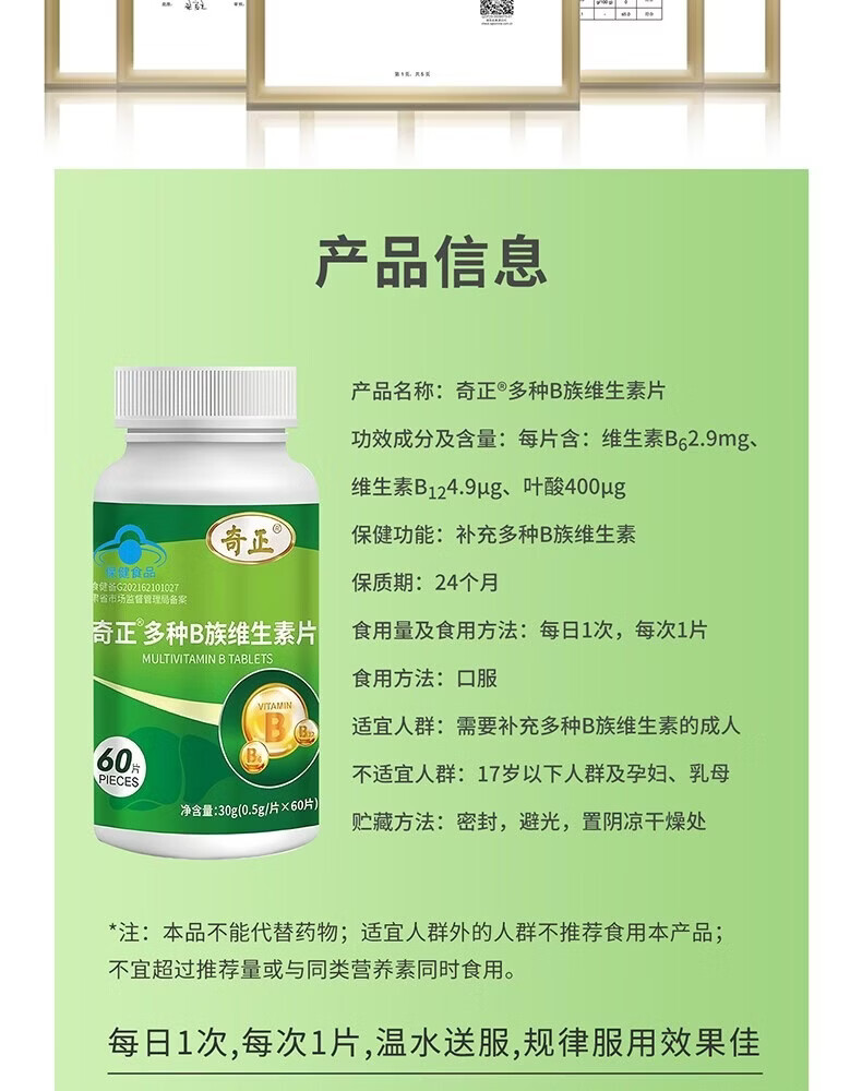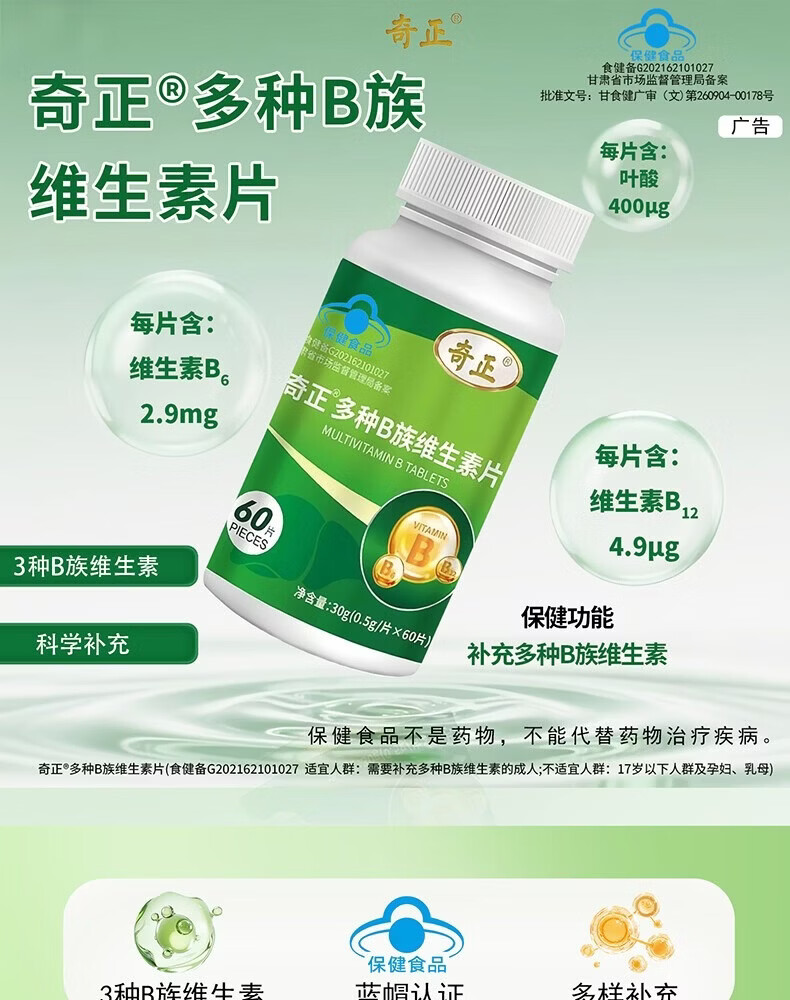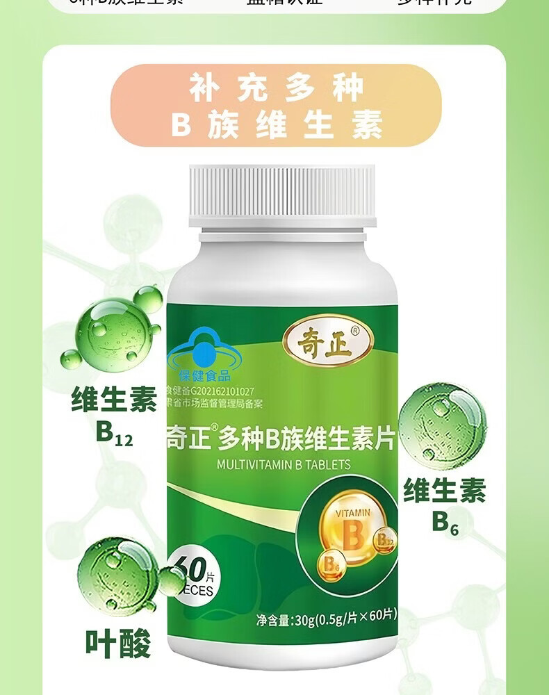 奇正维生素b族片多种维生素b6b12叶酸补充多种B族维生素 60片*3瓶