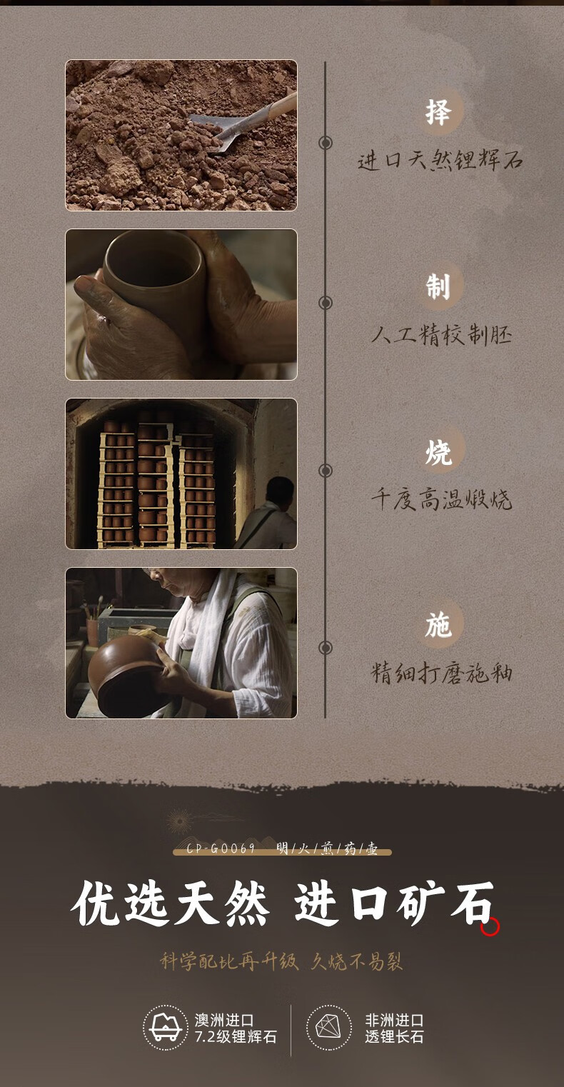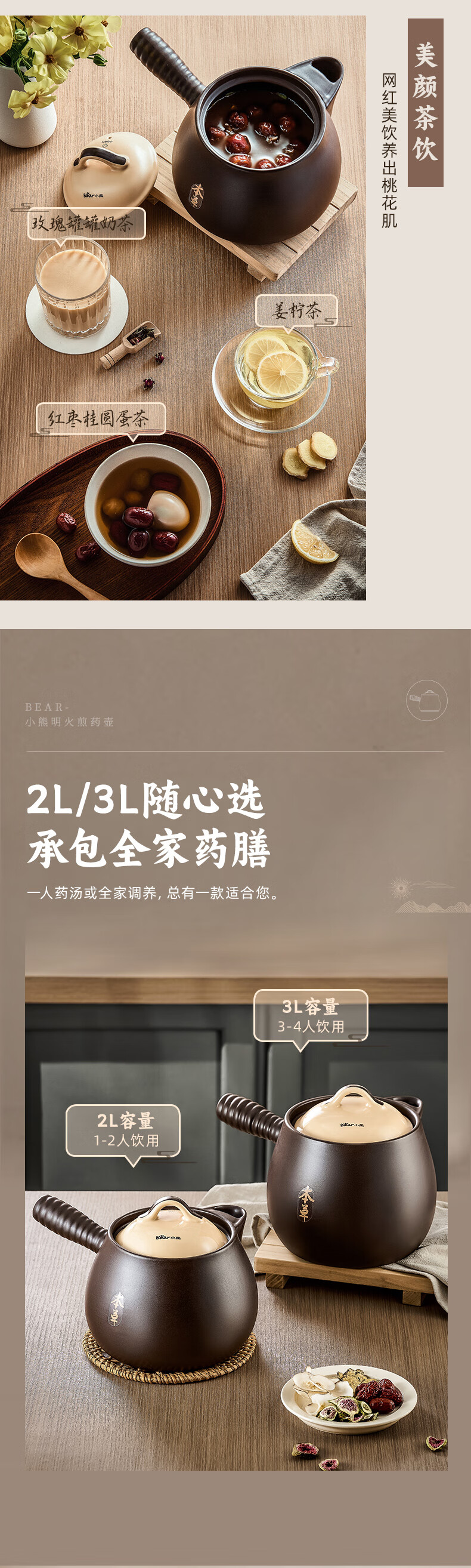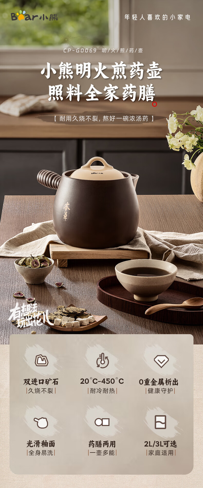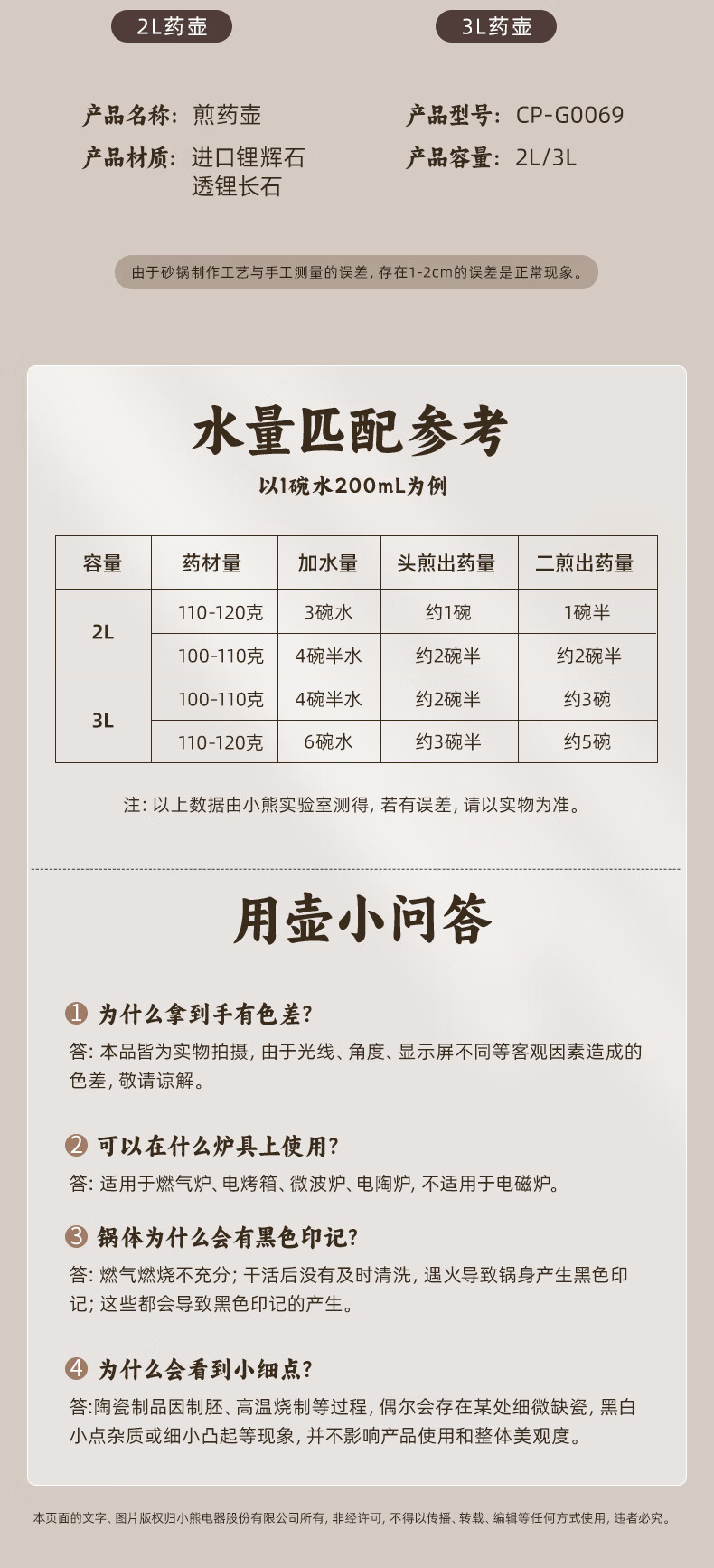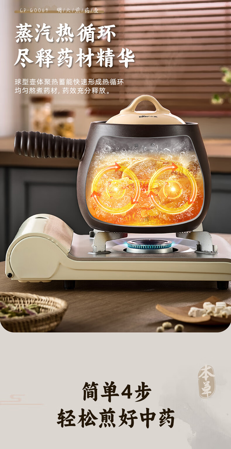 小熊(Bear)中药砂锅 耐高温中药锅煎药壶3L燃气灶熬药陶瓷锅中药罐G0069-P02