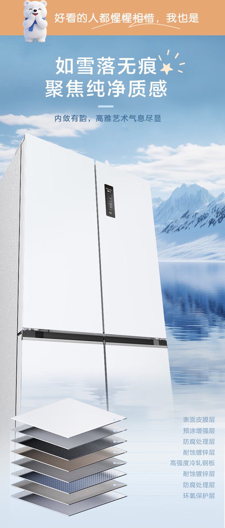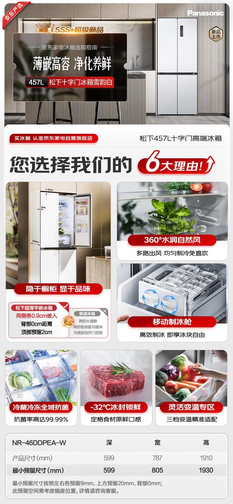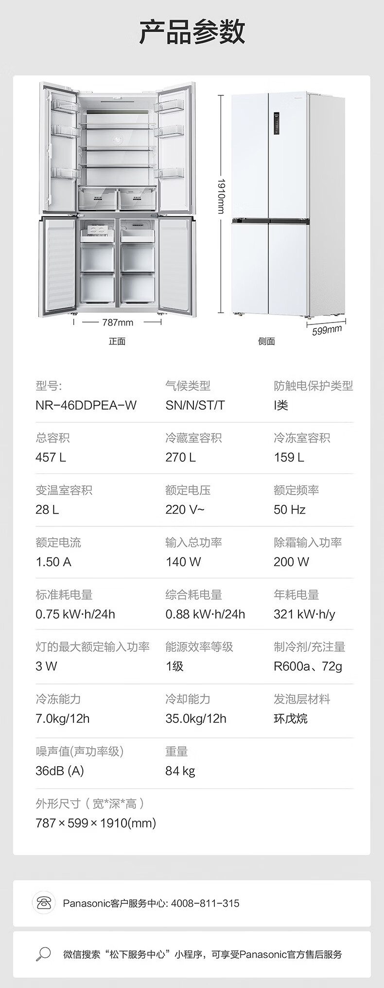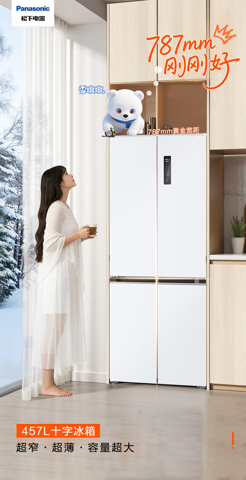 松下(Panasonic)雪墩墩457L十字门冰箱超薄嵌入制冰银离子净味三挡变温一级能效风冷月光白NR-46DDPEA-W以旧换新 【雪墩墩】小户型大容量
