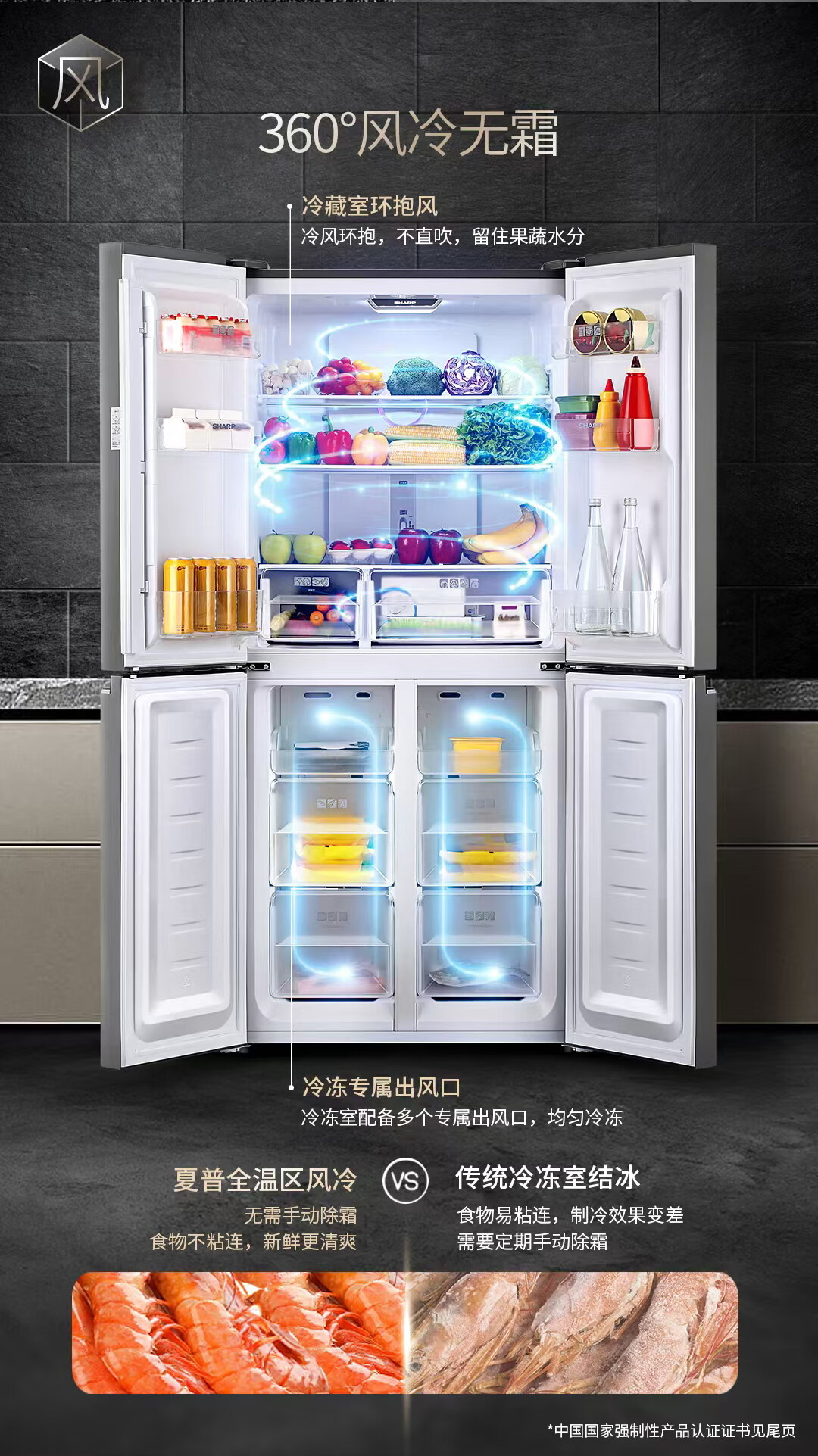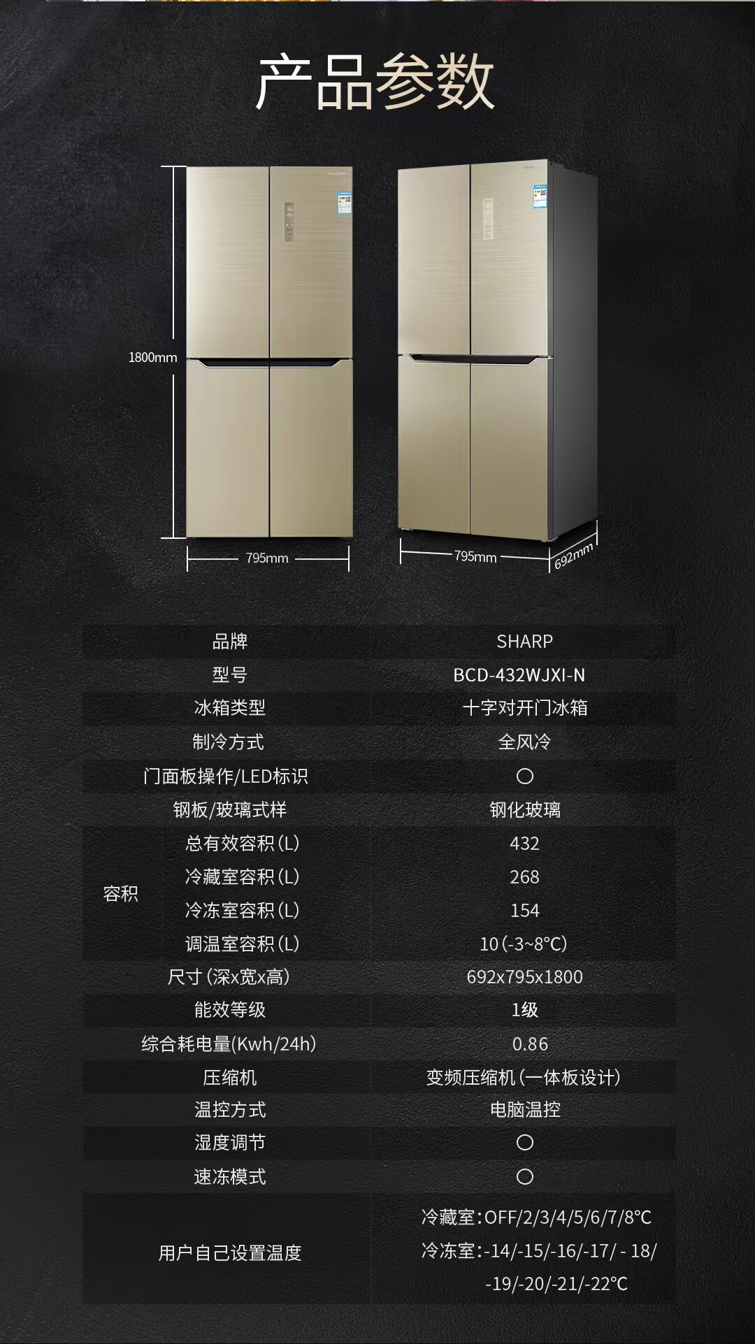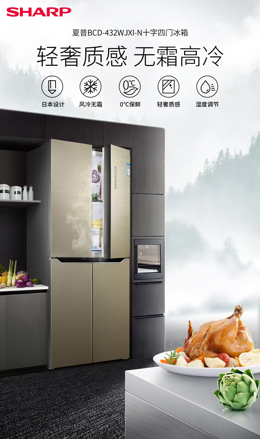 夏普 十字四门冰箱 432L 日本设计 风冷无霜 冷冻室六分区 智能恒温 家用节能保鲜BCD-432WJXI-N