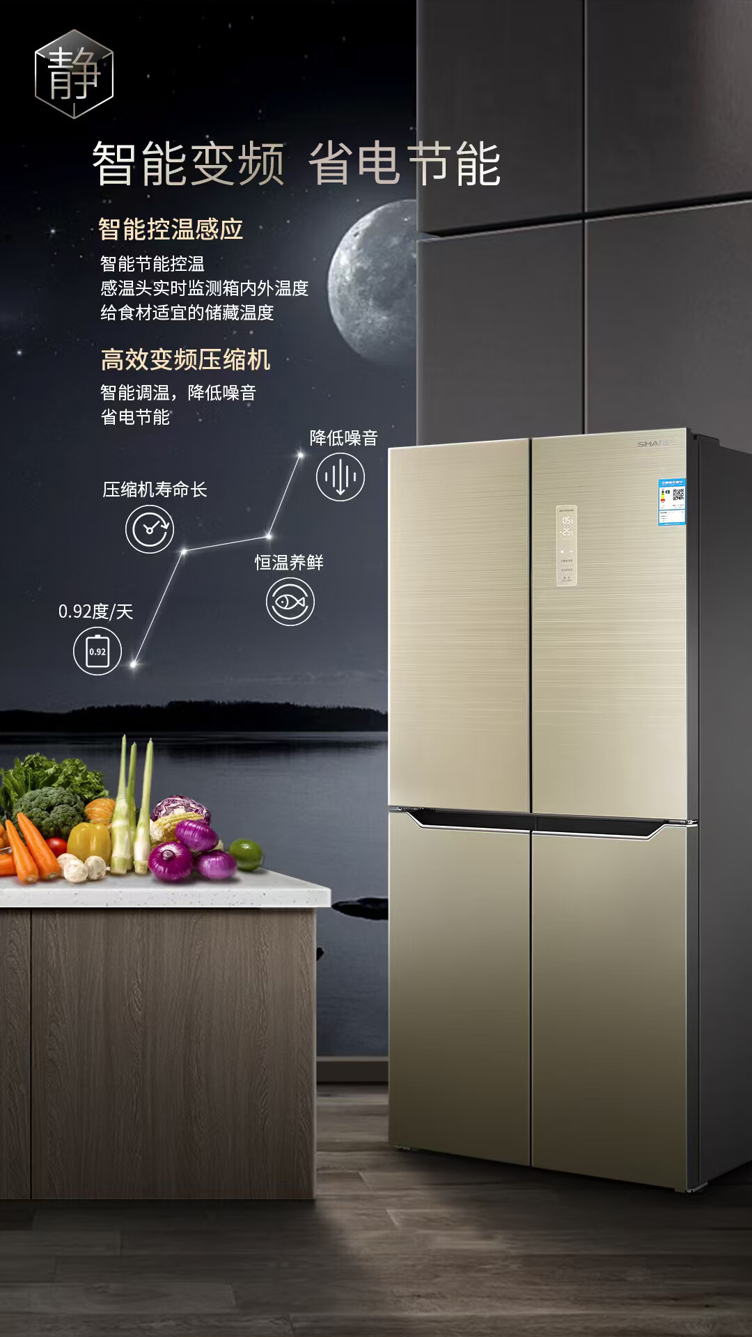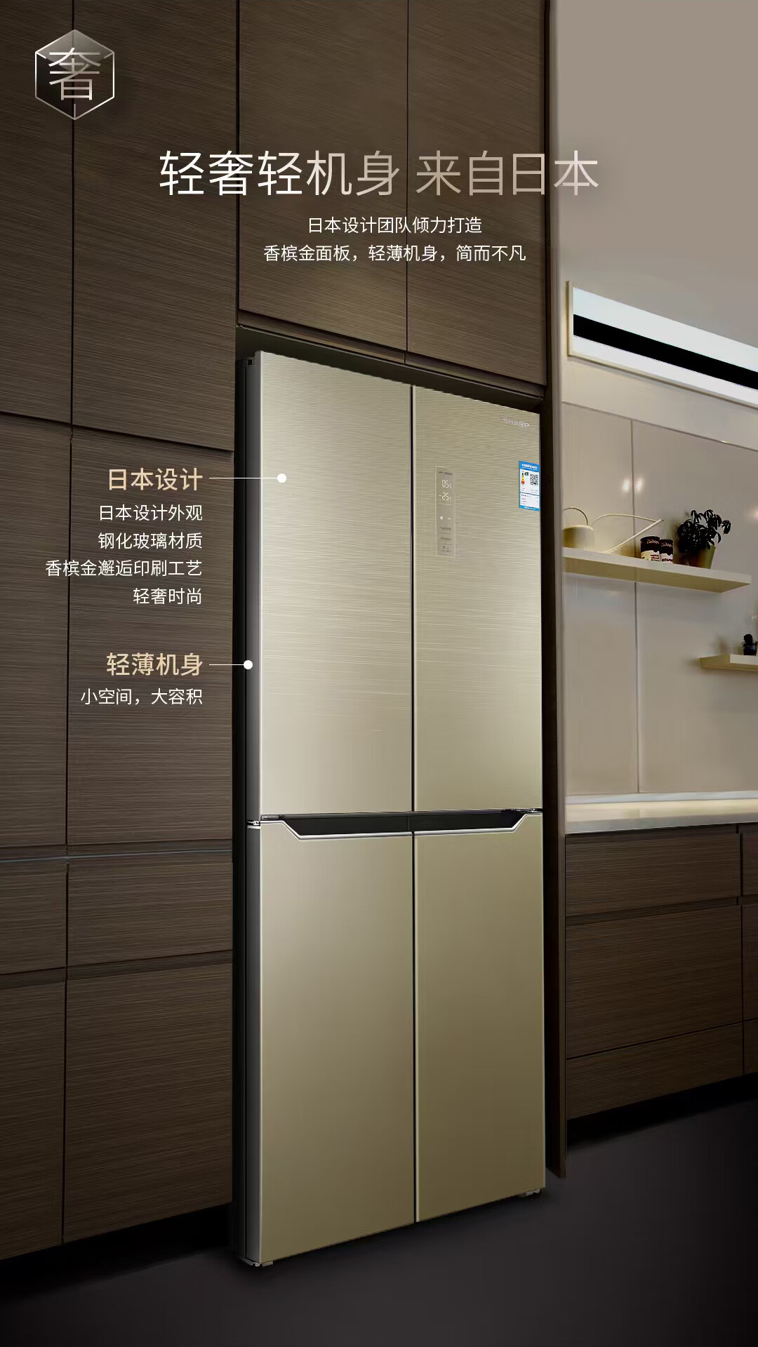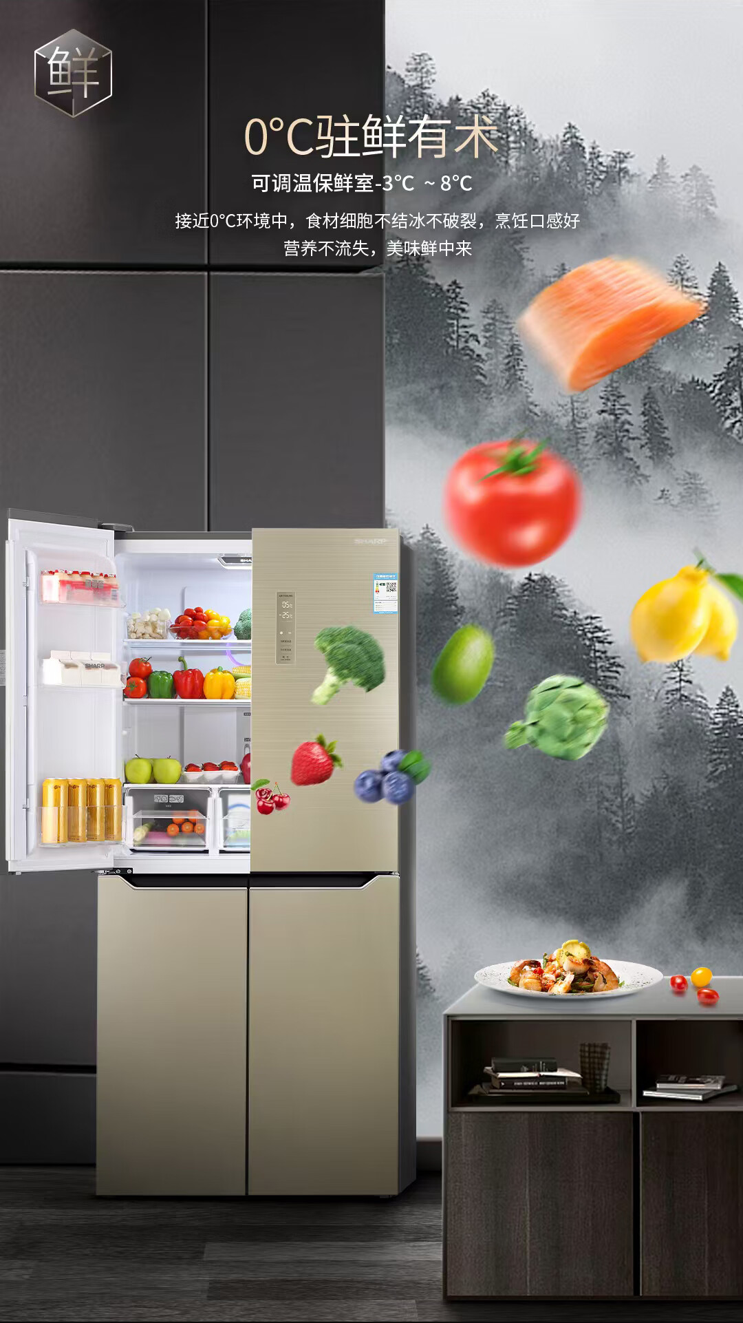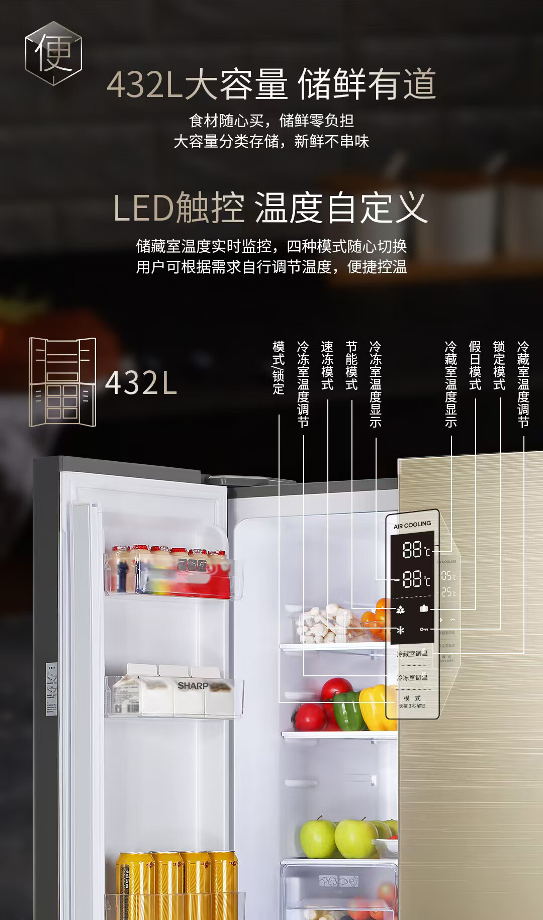 夏普 十字四门冰箱 432L 日本设计 风冷无霜 冷冻室六分区 智能恒温 家用节能保鲜BCD-432WJXI-N