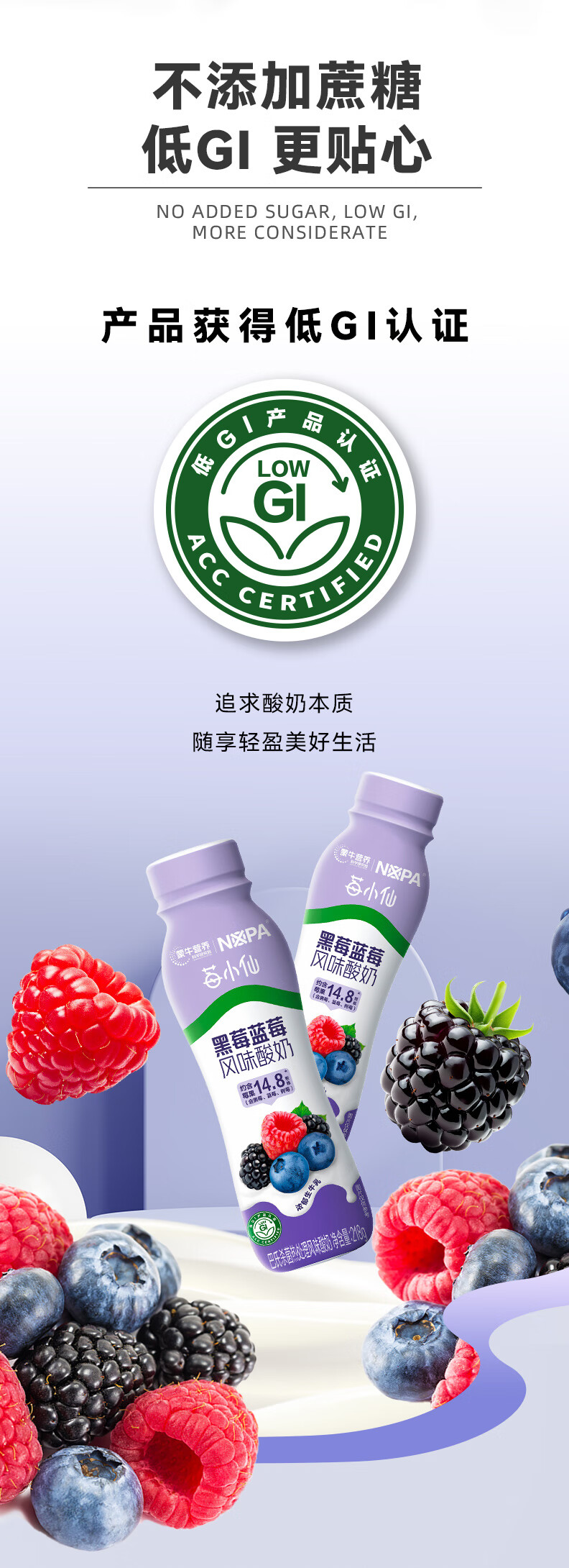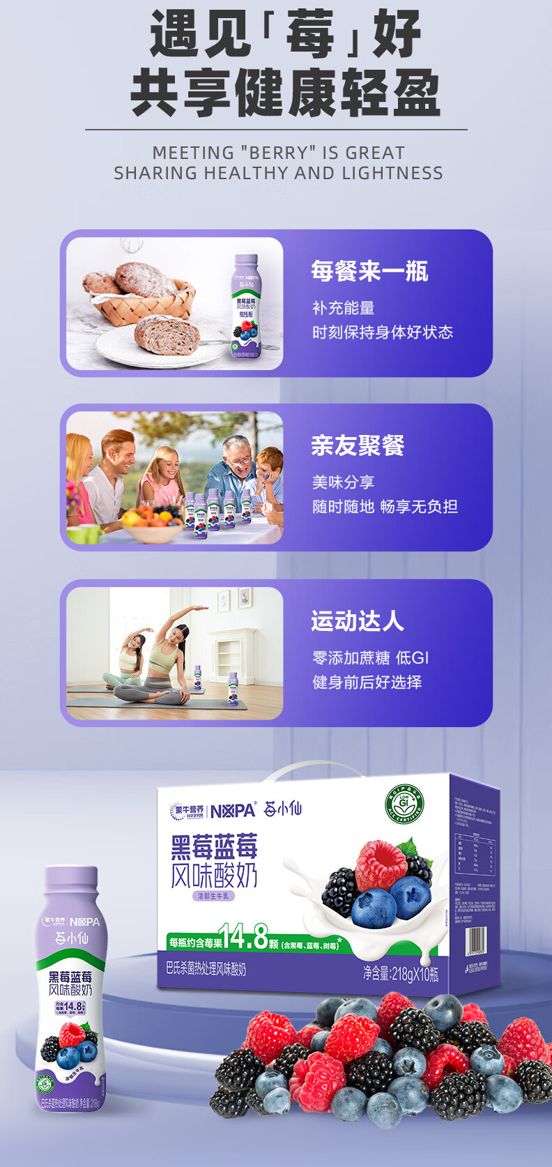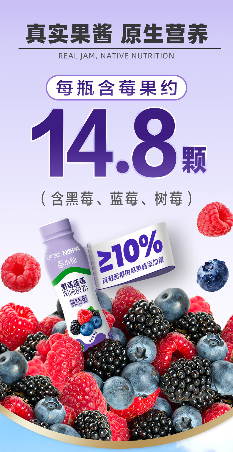蒙牛【保质期5月8号到期】NOPA黑莓蓝莓风味酸奶低GI218g*10瓶礼盒装