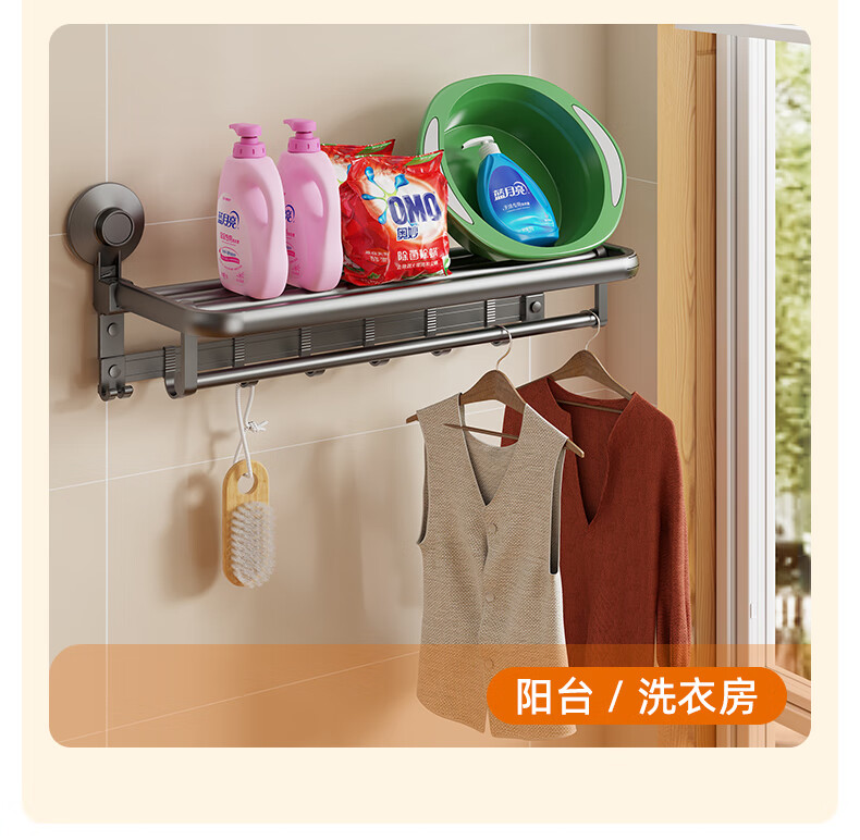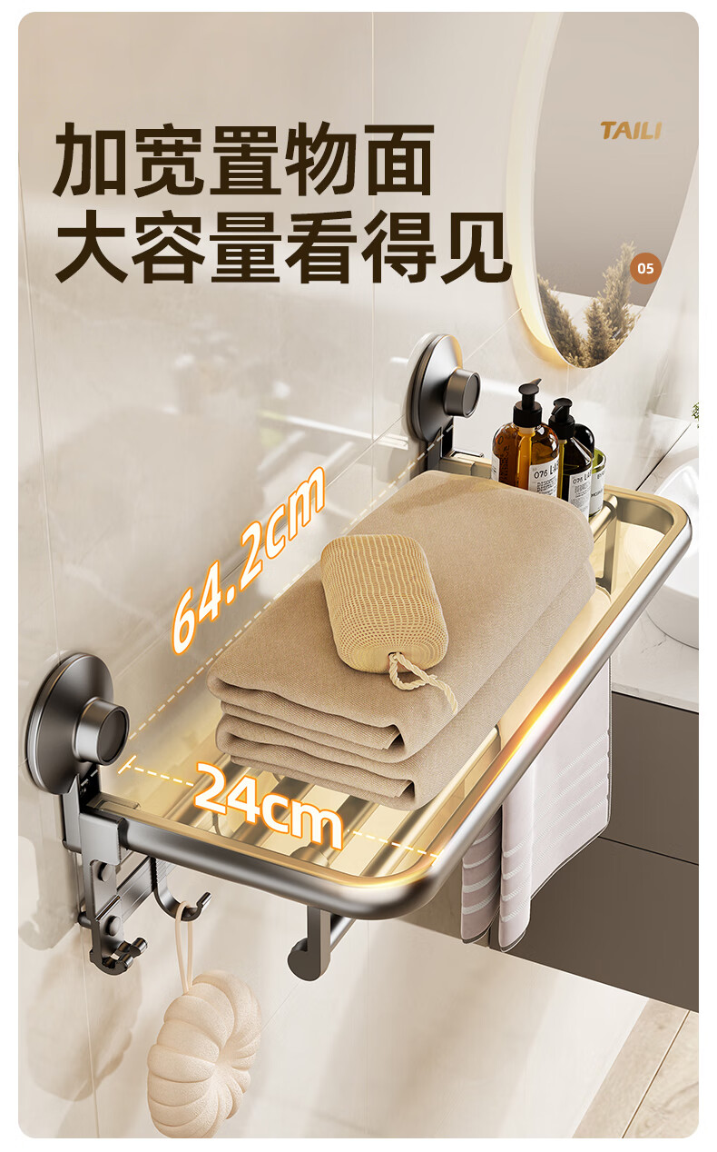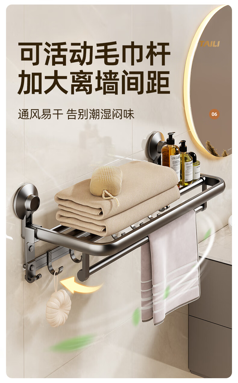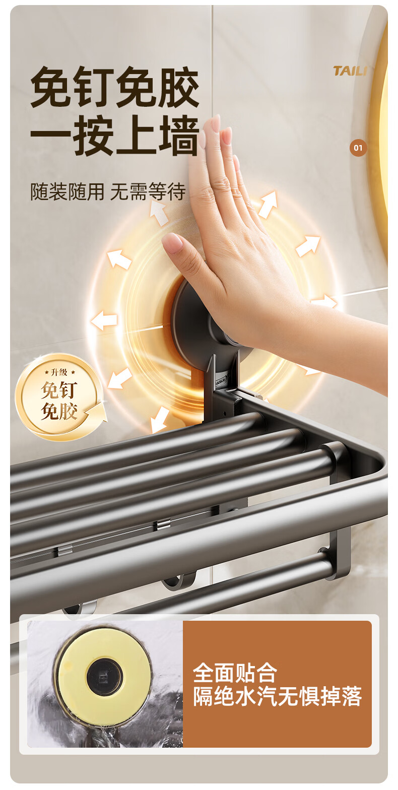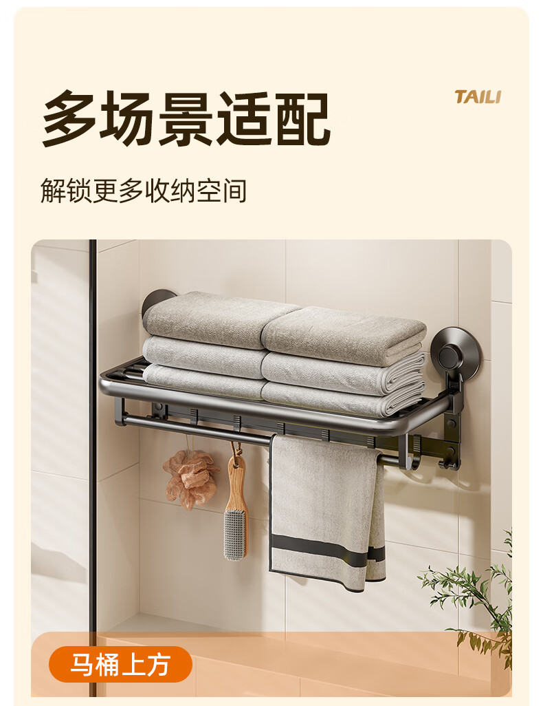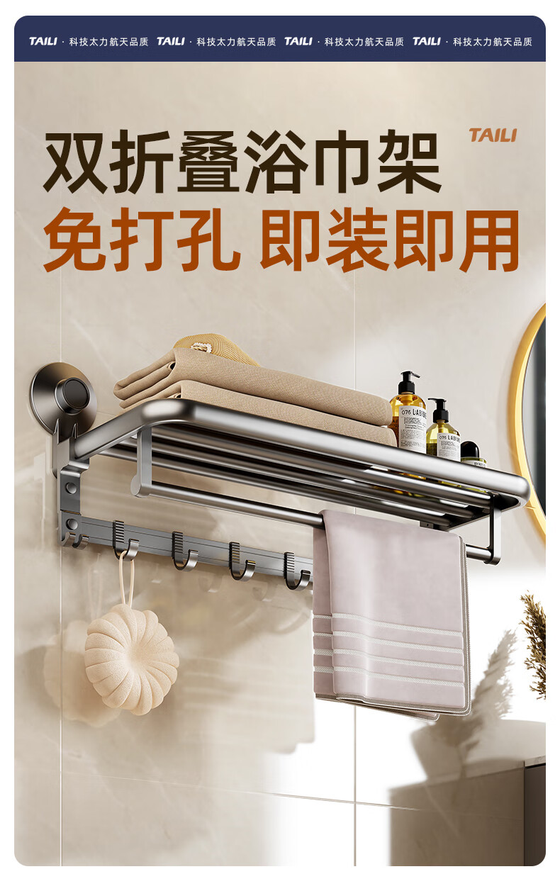 太力吸盘卫生间置物架毛巾架浴室厕所壁挂毛巾杆太空铝免打孔浴巾架