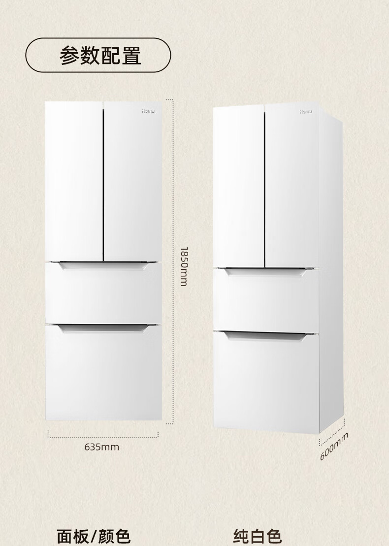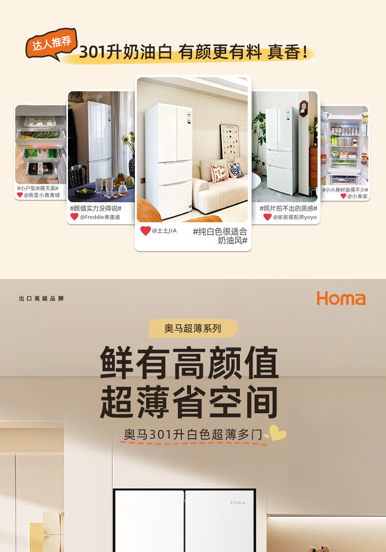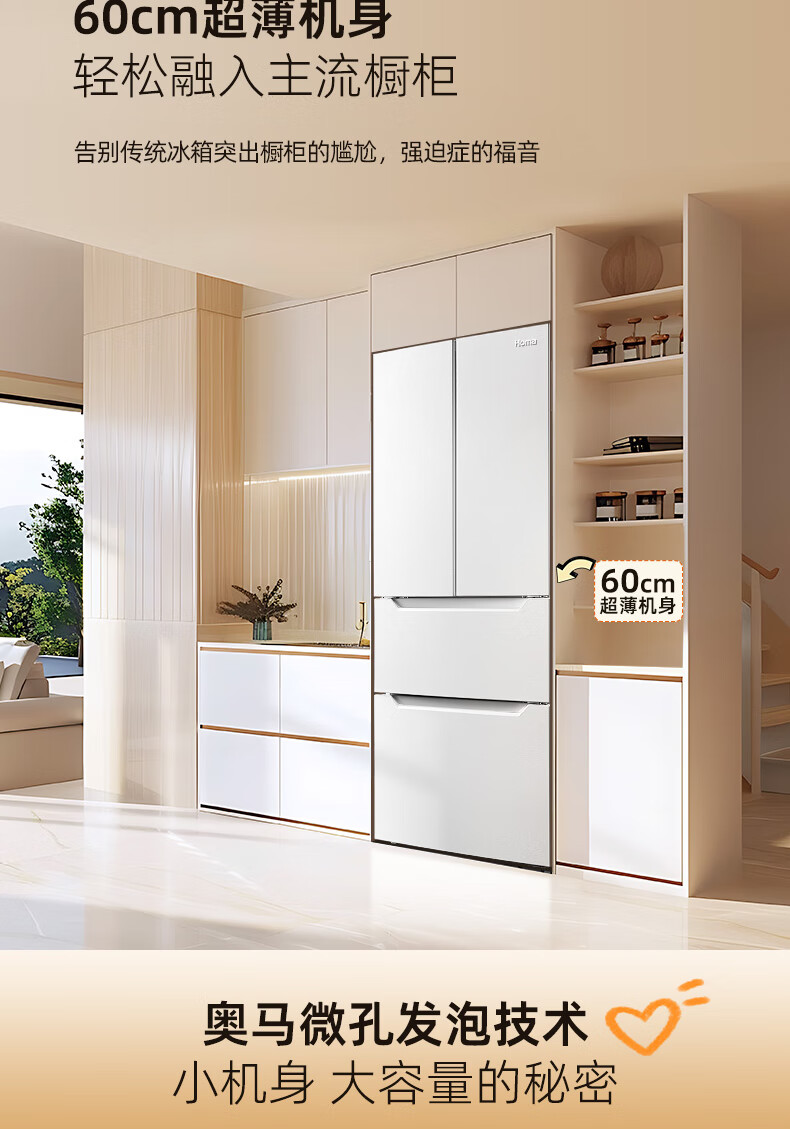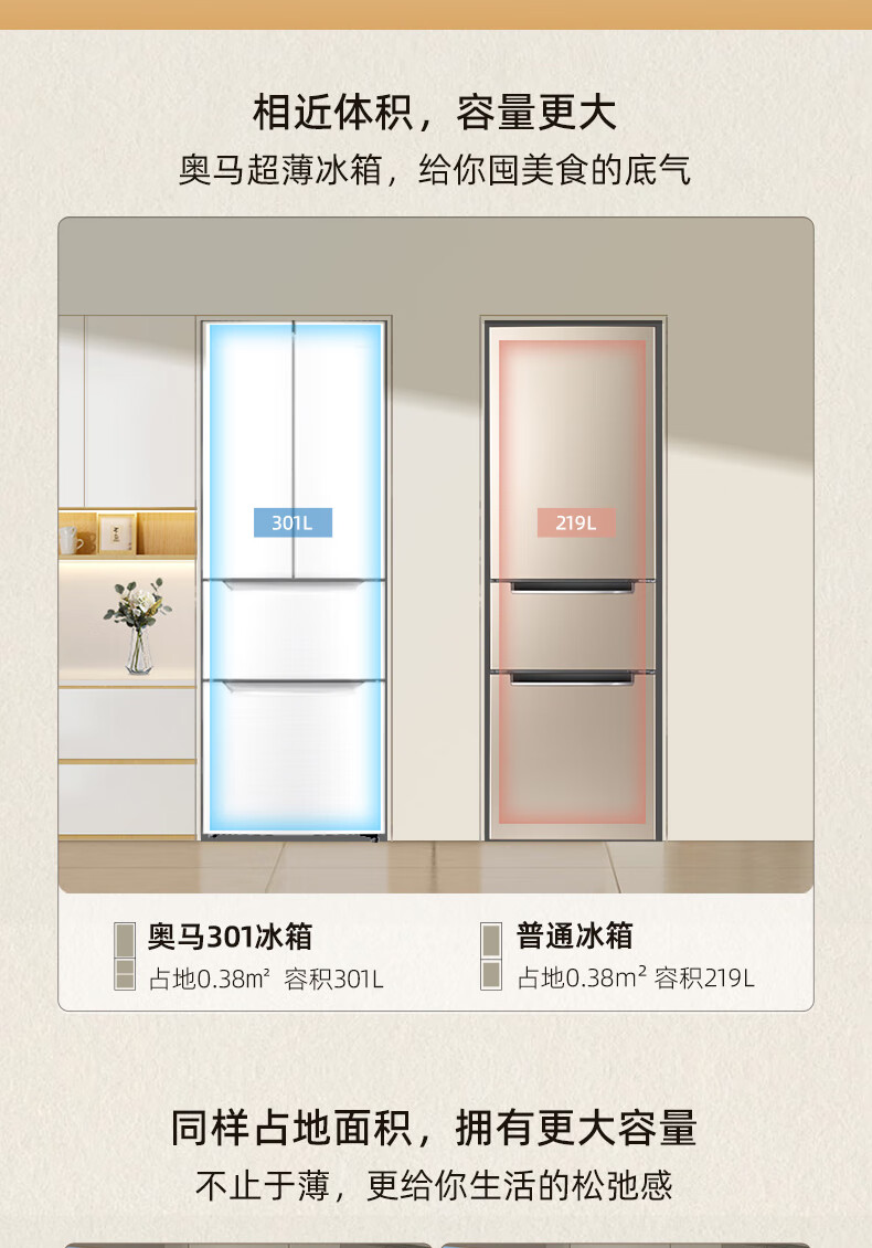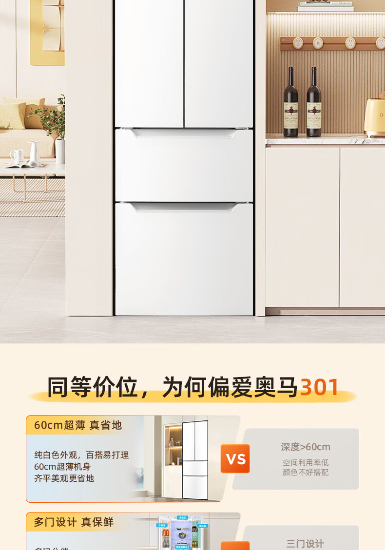 奥马(Homa)60cm超薄301升法式多门小型家用电冰箱一级能效变频风冷无霜四开门301WF/B国家补贴