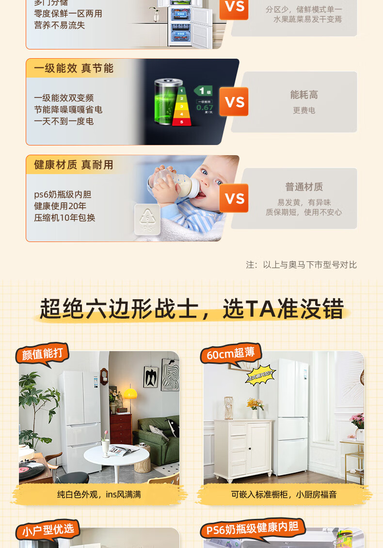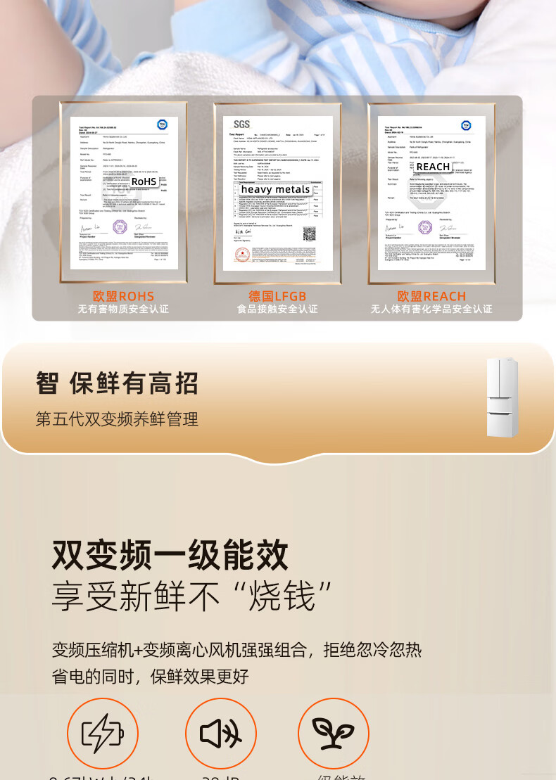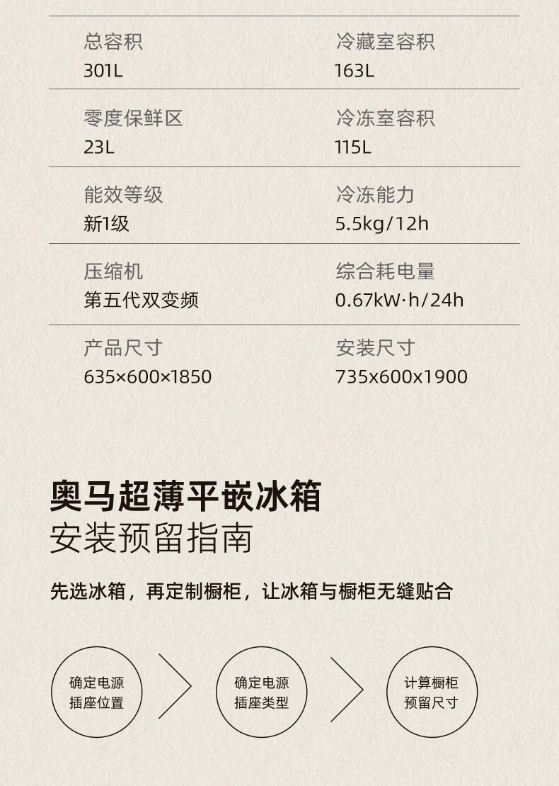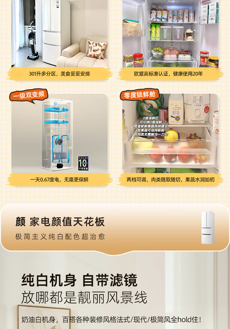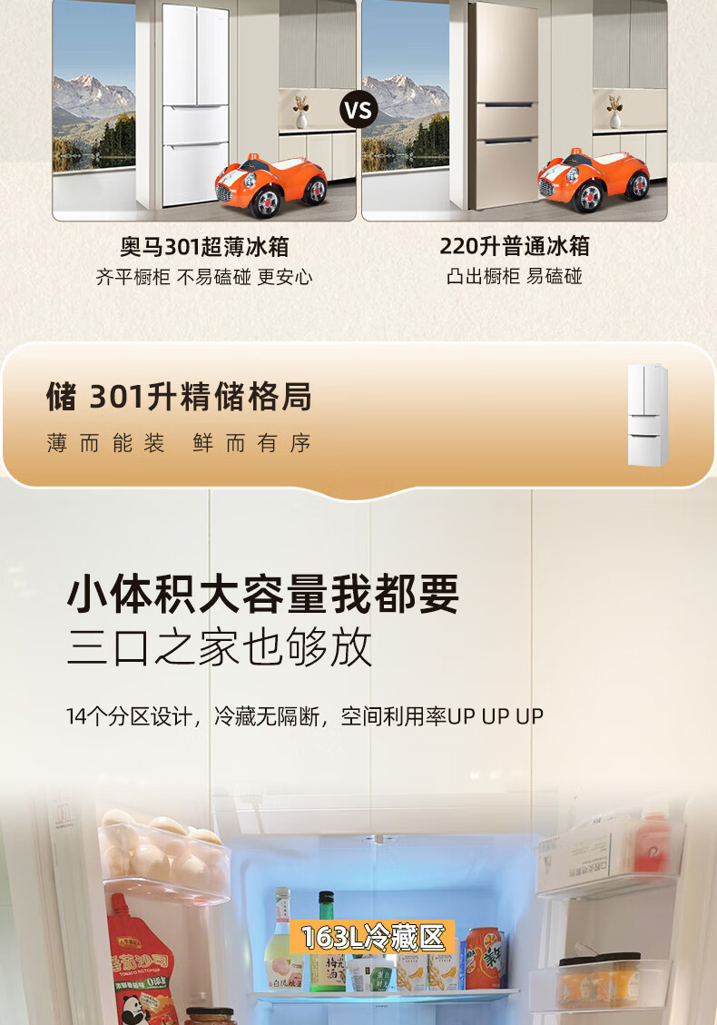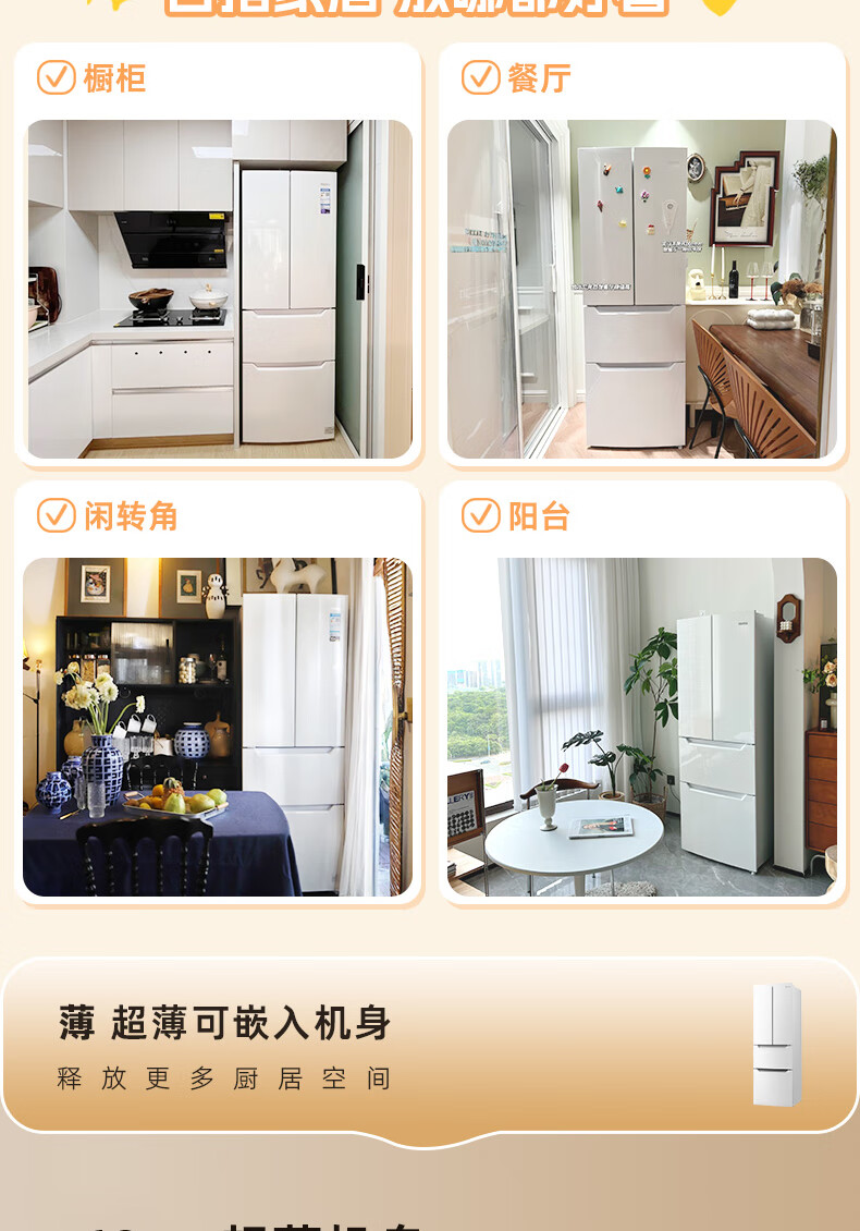 奥马(Homa)60cm超薄301升法式多门小型家用电冰箱一级能效变频风冷无霜四开门301WF/B国家补贴
