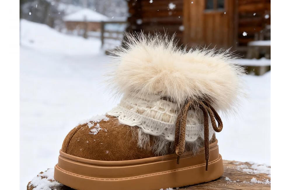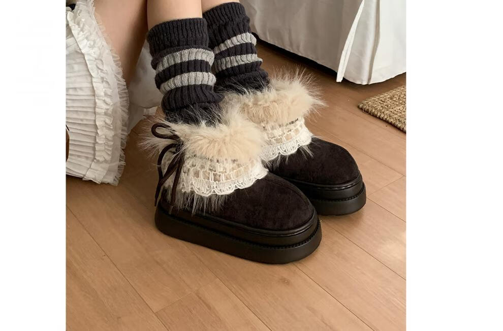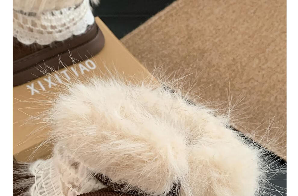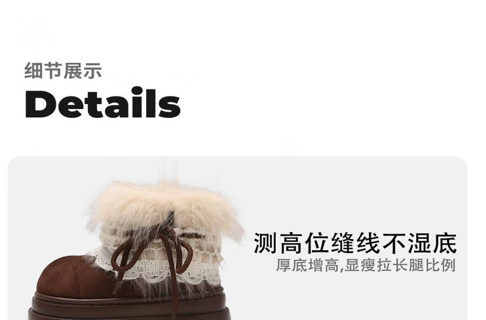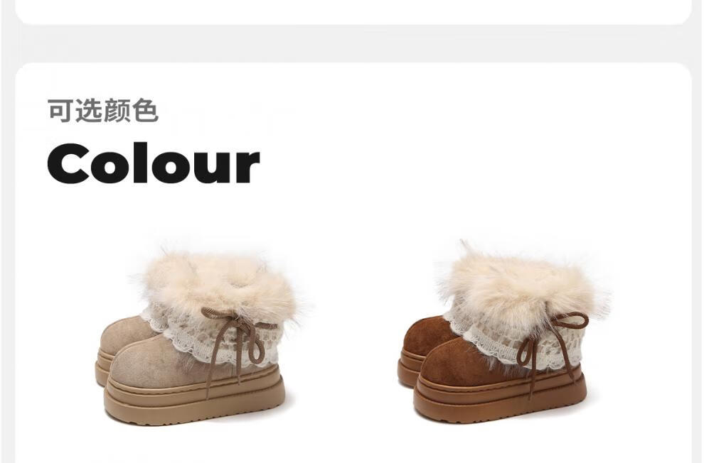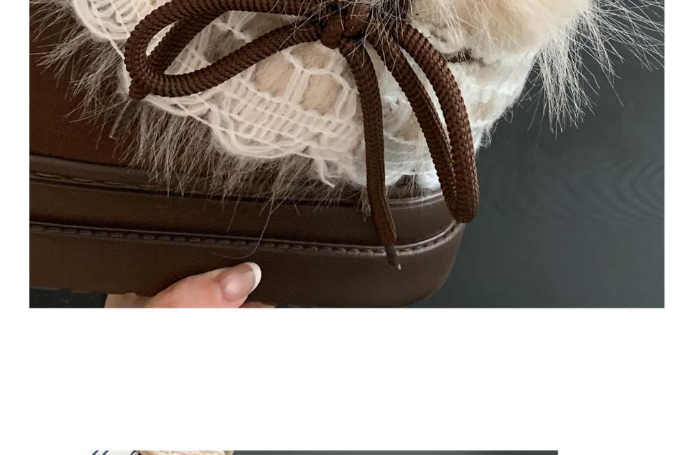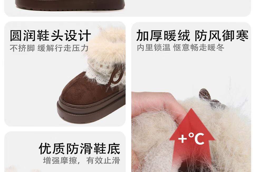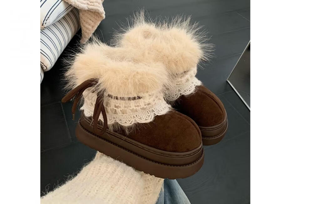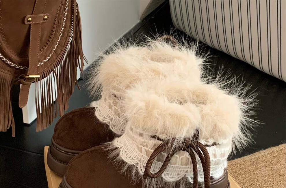 稻草人(MEXICAN)冬季舒适女士ins风毛毛雪地靴增高厚底加绒防滑费尔岛短靴子棉鞋 深棕色【系带毛毛蝴蝶结】 38 -39【标准码】