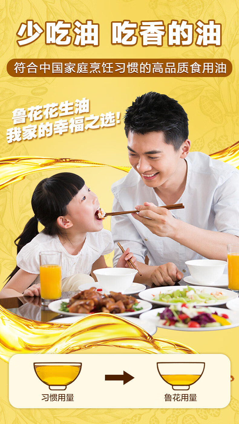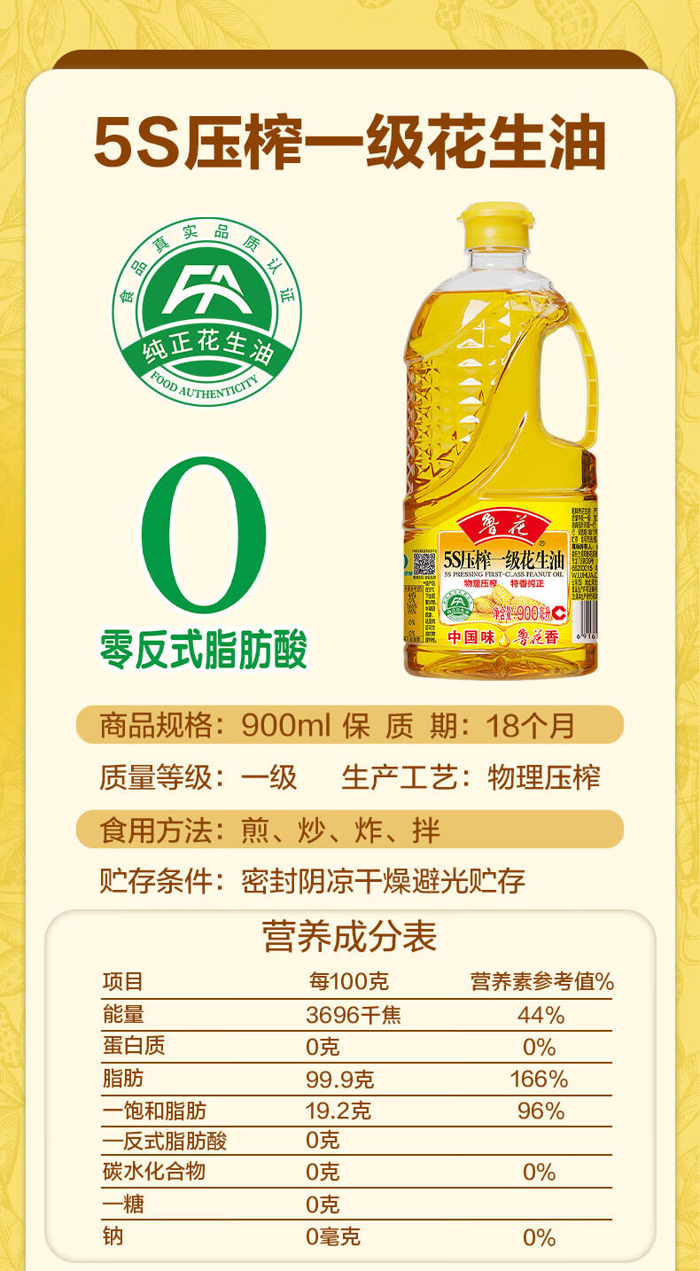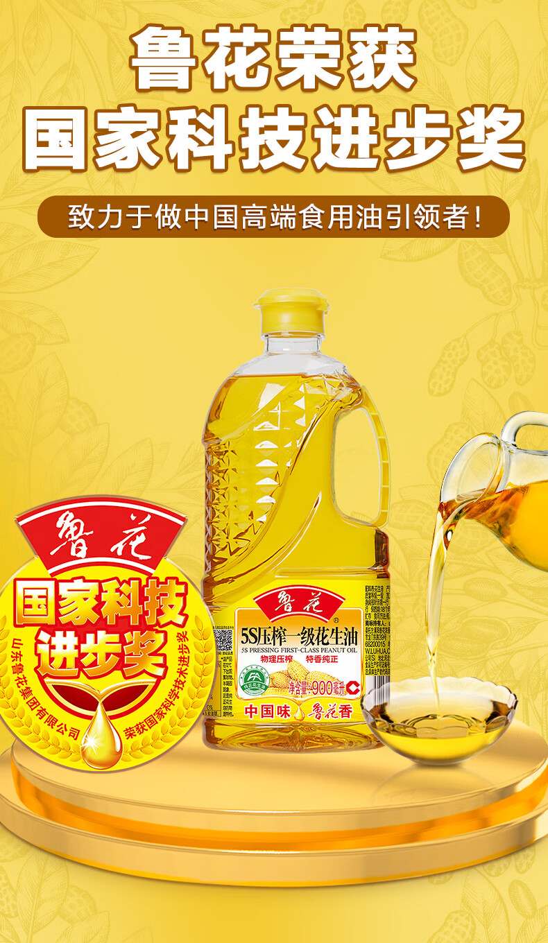 鲁花 【保真花生油】食用油 5S物理压榨 压榨一级花生油900ml 小包装