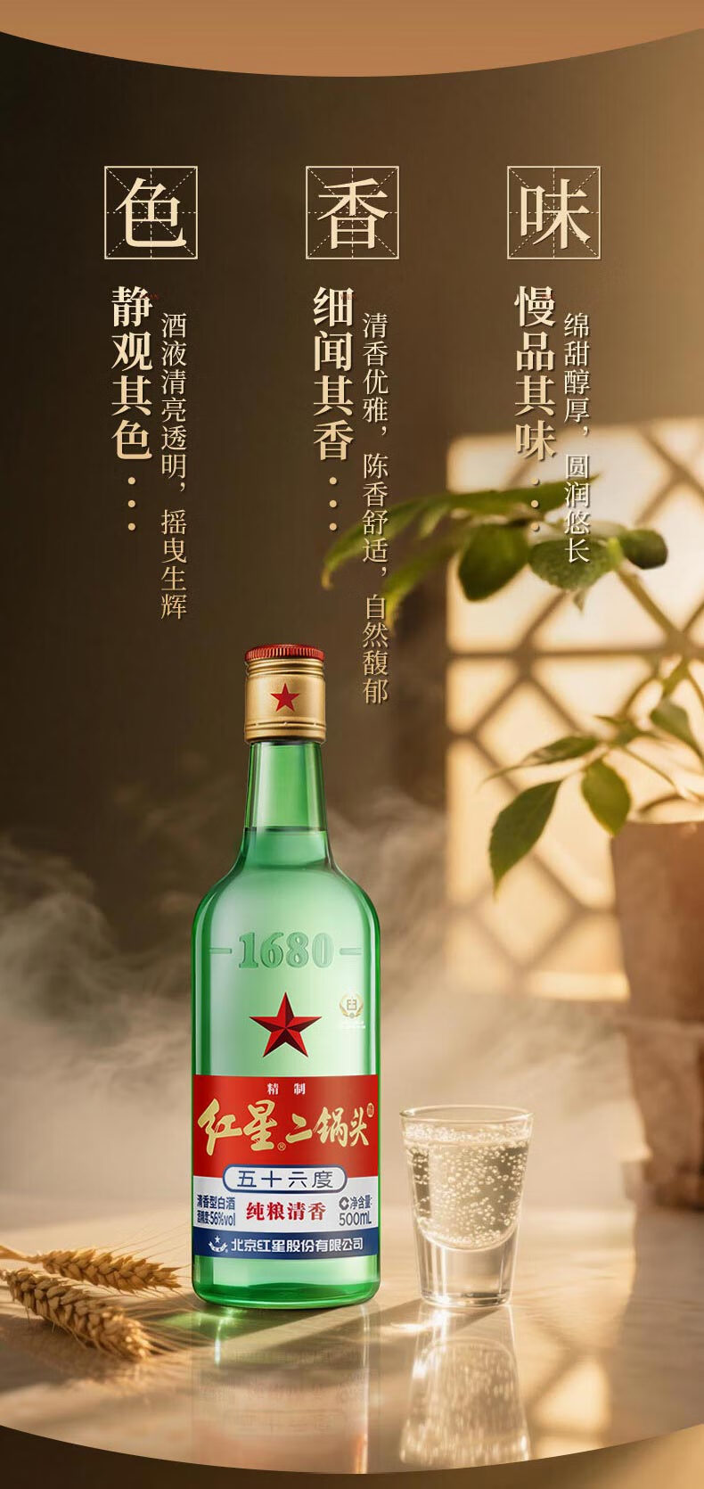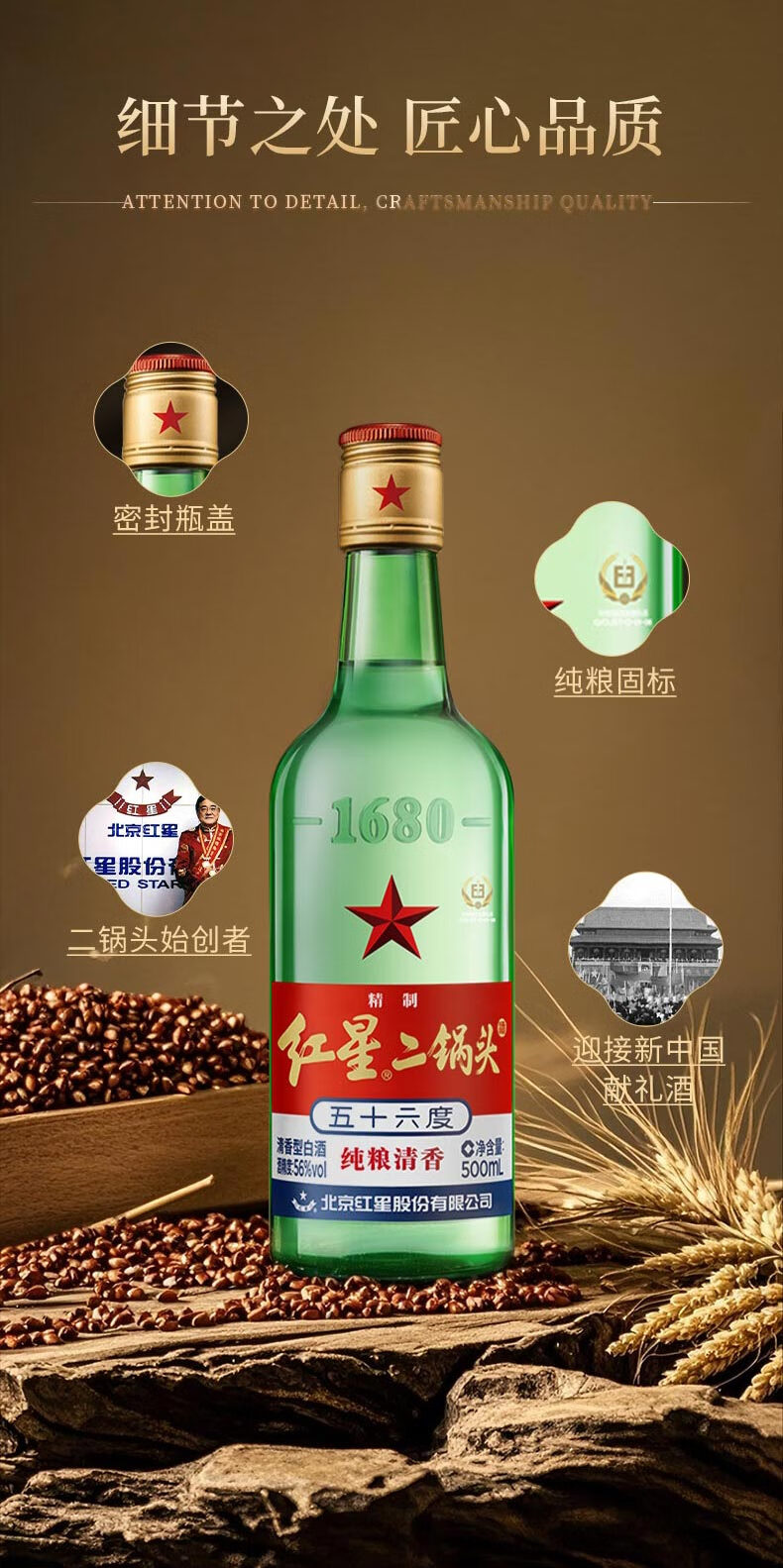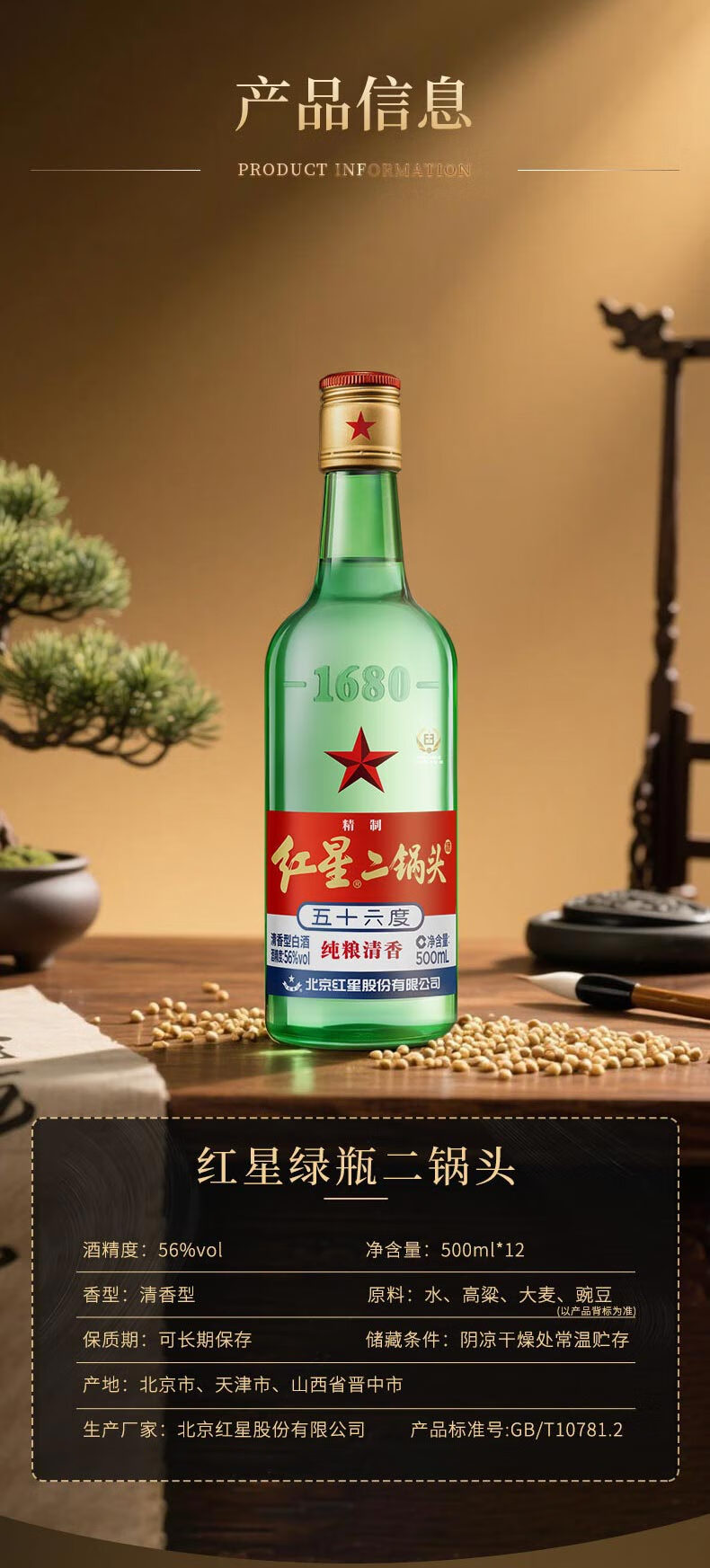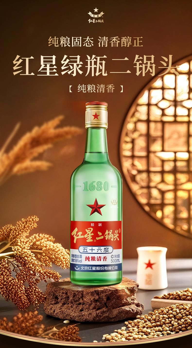 红星二锅头 大二 清香型白酒 56度 500ml*12瓶 整箱装 纯粮口粮酒