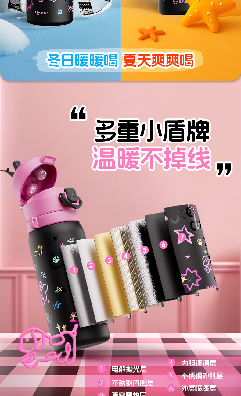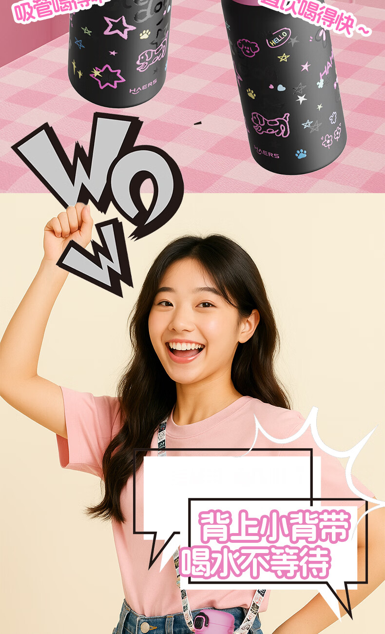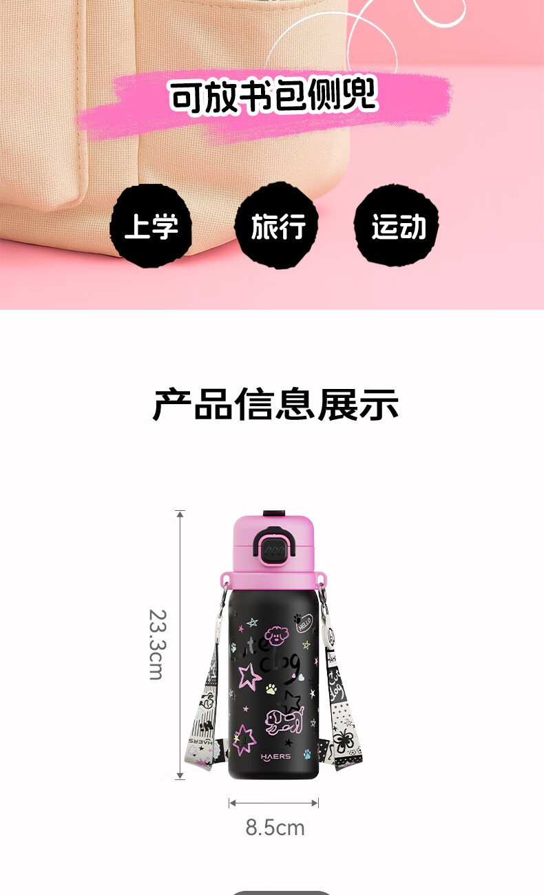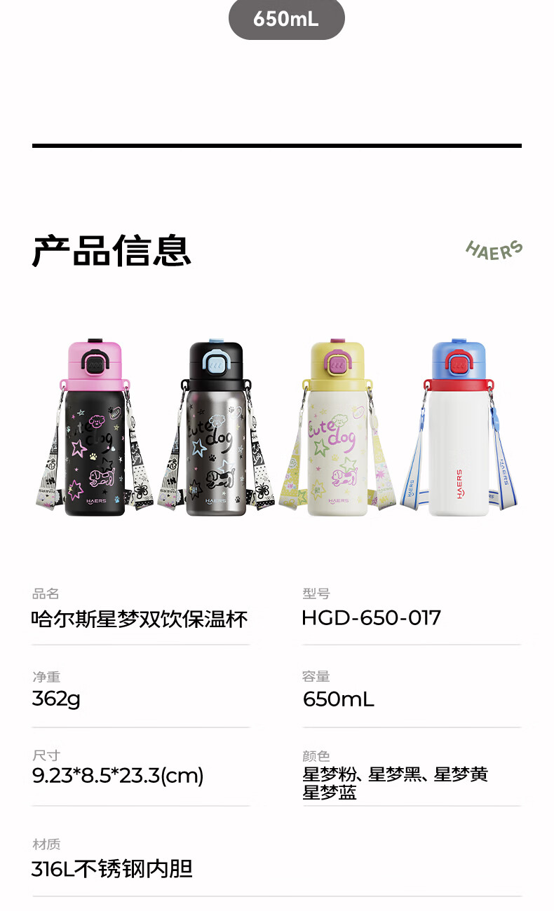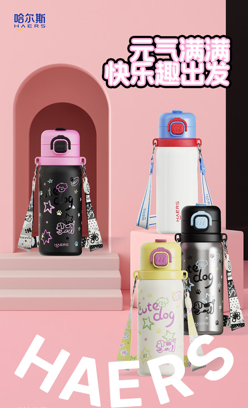 哈尔斯(HAERS)保温杯儿童吸管杯直饮双饮316L大容量学生水杯6-12岁上学专用