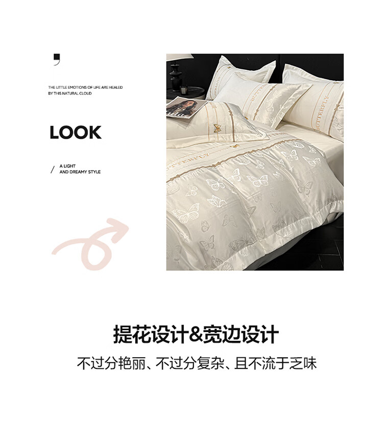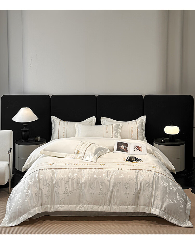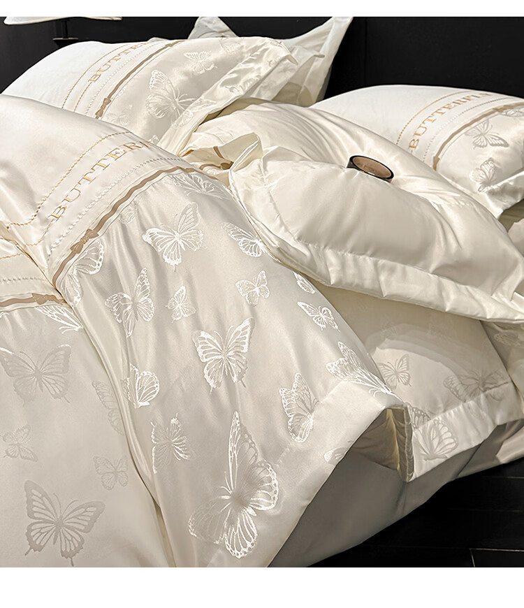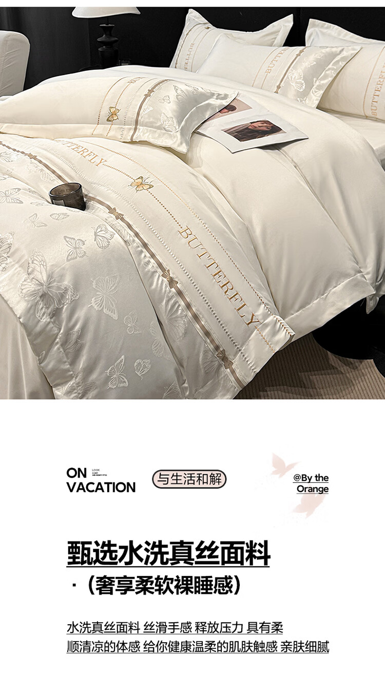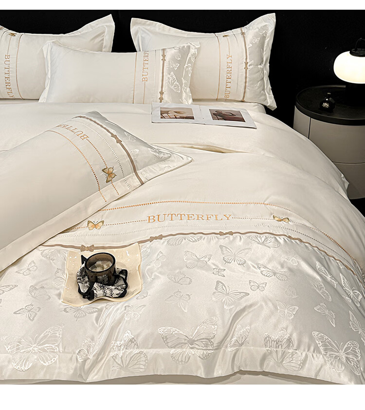 无印良品轻奢冰丝刺绣四件套夏季凉感床单被套家用裸睡床笠款床被罩上用品 拾光蝶影-奶白【亲肤细腻 自带凉感】 1.8m 床单款 四件套-被套200x230cm