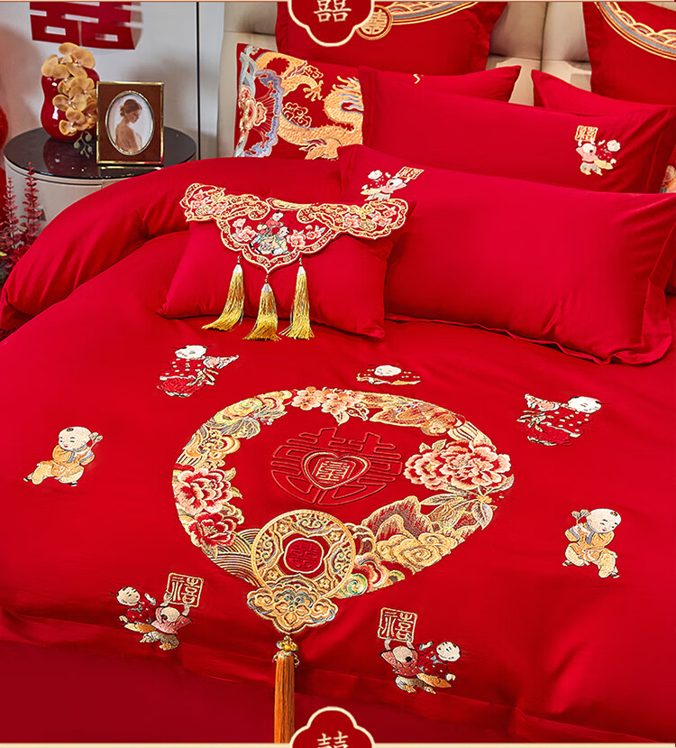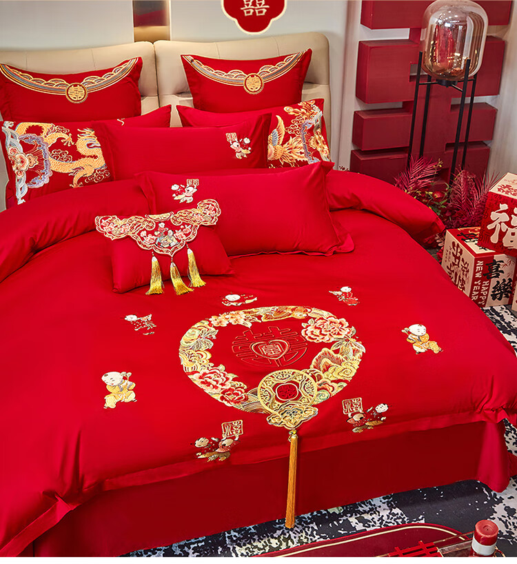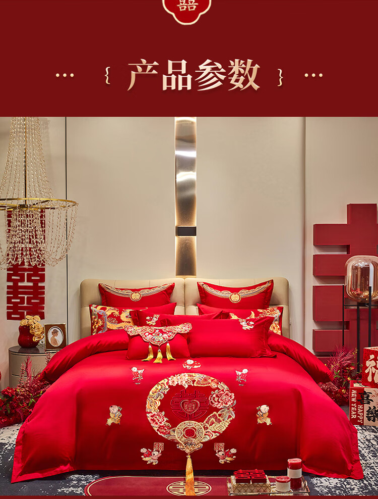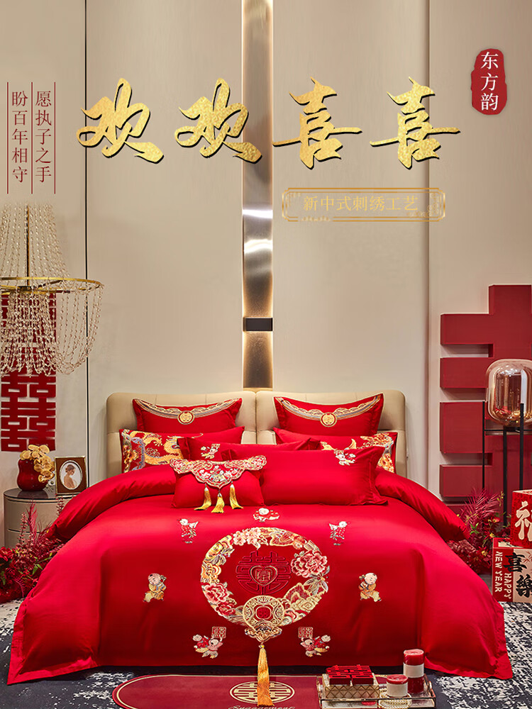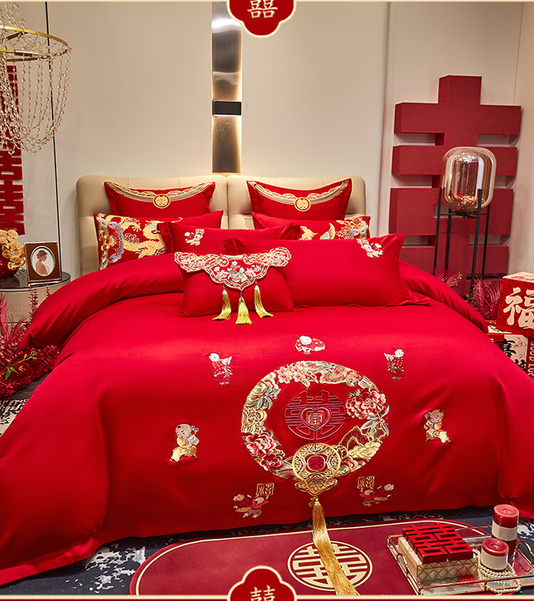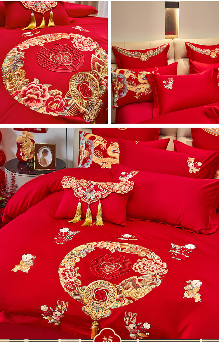 无印良品新中式刺绣婚庆四件套床上用品结婚红色高端喜被床单被套多件套 百子如意【甄选全棉 精美刺绣】 1.5m床单款四件套