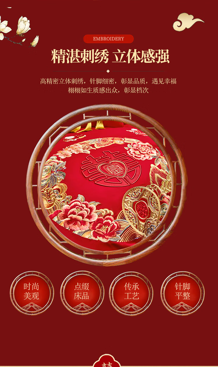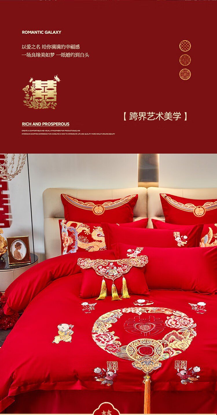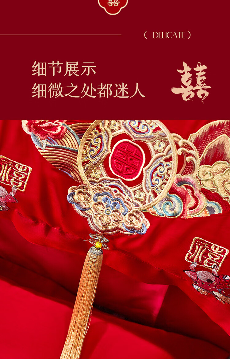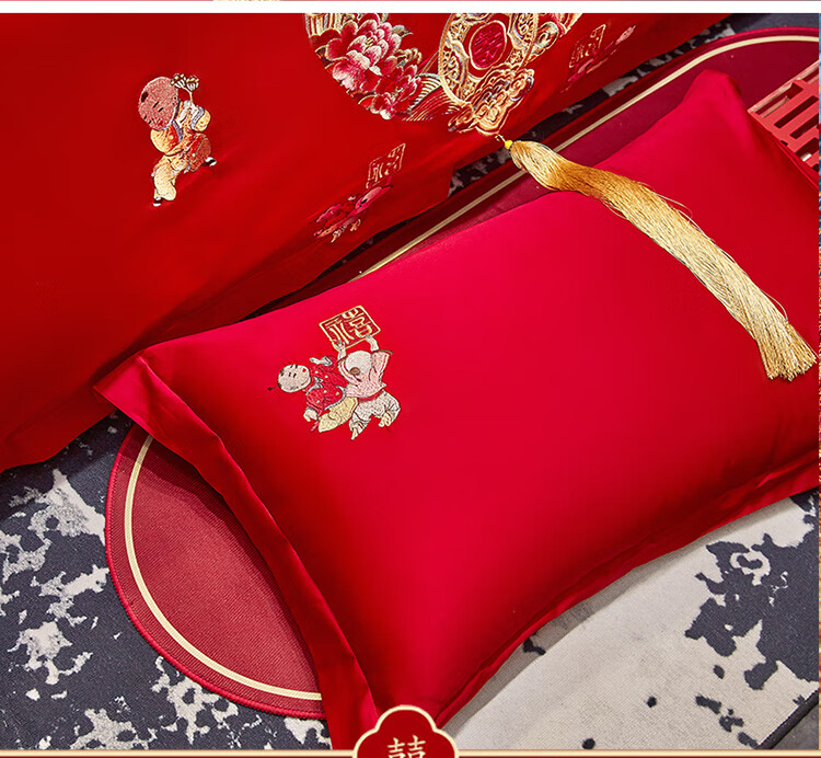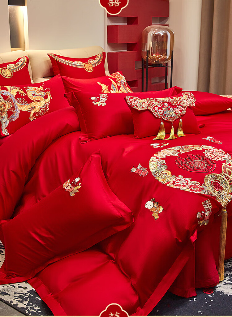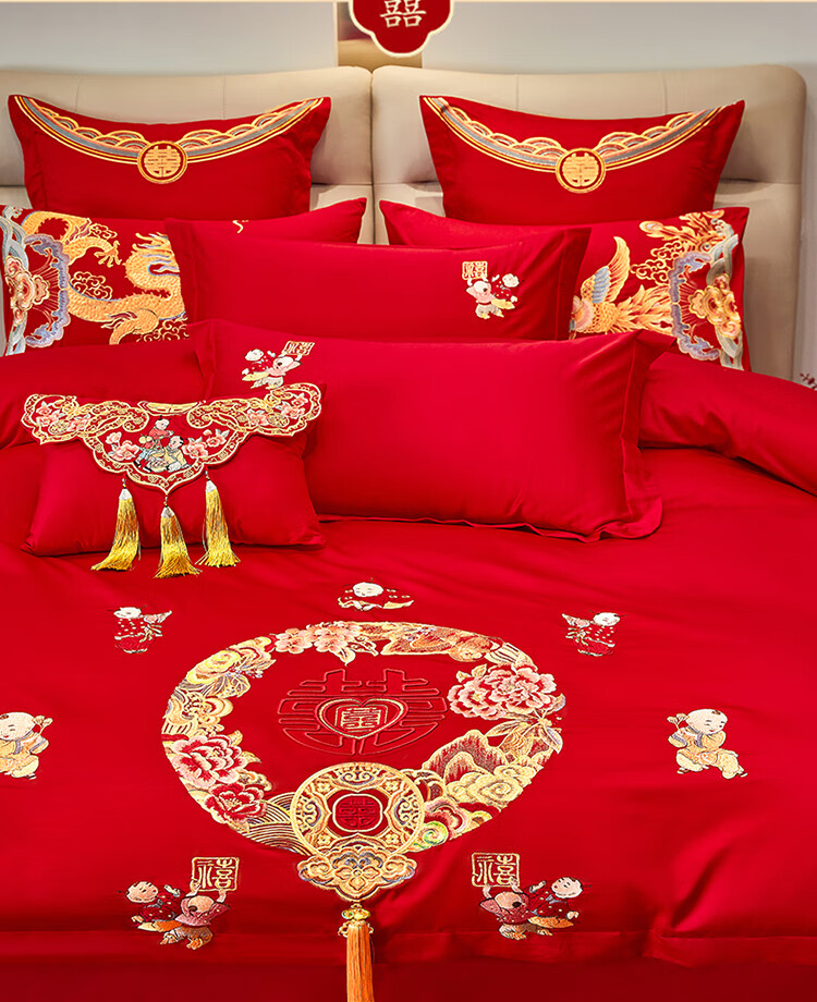 无印良品新中式刺绣婚庆四件套床上用品结婚红色高端喜被床单被套多件套 百子如意【甄选全棉 精美刺绣】 1.5m床单款四件套