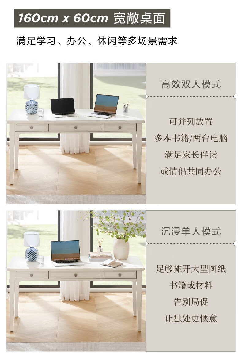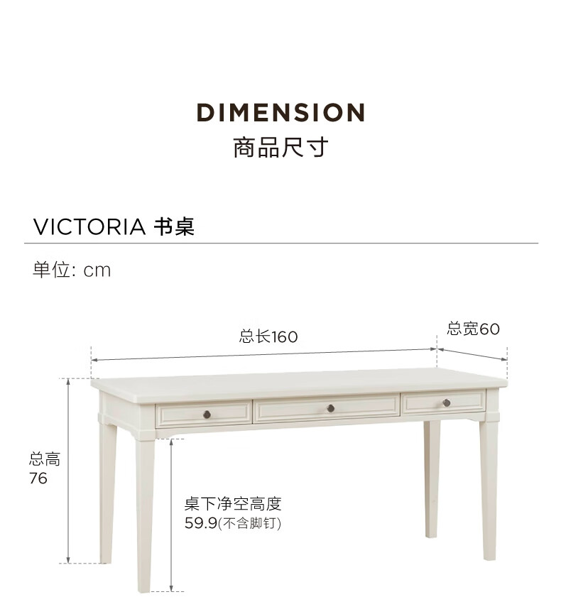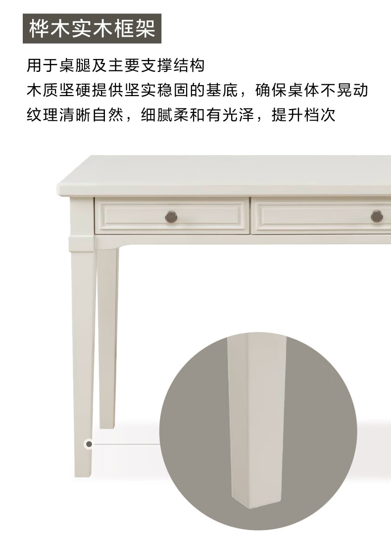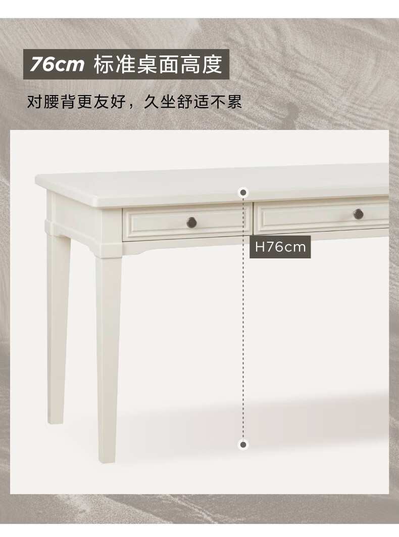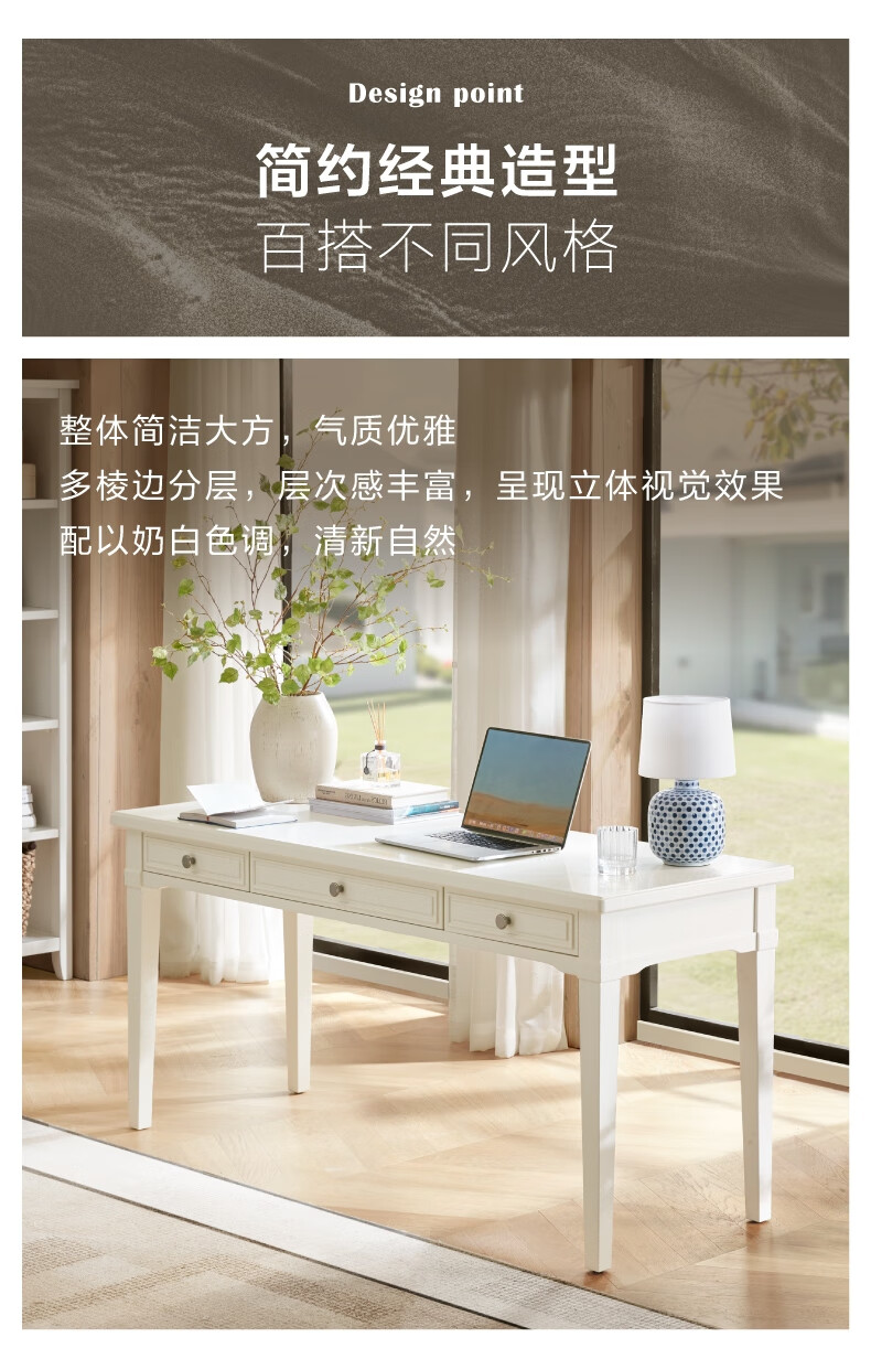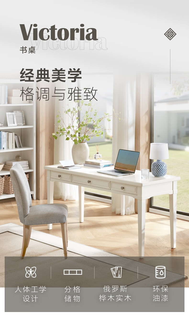 Harbor House【政府补贴】美式轻奢书房书桌经典简约实木框架学习桌靠墙写字台 Victoria 书桌-白色 长1600X宽600X高760mm