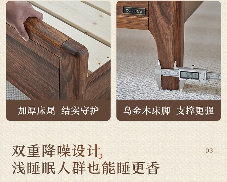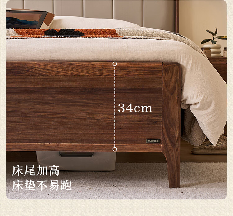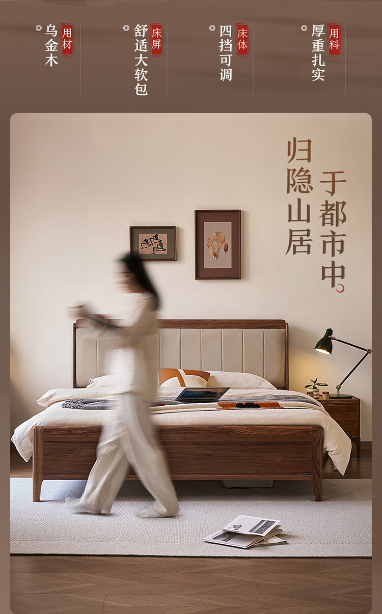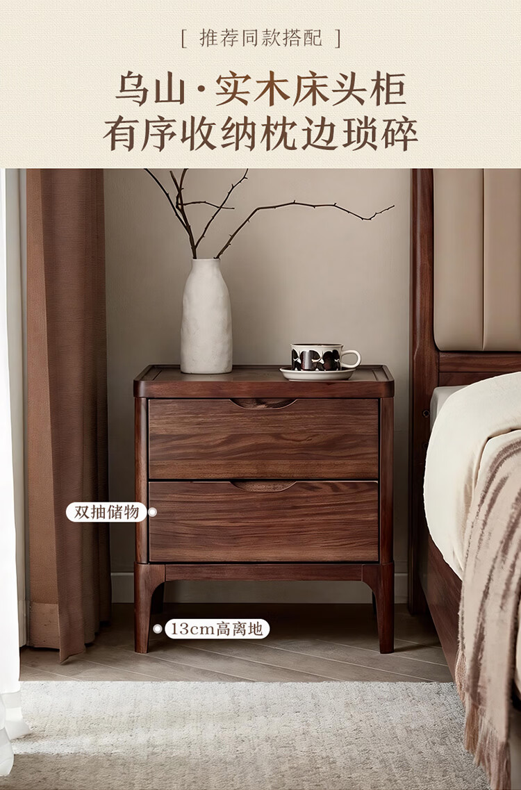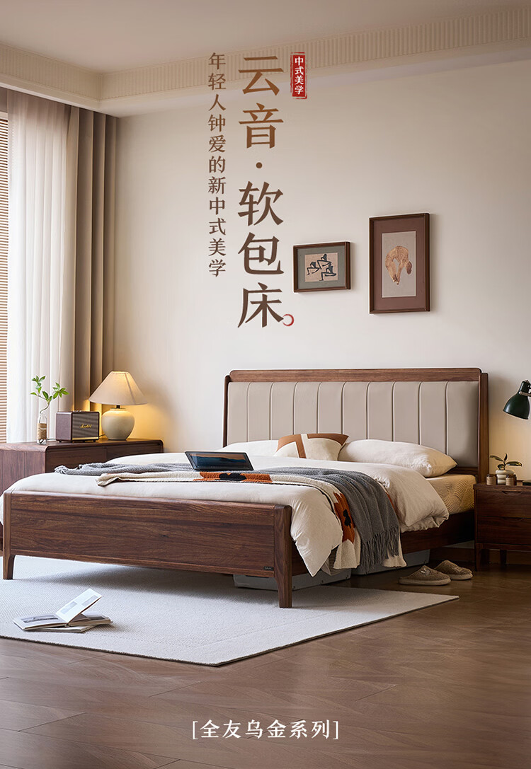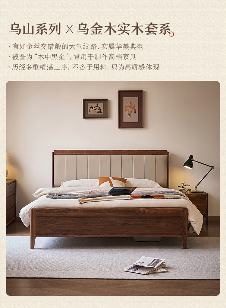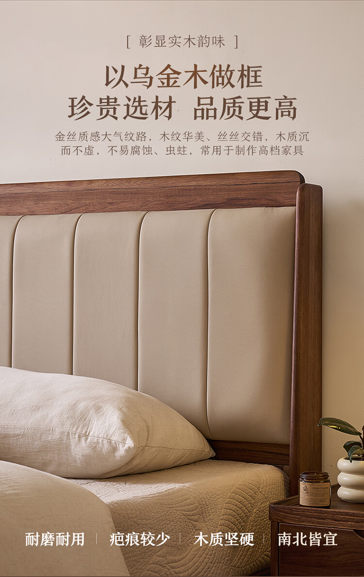 全友家居新中式乌金木实木软包床小户型家用卧室齐边床含床垫组合套装 【乌金木 | 高脚款】 1.8米x2米 床头柜
