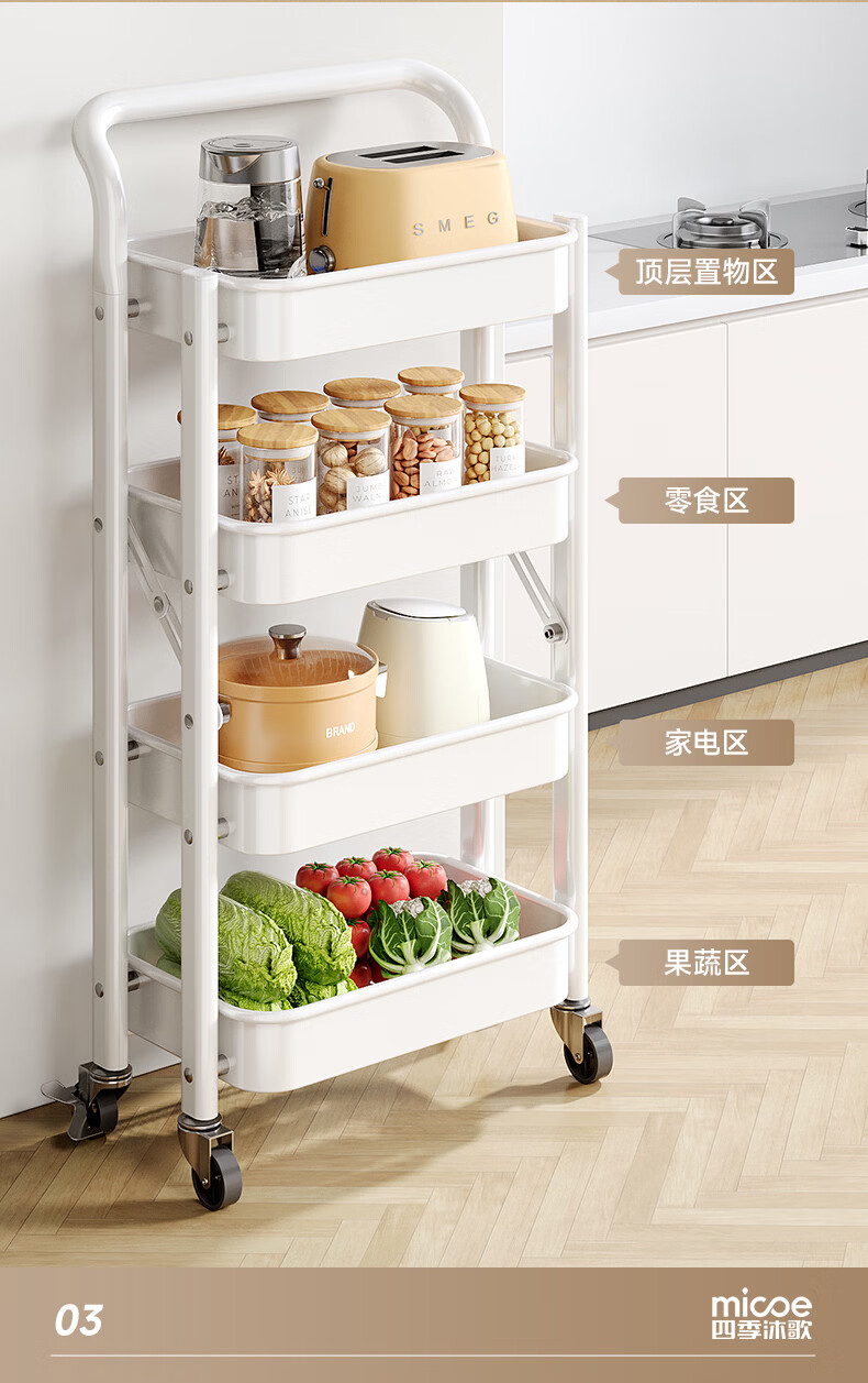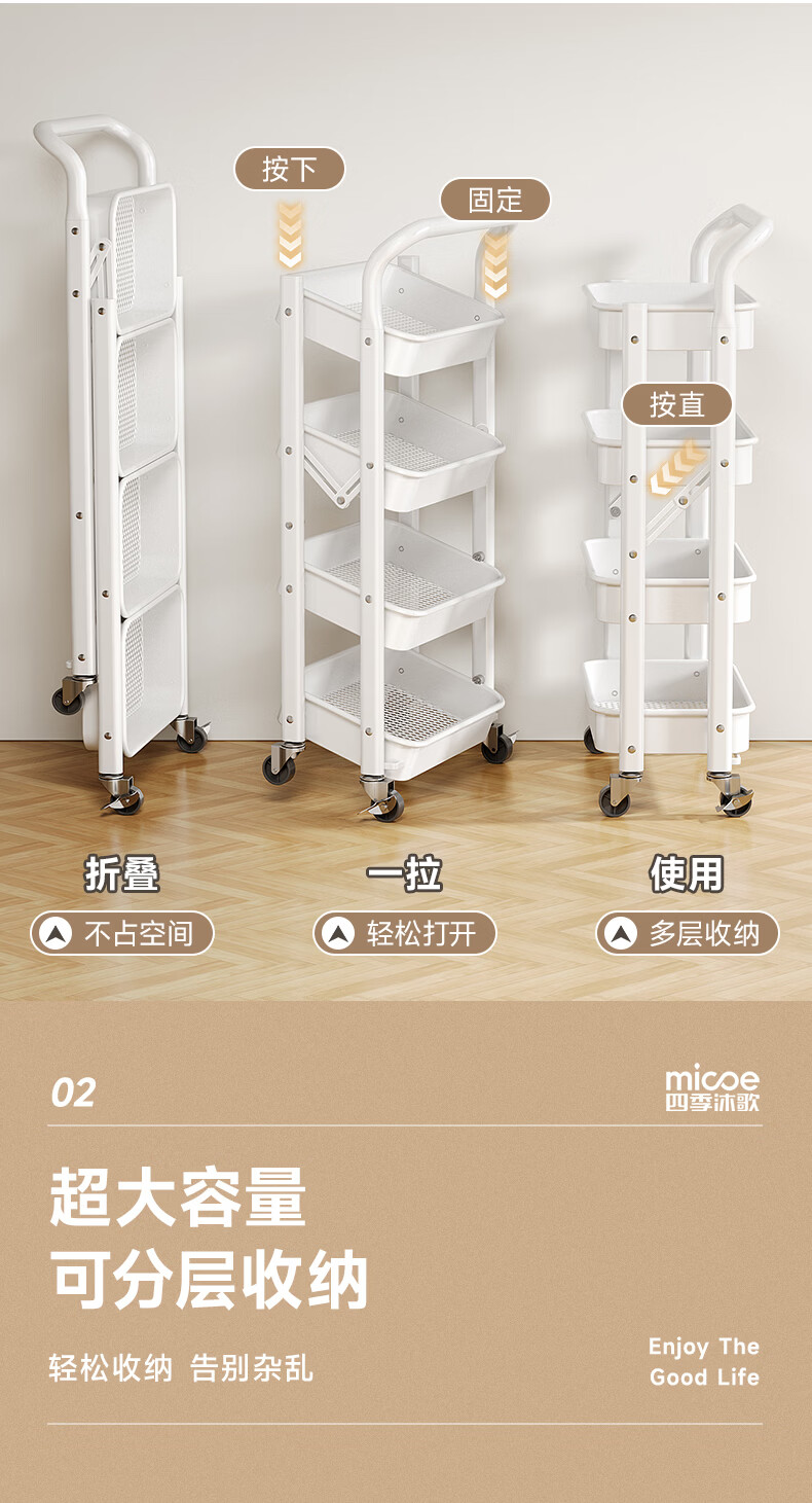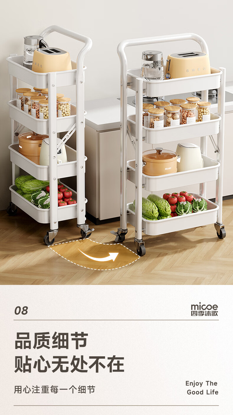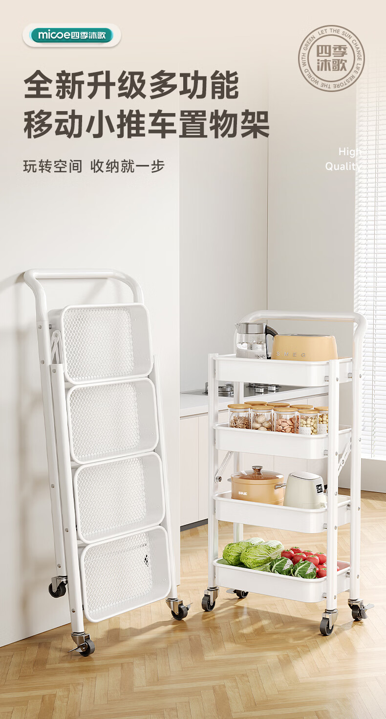 四季沐歌厨房置物架落地折叠小推车置物架免安装零食收纳储物移动果蔬菜篮 3层耀黑【可折叠】常规款