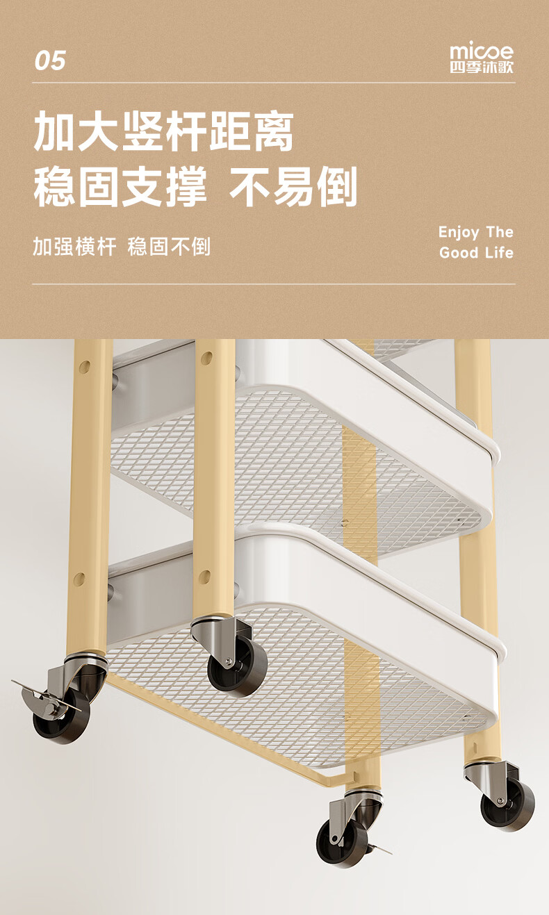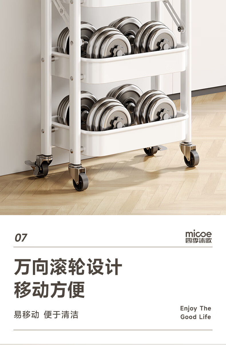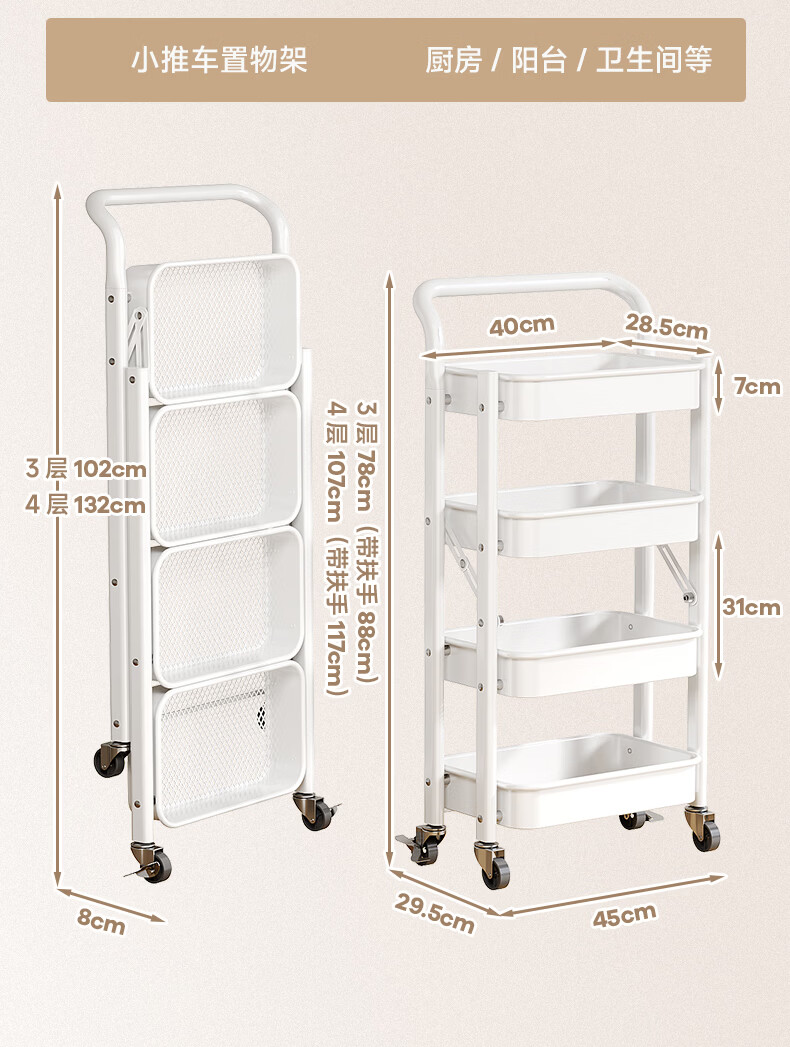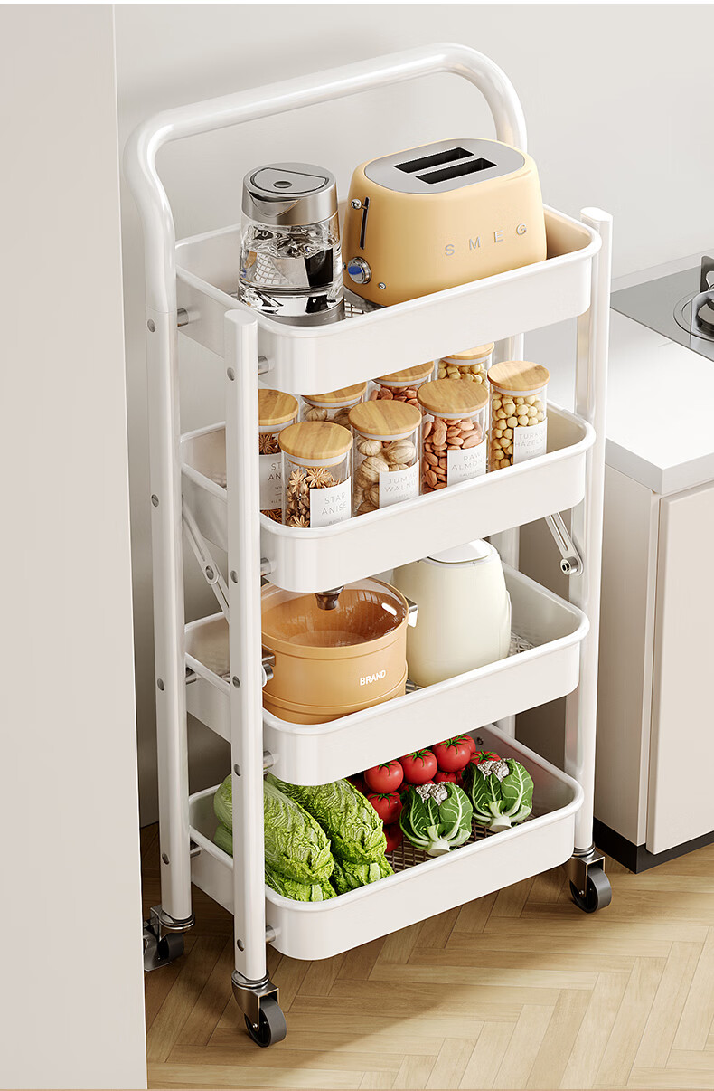 四季沐歌厨房置物架落地折叠小推车置物架免安装零食收纳储物移动果蔬菜篮 3层耀黑【可折叠】常规款