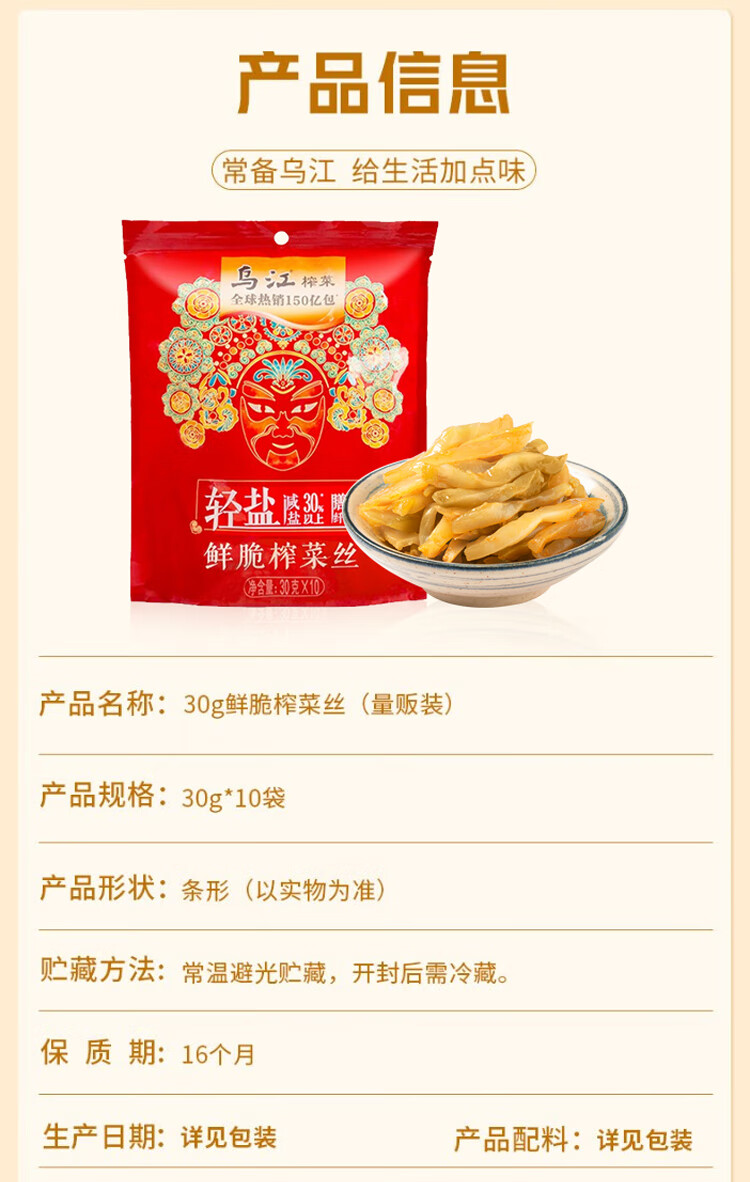 乌江榨菜 下饭菜 鲜脆榨菜丝 30g*10袋 (量贩装)
