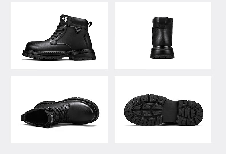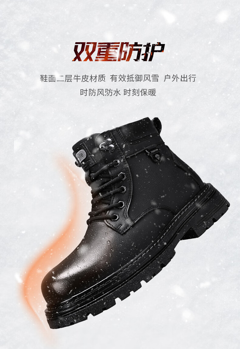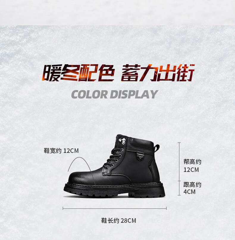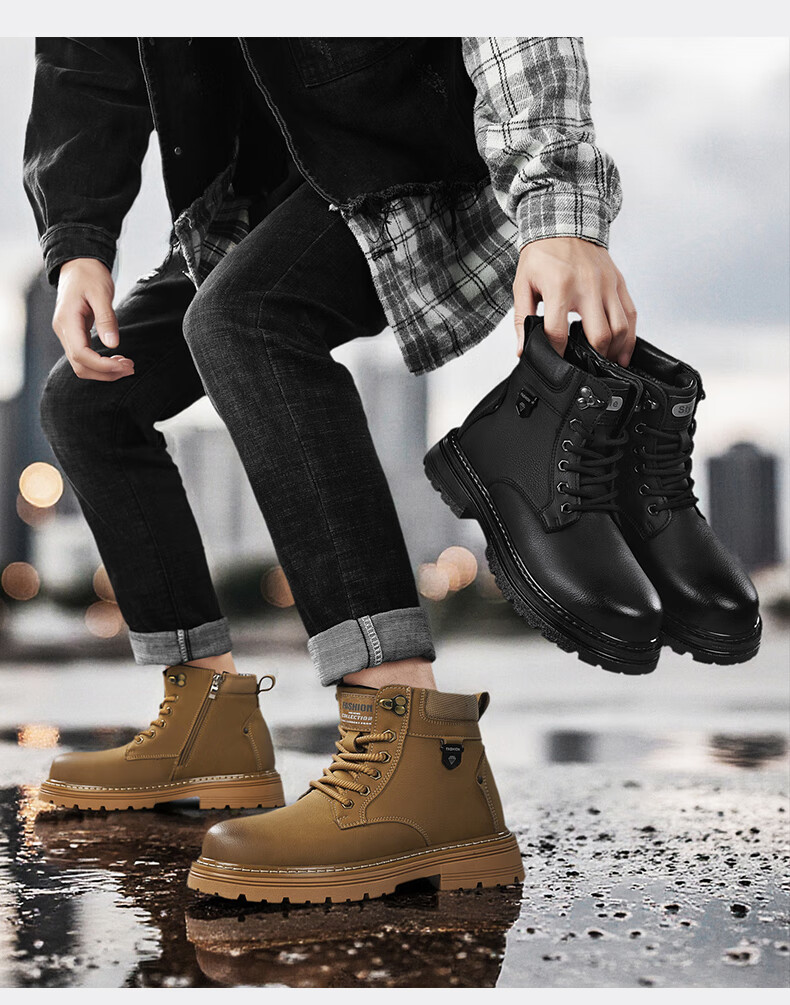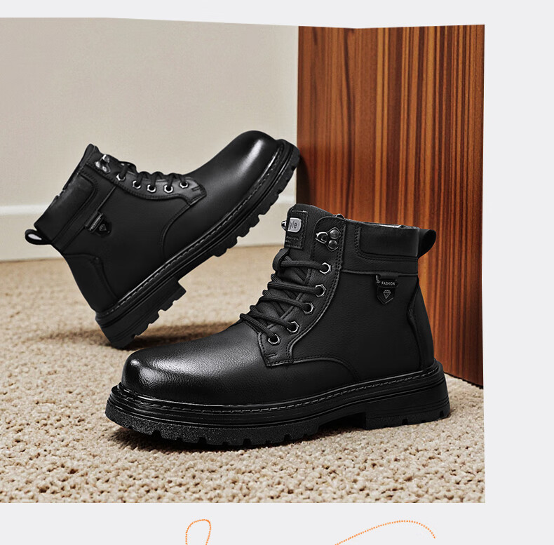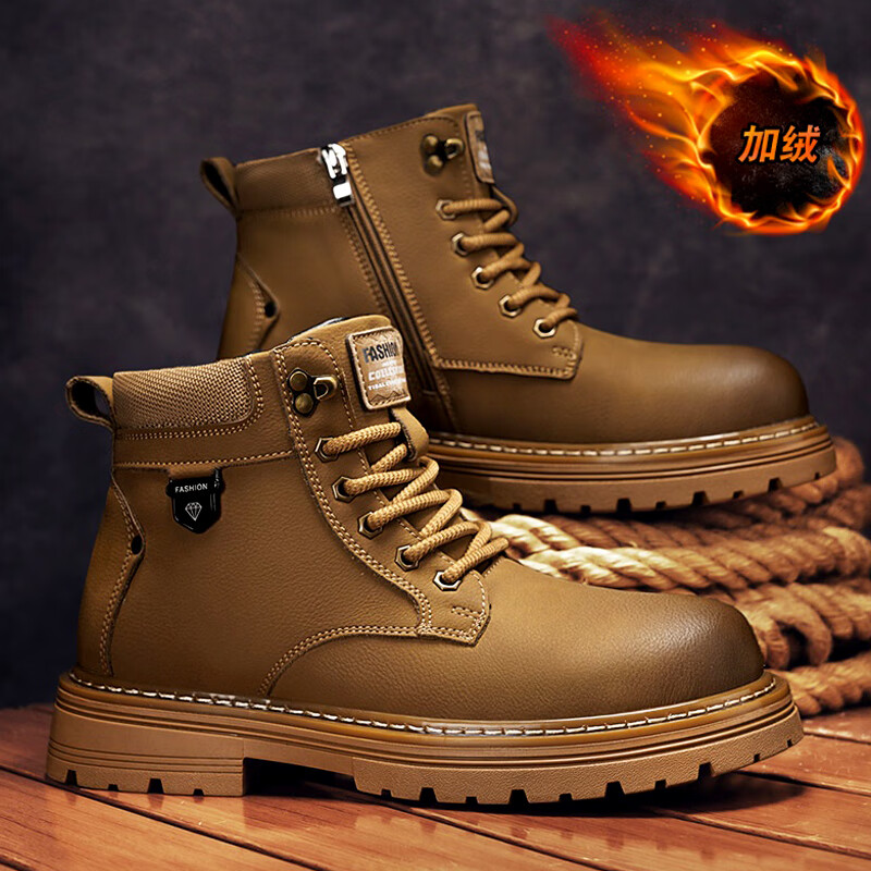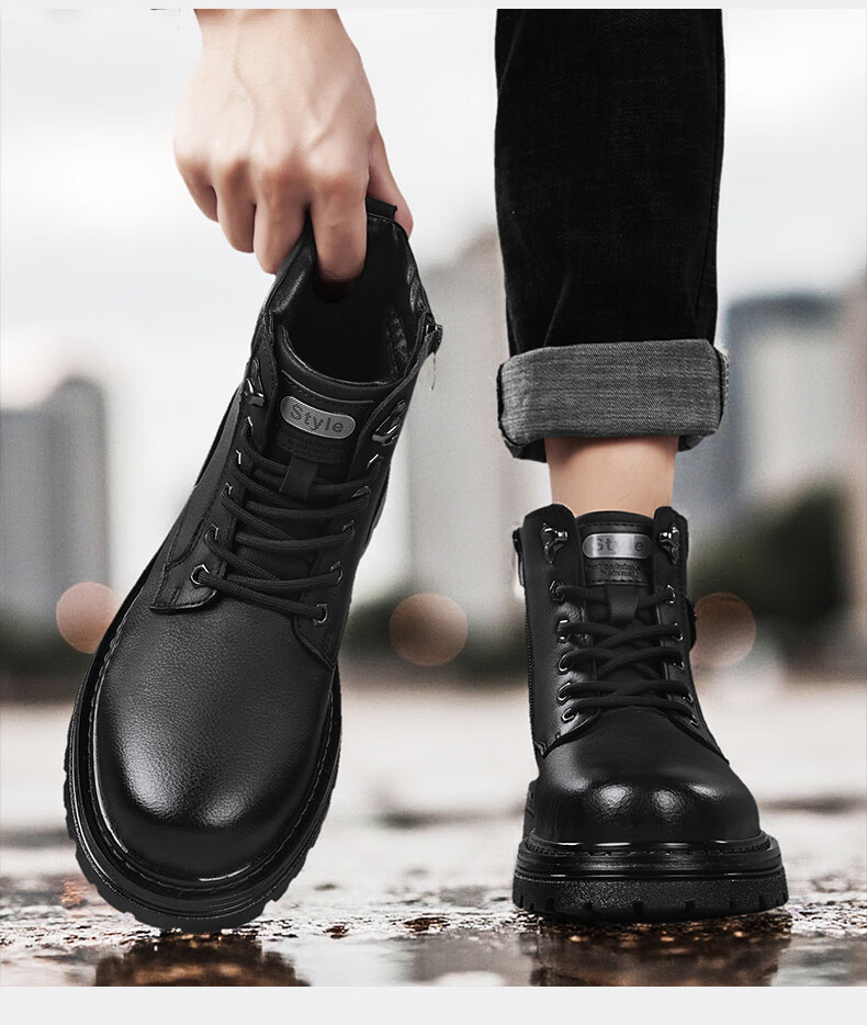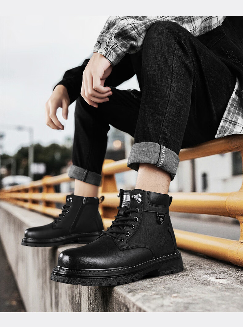 稻草人(MEXICAN)真皮高帮男鞋冬季加绒保暖皮鞋侧拉链潮流复古英伦工装马丁大黄靴 黑色单鞋 44 标准皮鞋码
