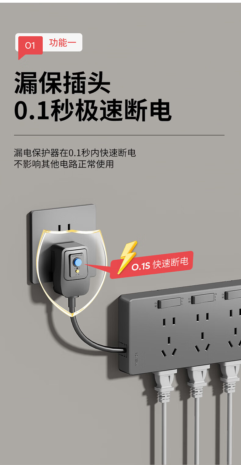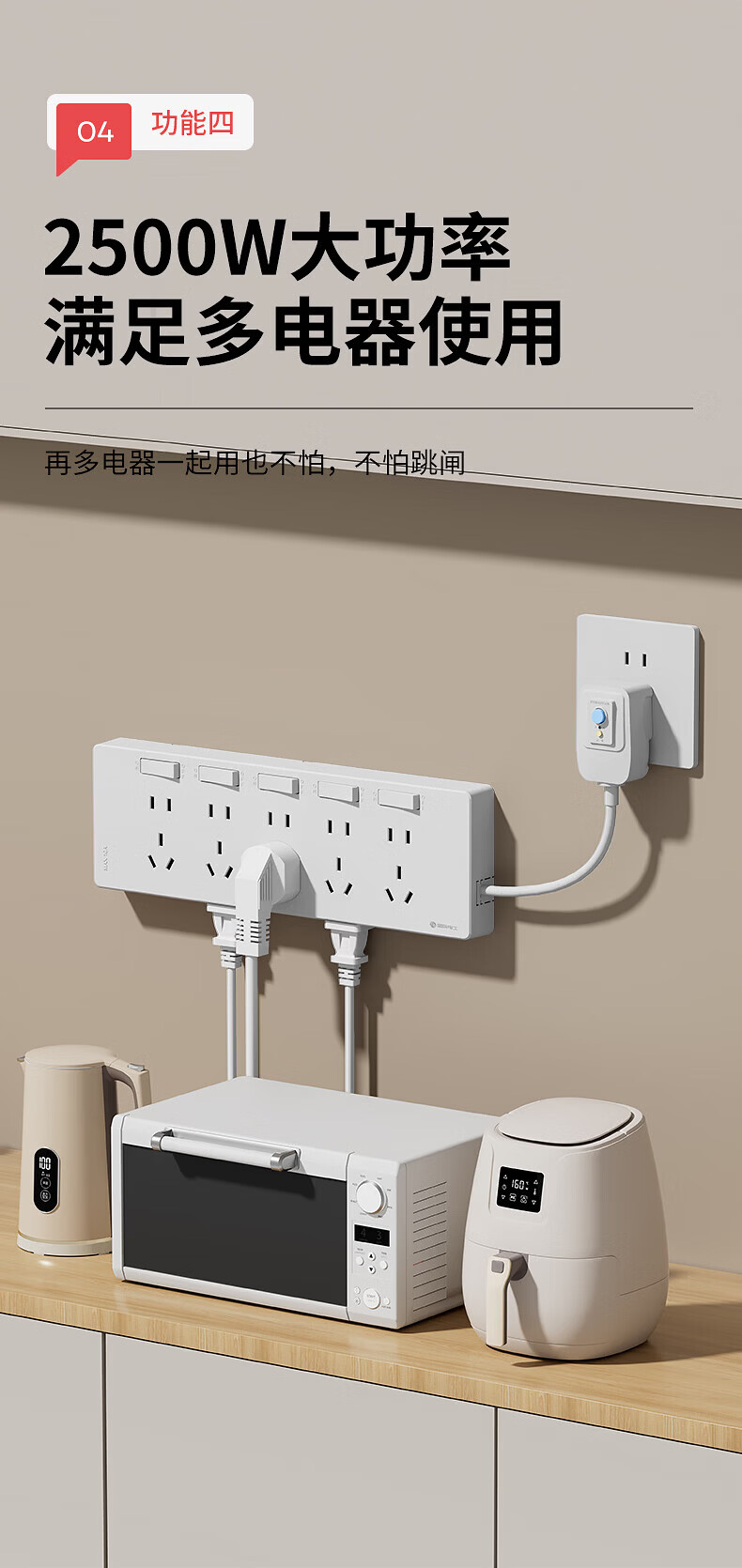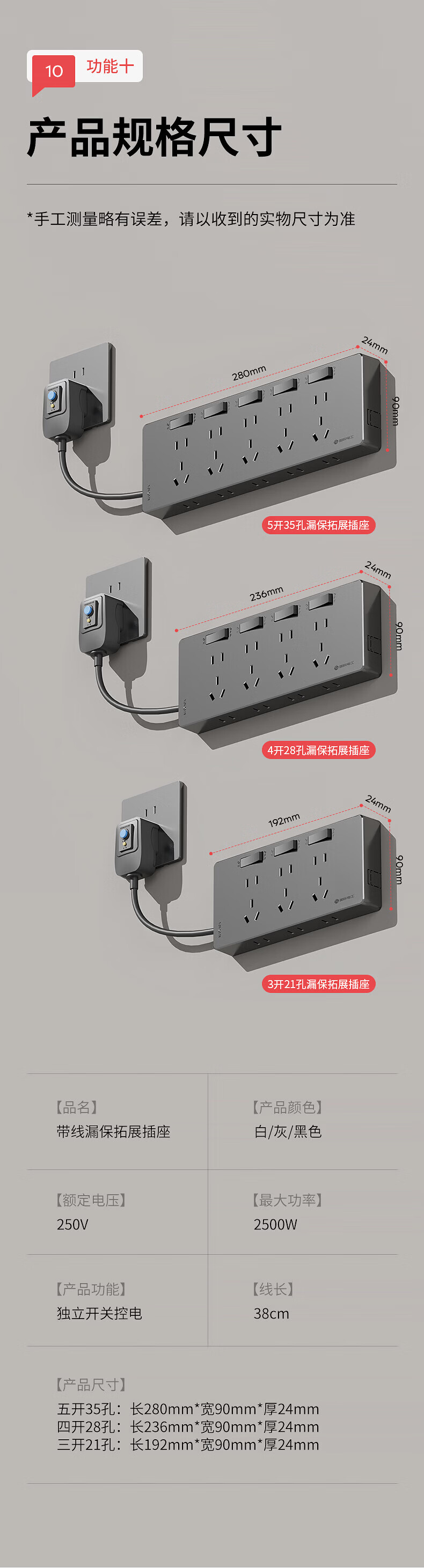 国际电工(FDD)家用厨房漏电保护插座带线扩展插排直插式分控多功能墙壁插座 白色带漏保【3开21孔】向右扩展