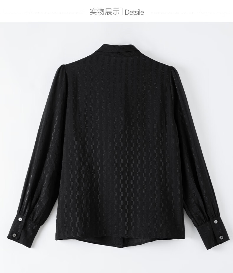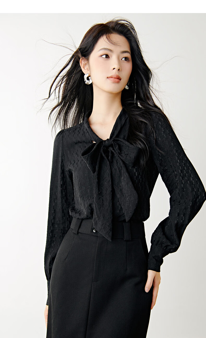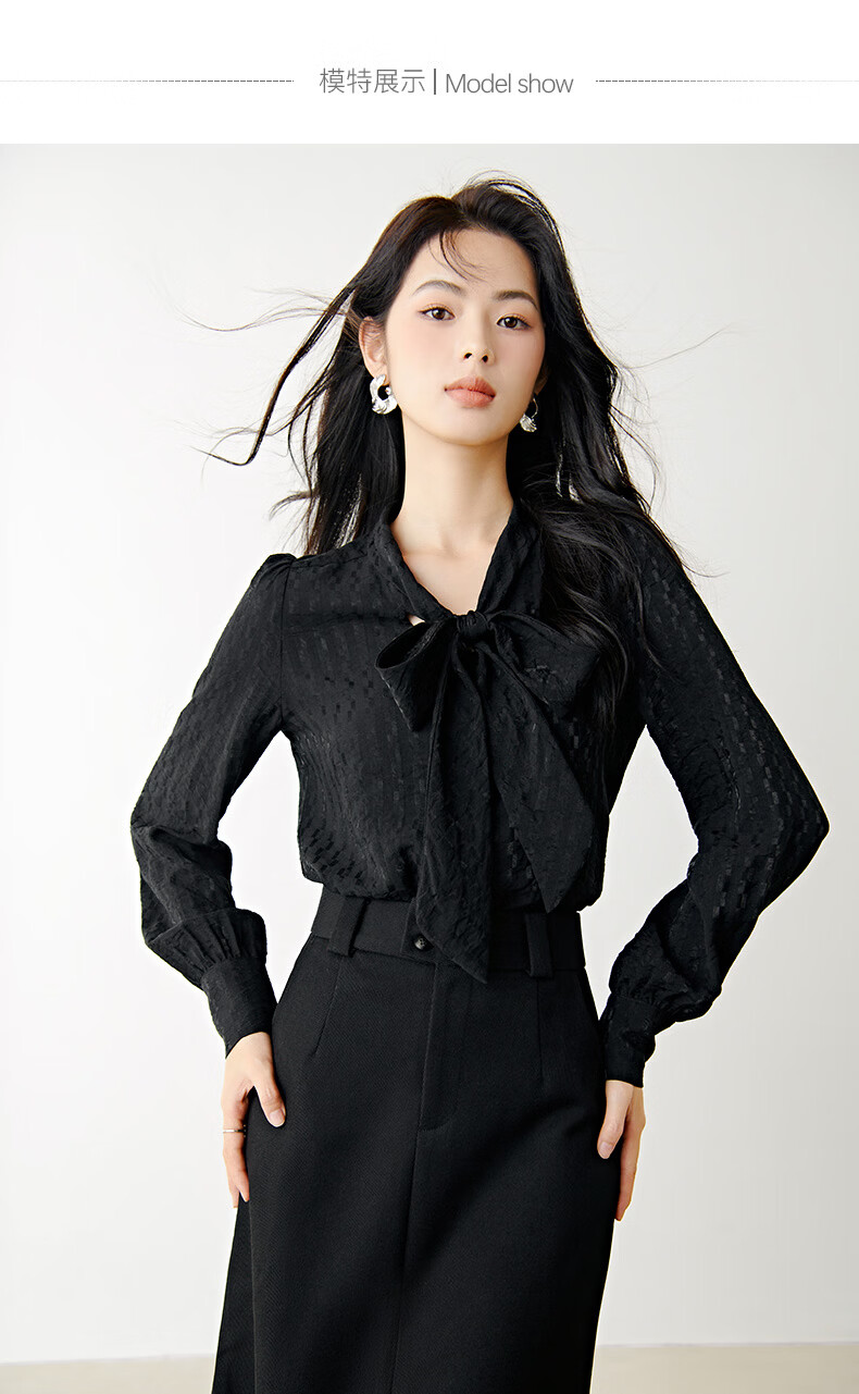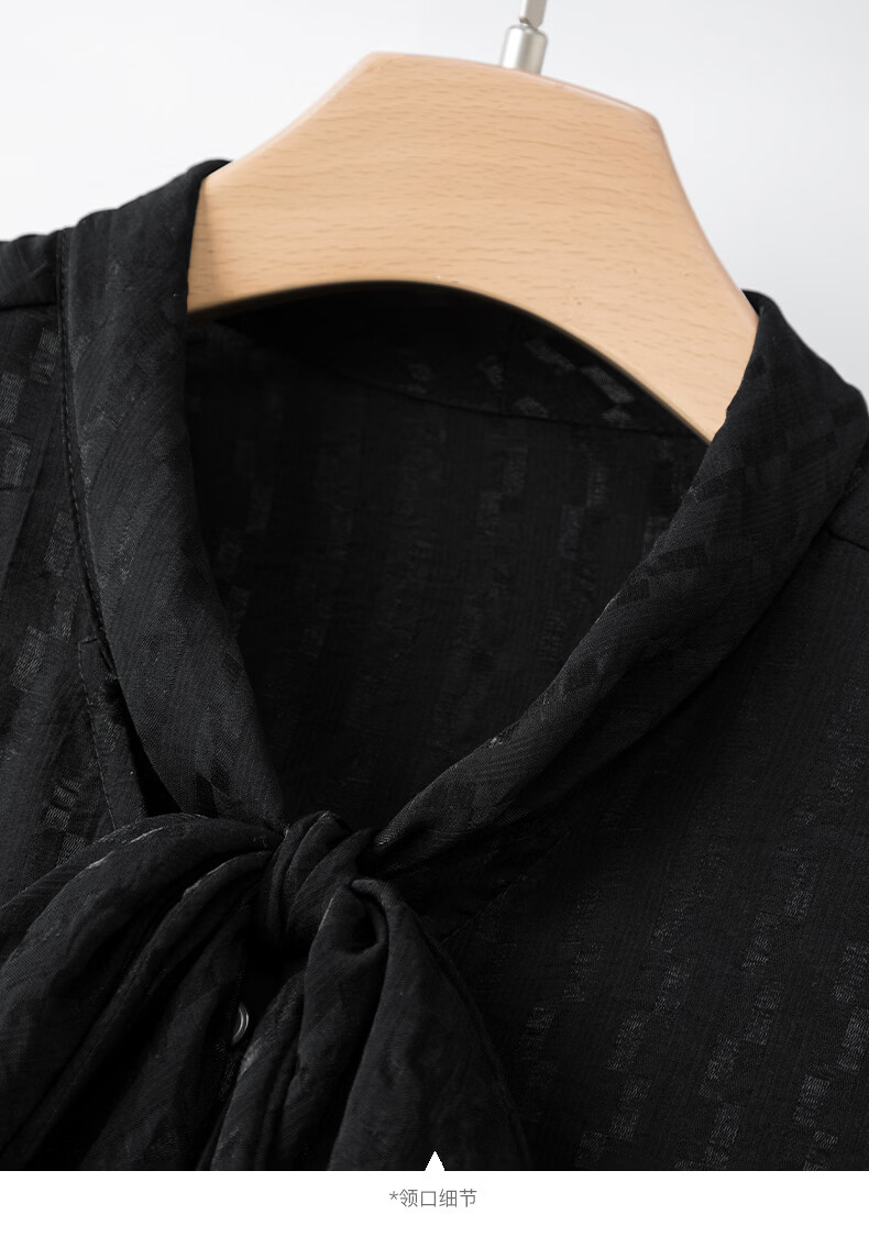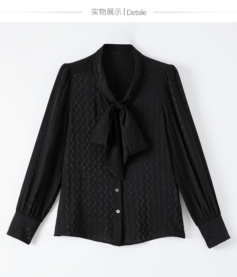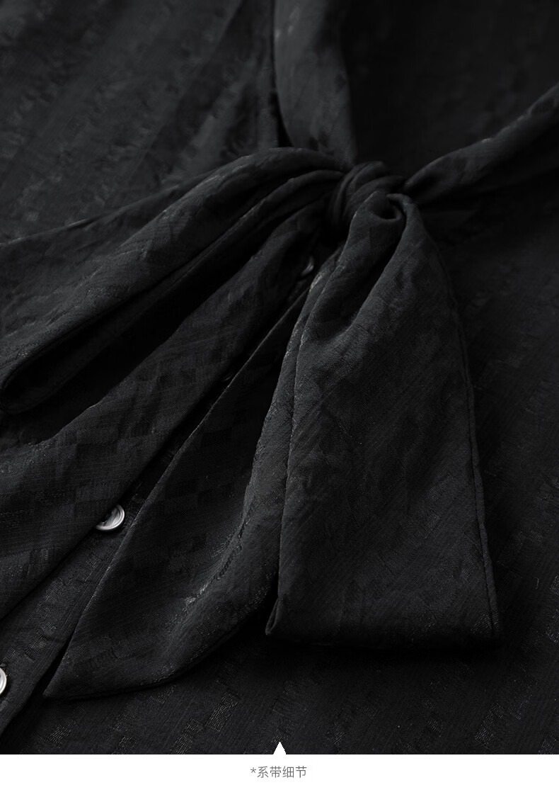 晚白【新品】2026年春款时尚暗纹系带蝴蝶结领上衣垂顺知性通勤衬衫女 黑色 M