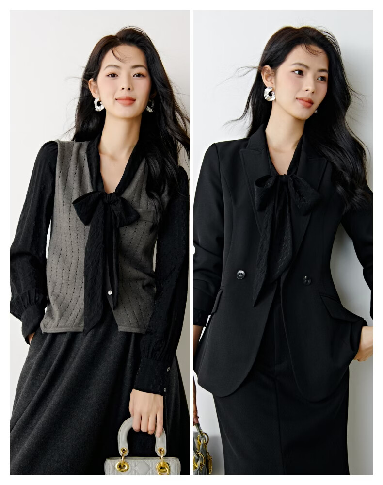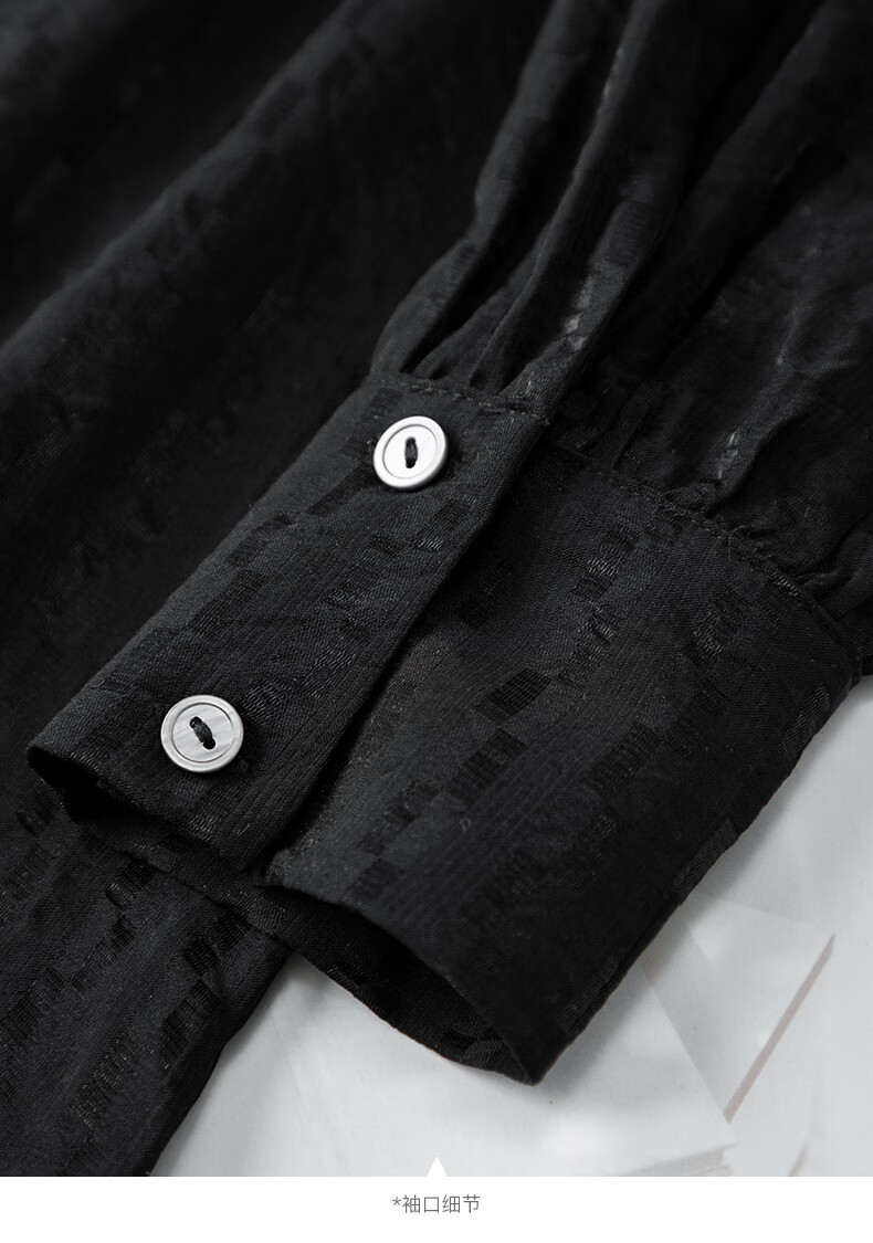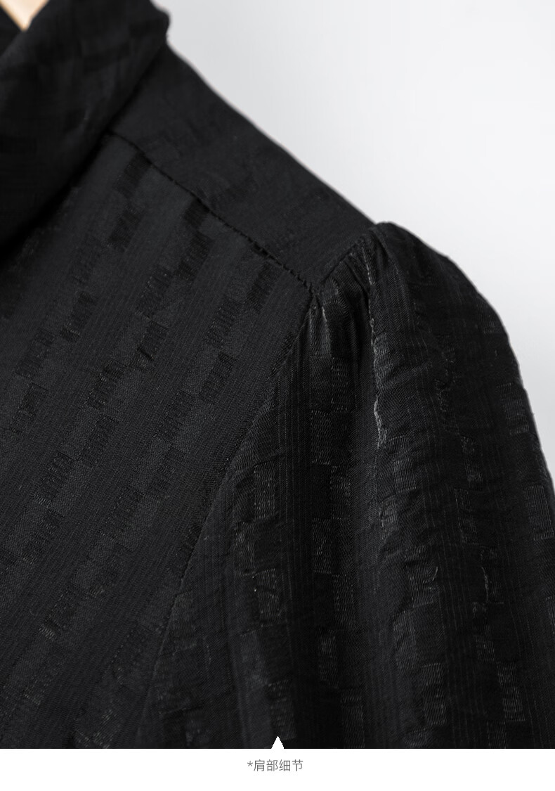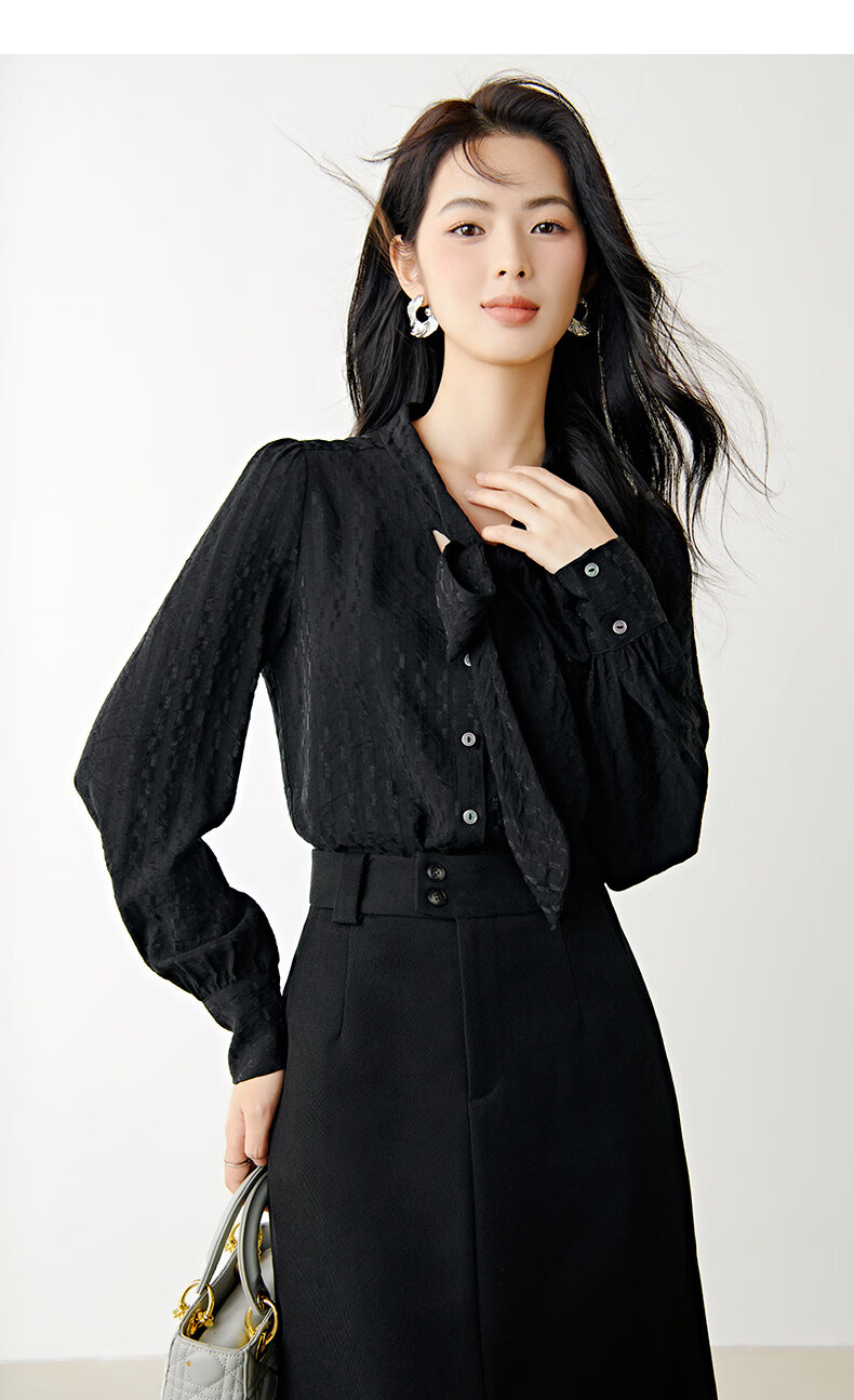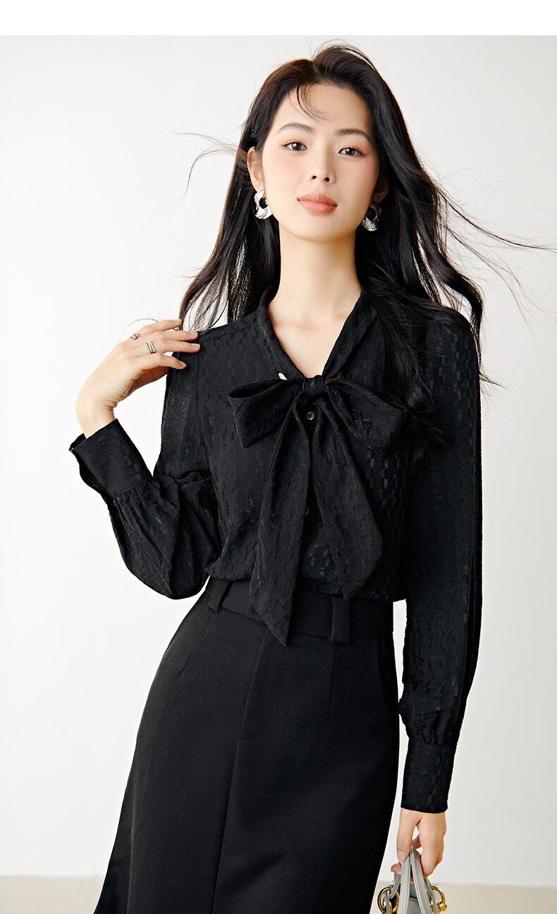 晚白【新品】2026年春款时尚暗纹系带蝴蝶结领上衣垂顺知性通勤衬衫女 黑色 M