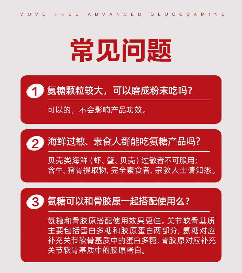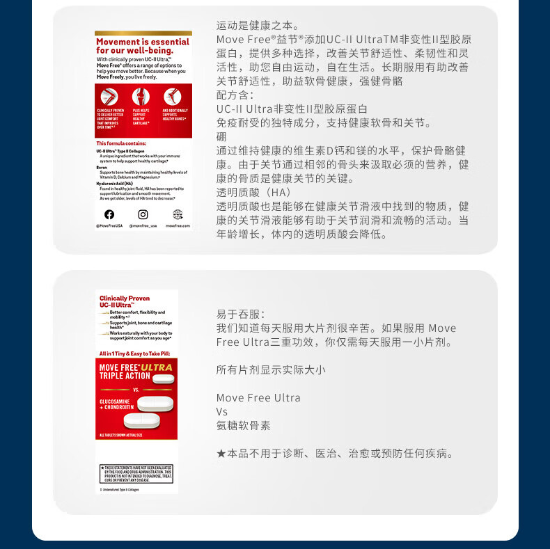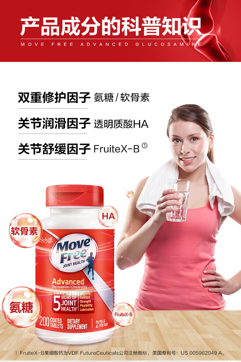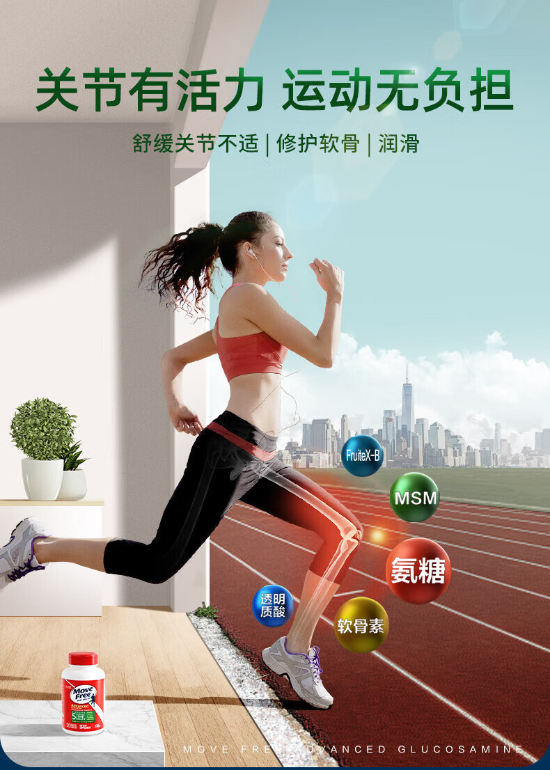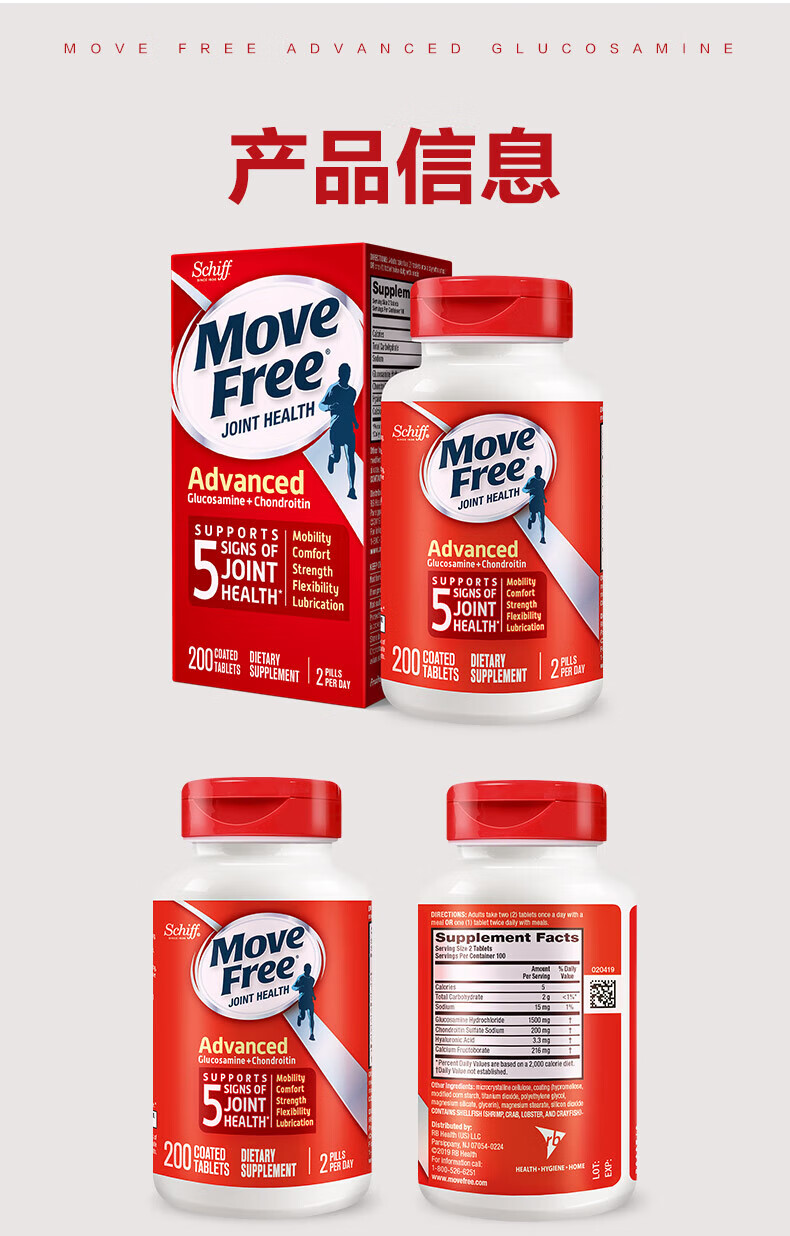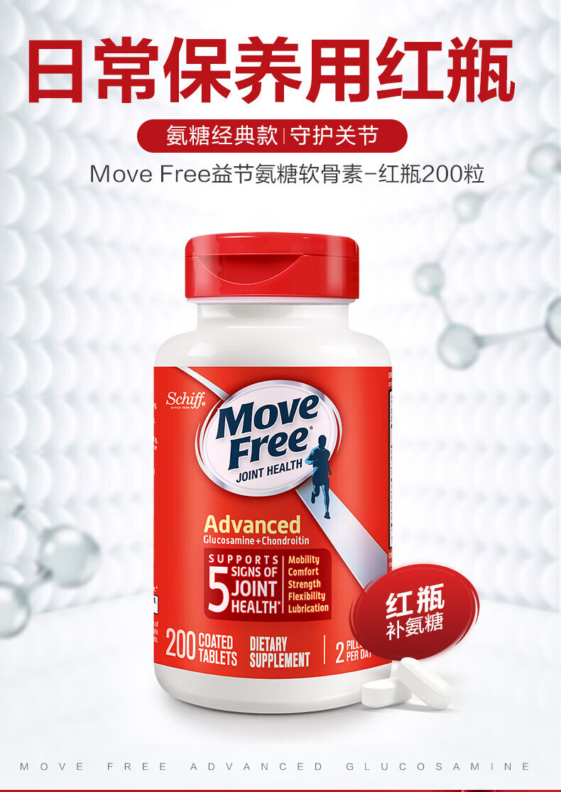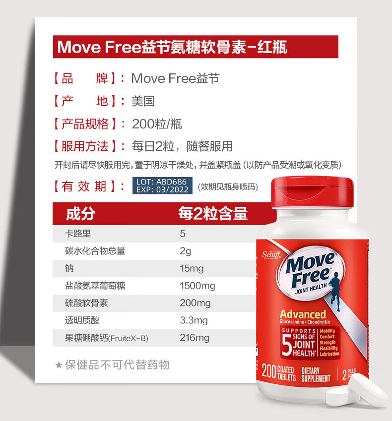 益节MoveFree氨糖软骨素 钙片维骨力美国进口中老年成人养护红瓶200粒