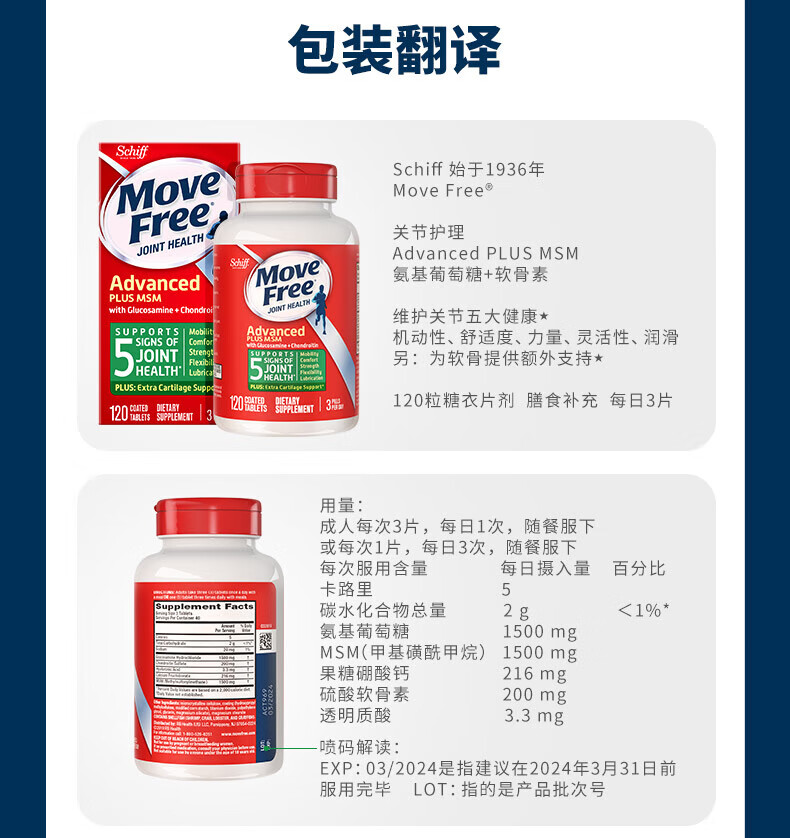益节(Move Free)金装氨糖软骨素绿瓶升级版120 维骨力 美国原装进口 中老年营养品 【加倍舒缓】升级金装氨糖 120粒*1瓶
