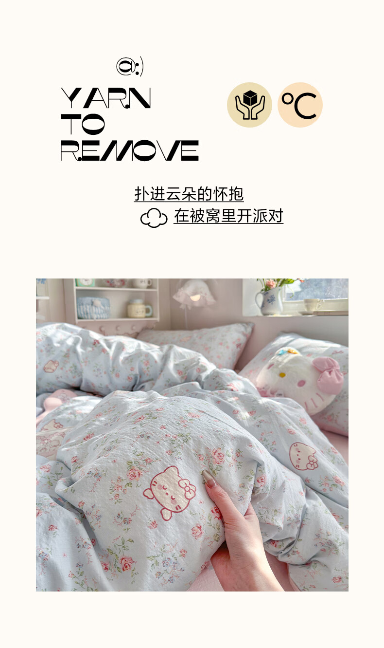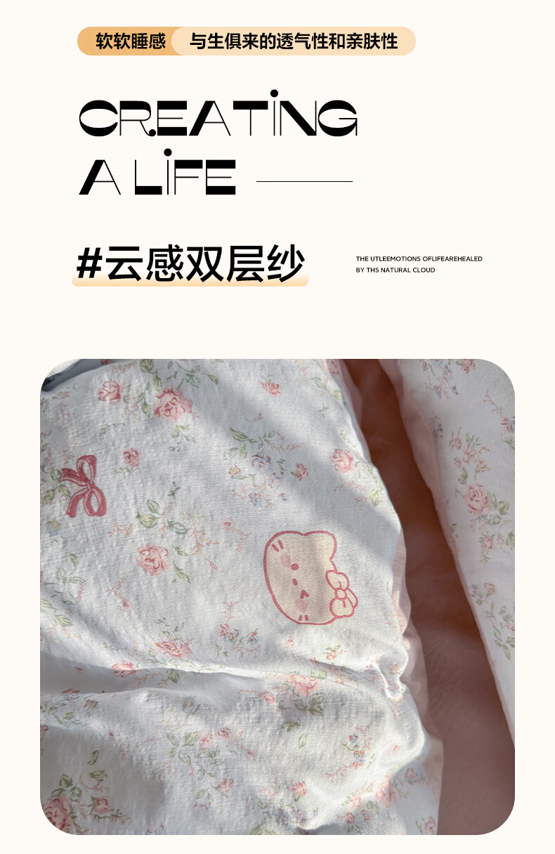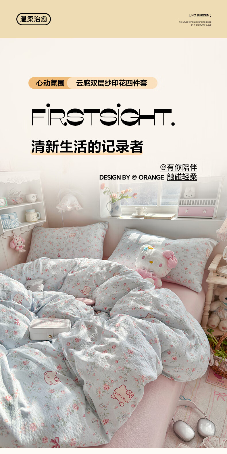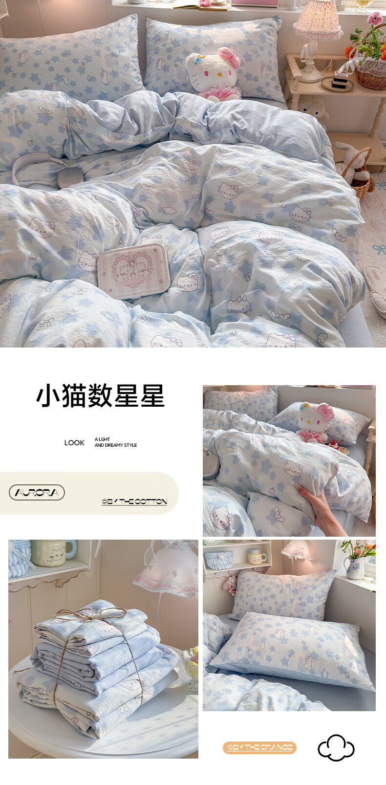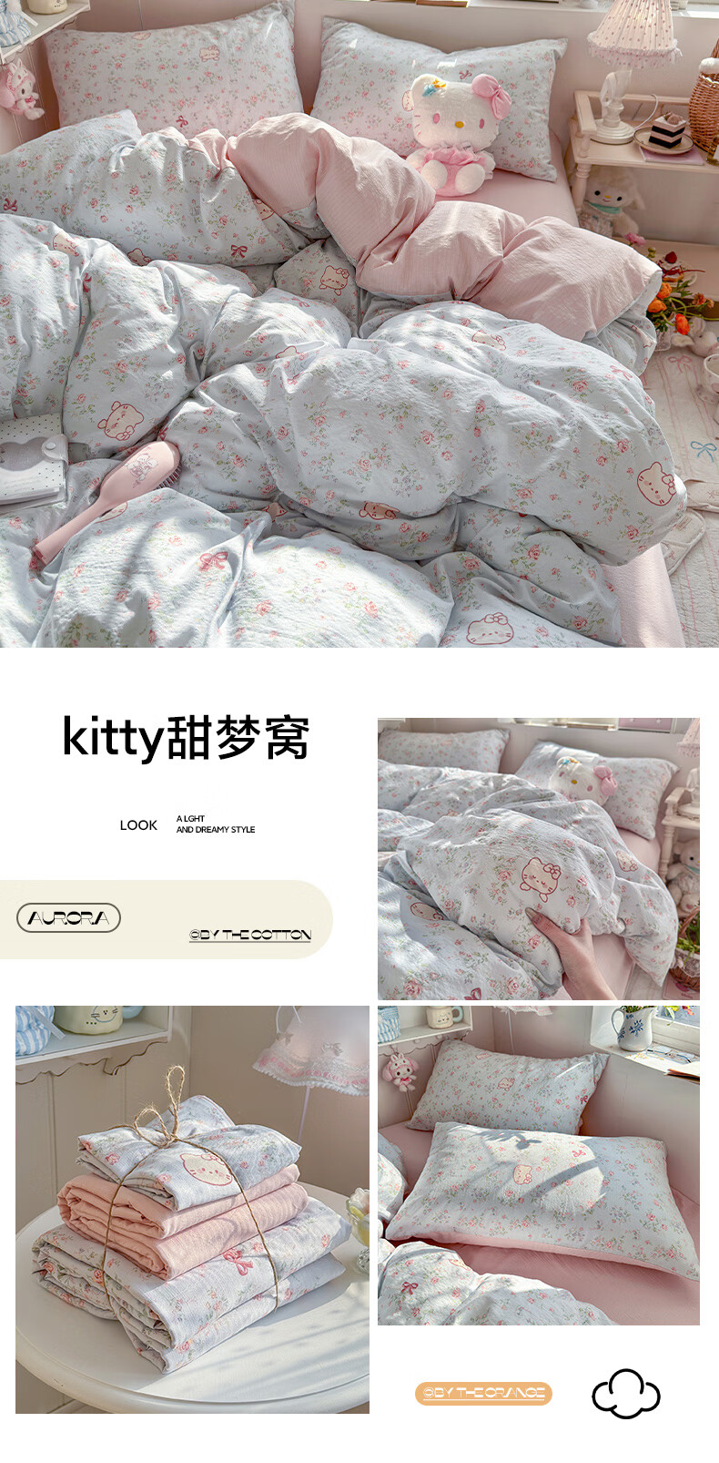 一默四件套被套床单床笠枕套居家A类小清新系列云感双层纱木棉四件套 kitty甜梦窝 2.0m 床单款 (被套200*230cm) 四件套