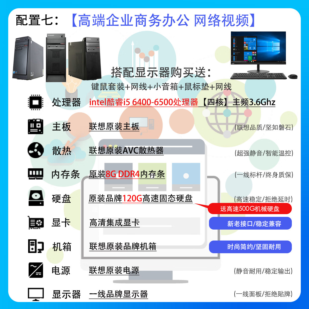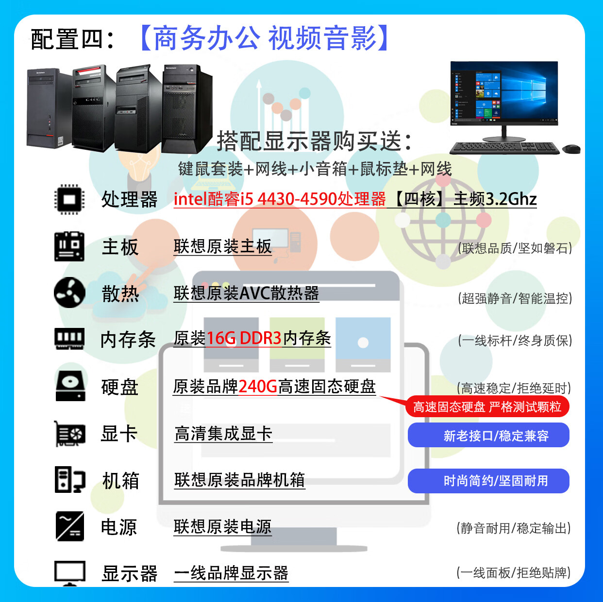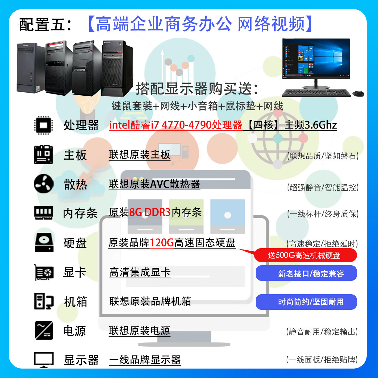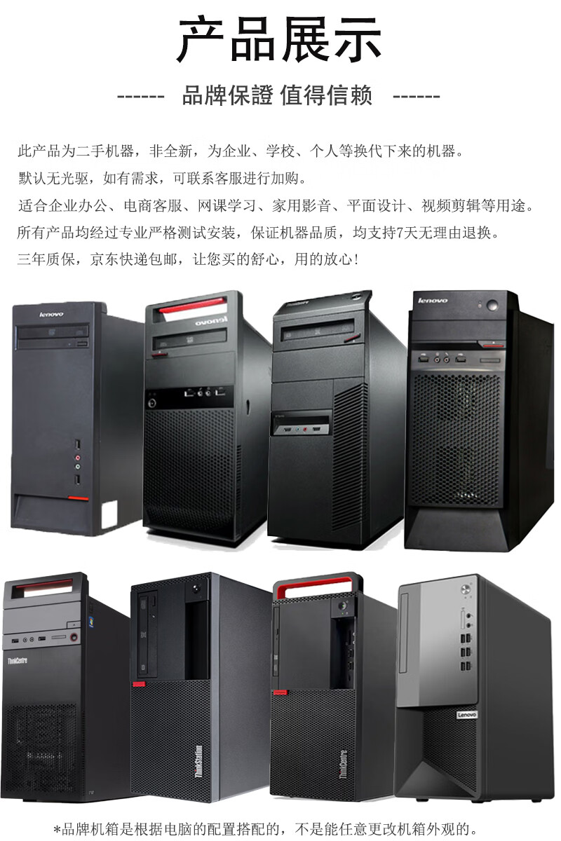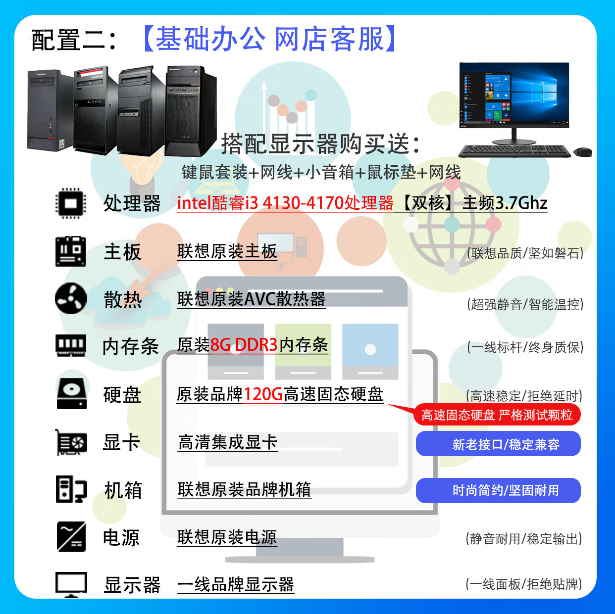 联想电脑台式主机整机 i3 i5 i7 商务办公家用娱乐显示器全套台式机 配置二:i3 四代8G 120G电商客服 主机+19寸LED显示器【9新】送键盘鼠标小音箱