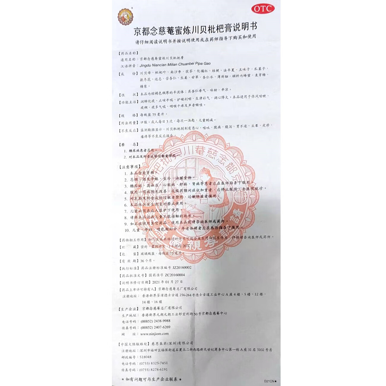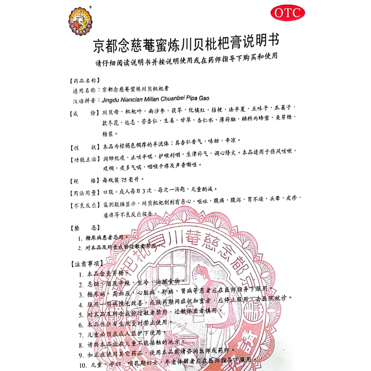 【感冒咳嗽】京都念慈菴 蜜炼川贝枇杷膏75ml 润肺化痰 止咳平喘 伤风咳嗽 护喉利咽 生津补气