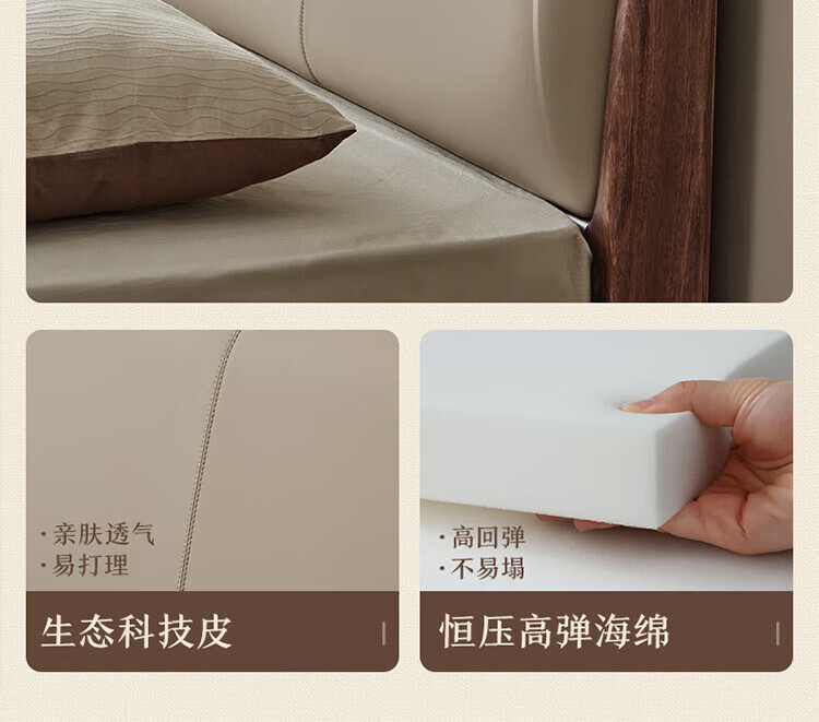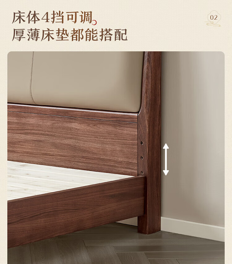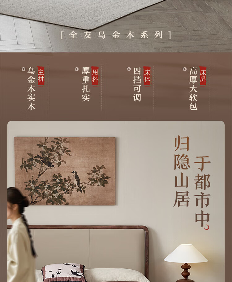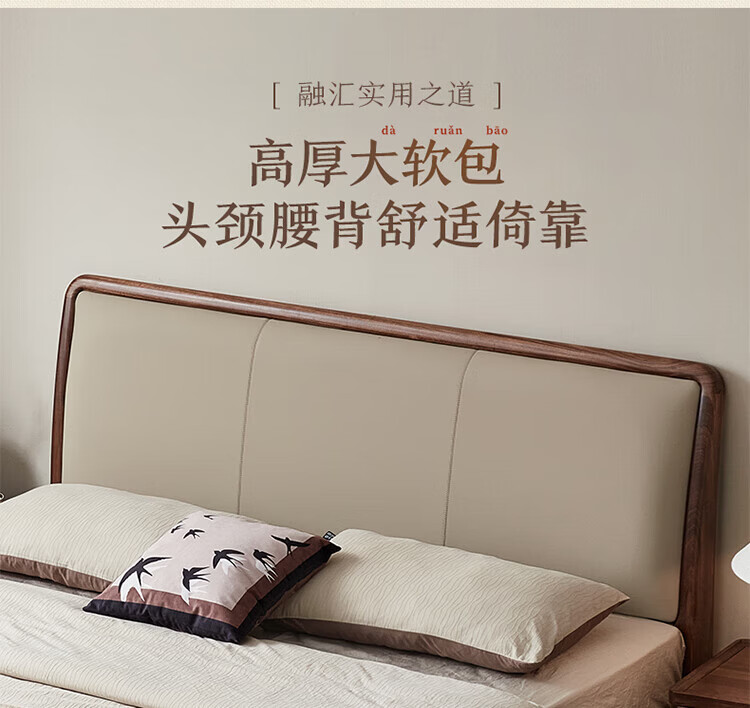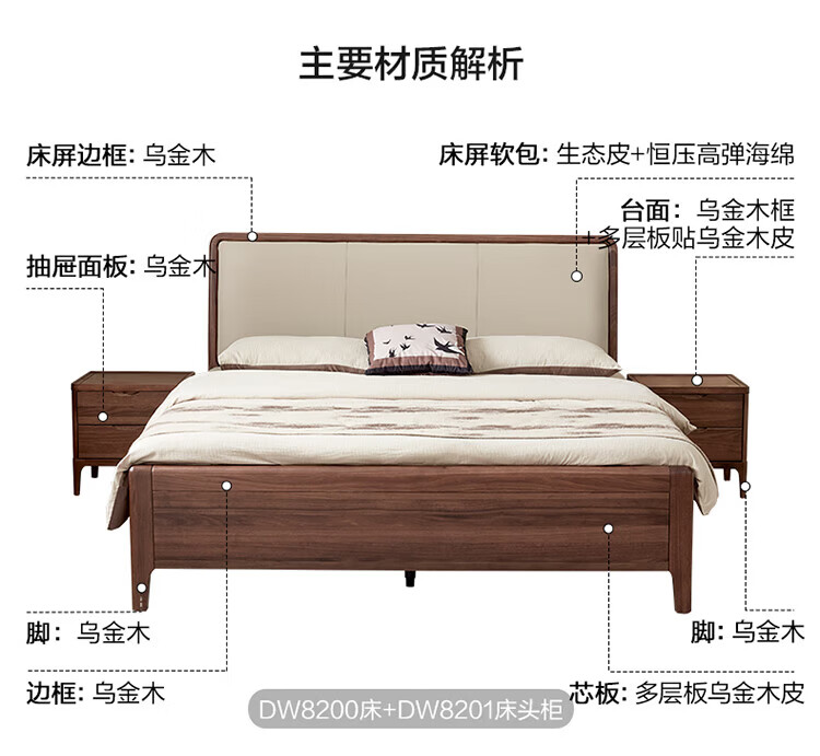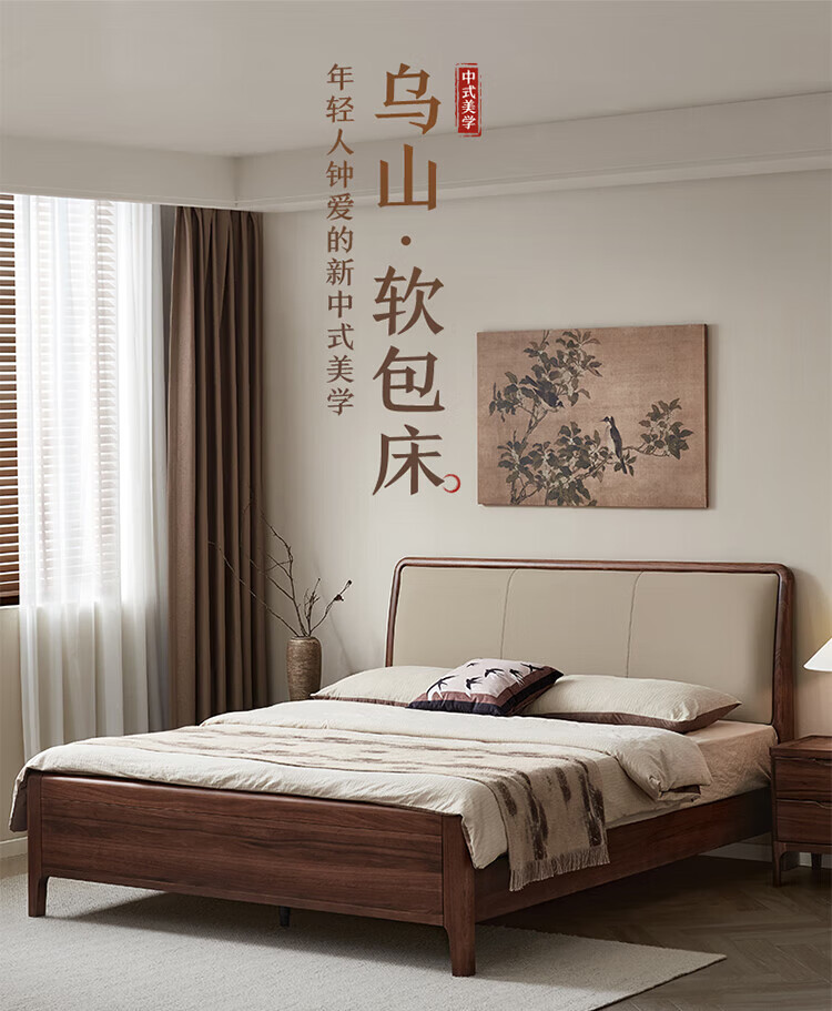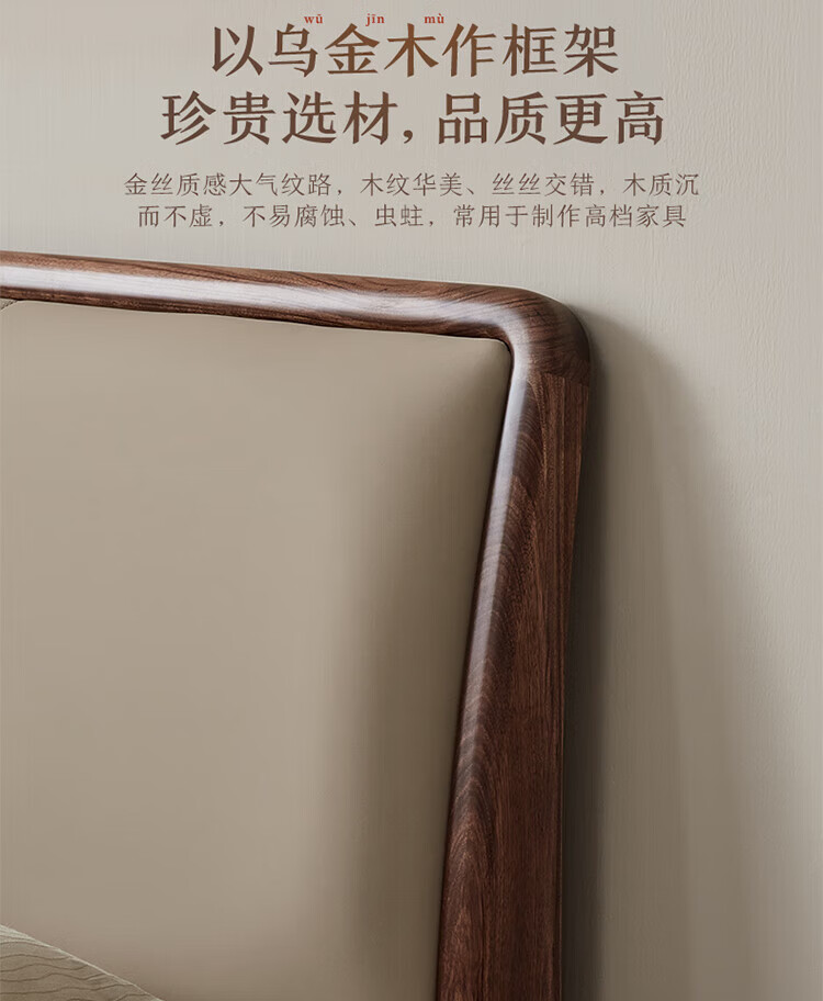 全友家居新中式乌金木实木床1.8x2米主卧软包双人大床高脚床 单床+床垫+床头柜*2 1.8x2米【乌金木带软包+床头四档可调】