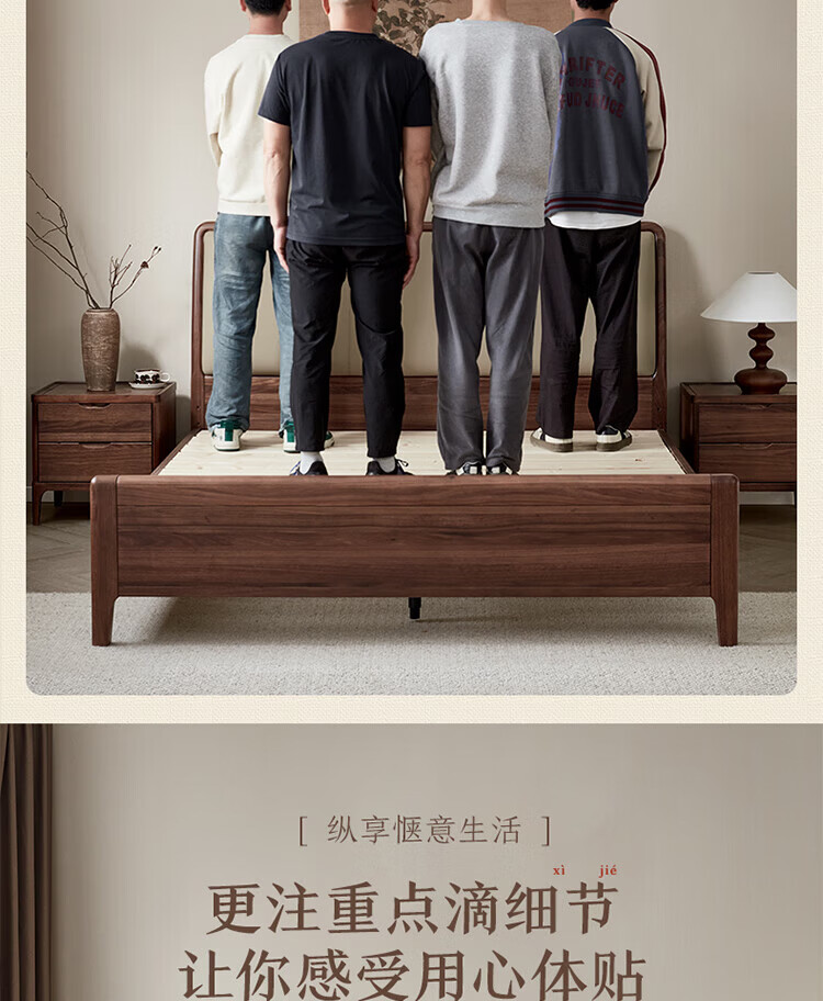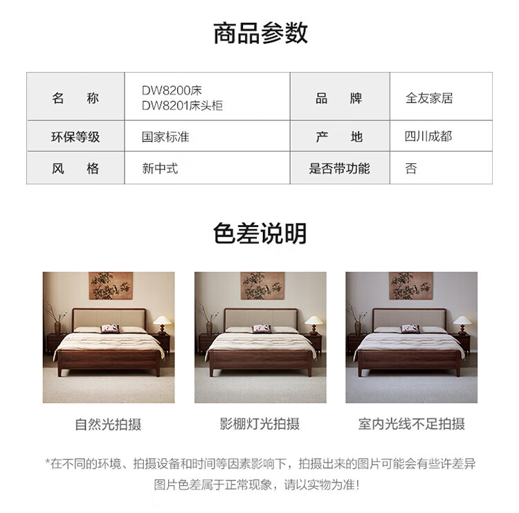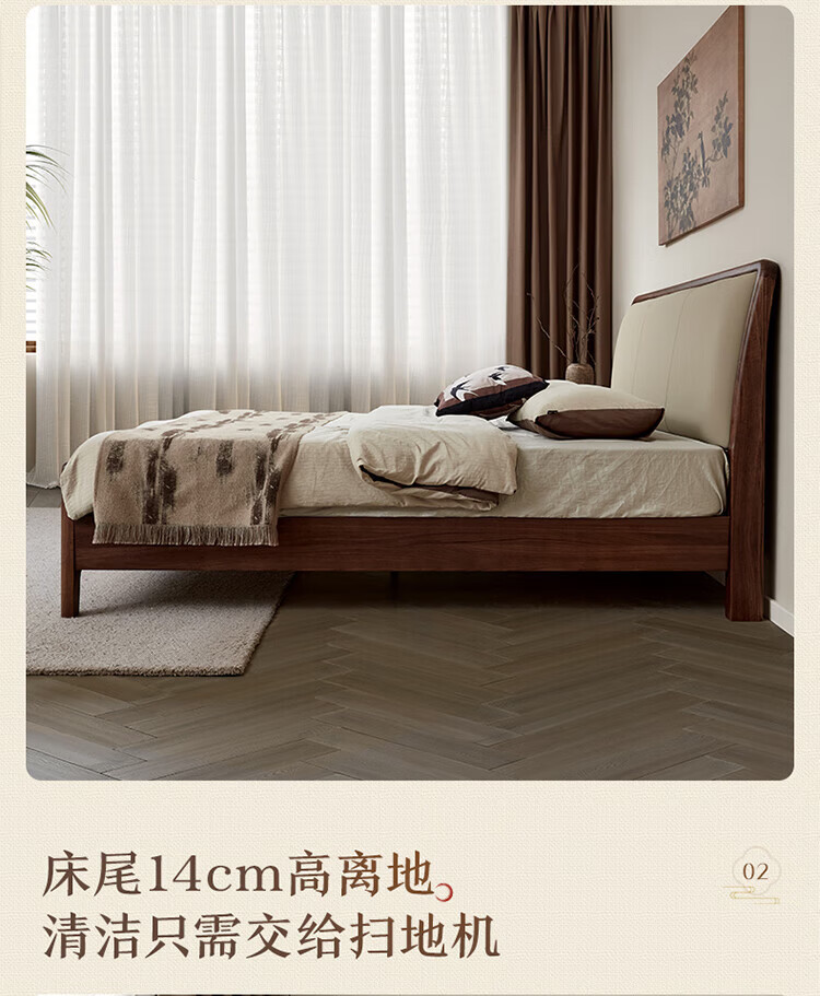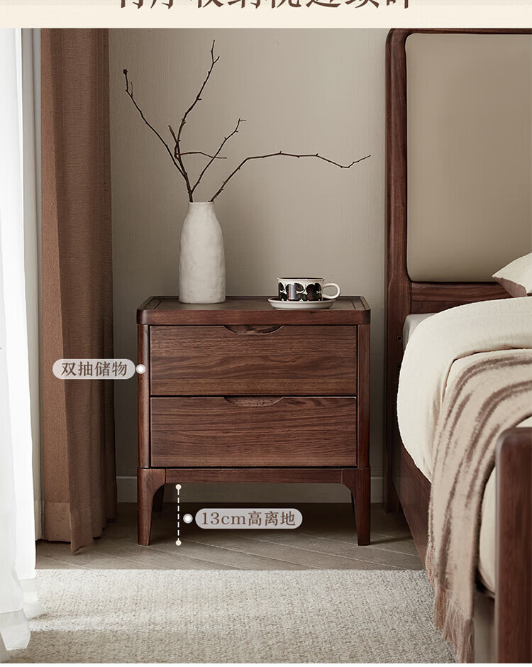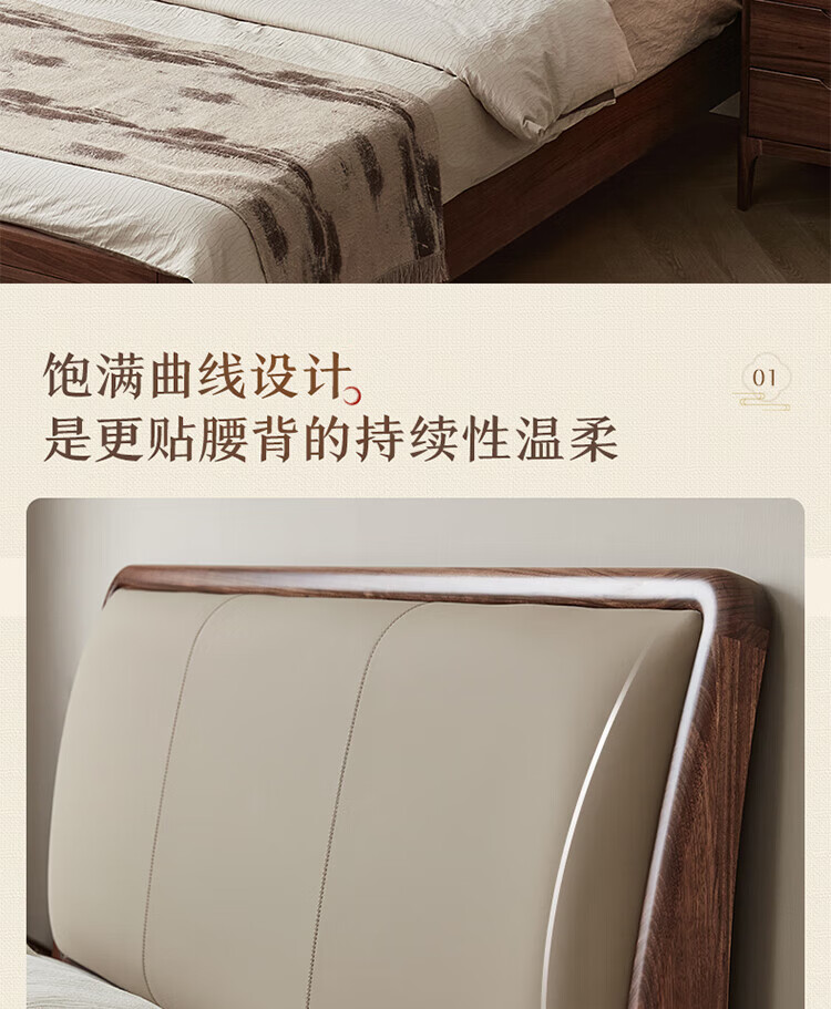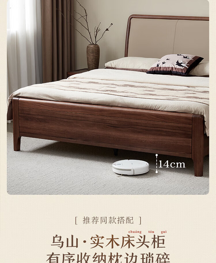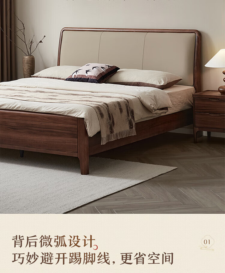 全友家居新中式乌金木实木床1.8x2米主卧软包双人大床高脚床 单床+床垫+床头柜*2 1.8x2米【乌金木带软包+床头四档可调】