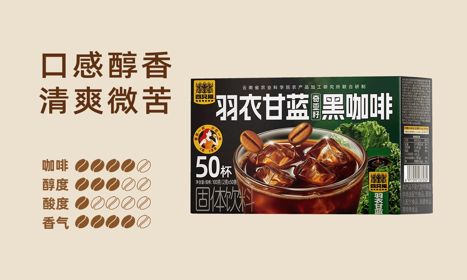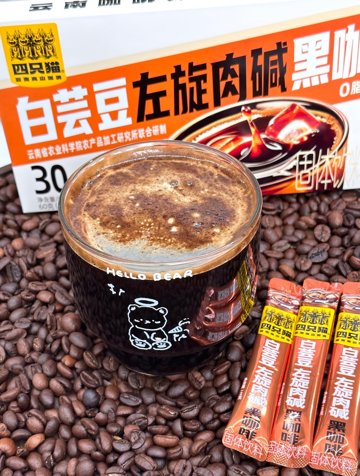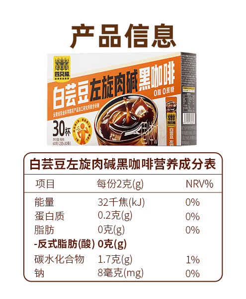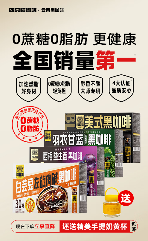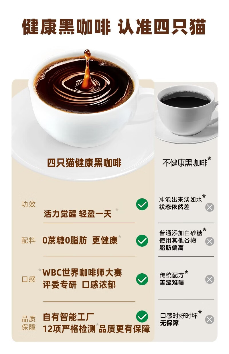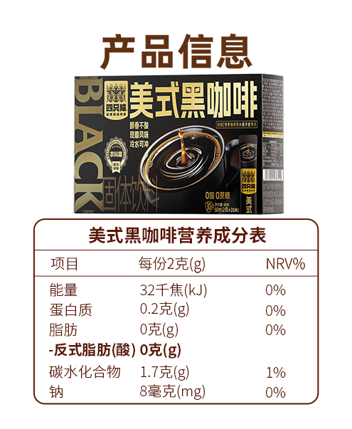 四只猫咖啡西梅羽衣甘蓝白芸豆左旋肉碱美式速溶黑咖啡 0蔗糖 0脂肪 买2送杯 羽衣甘蓝黑咖啡30杯 买2送杯