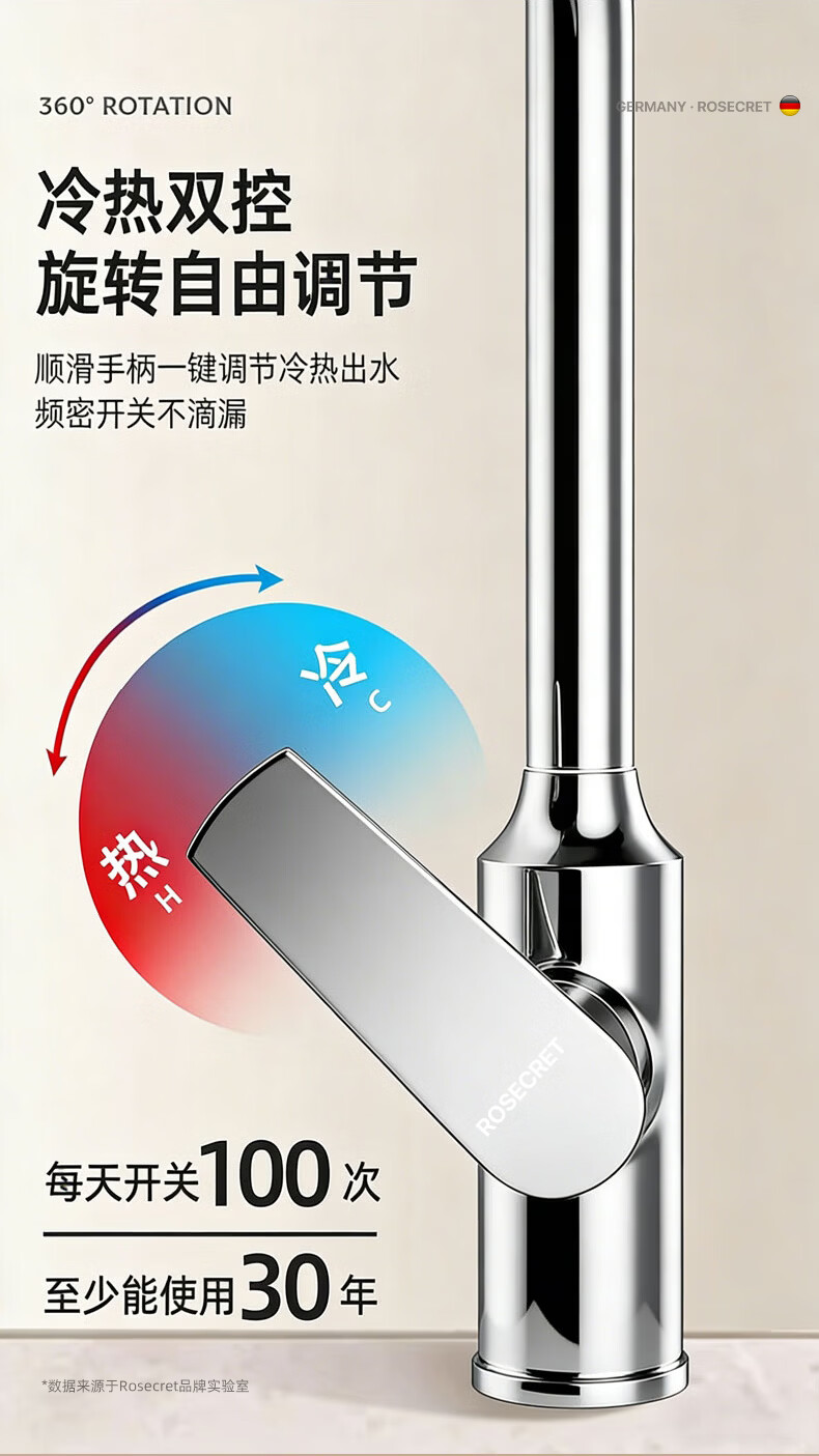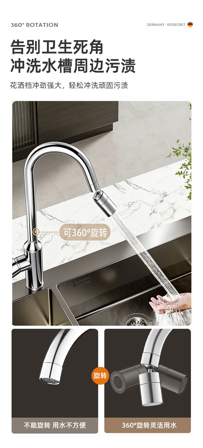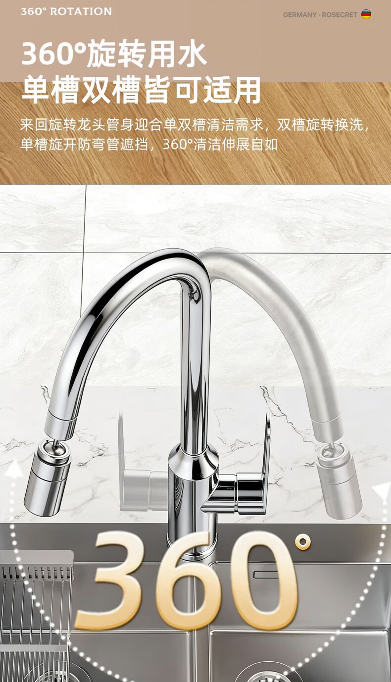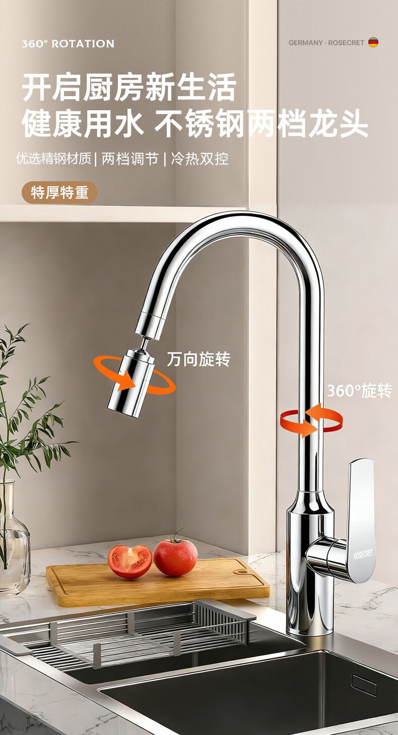 Rosecret【德国】厨房水龙头冷热双温二合一不锈钢洗菜盆万向旋转龙头 增压防溅【电镀银】厨房冷热龙头 两档调节丨赠80CM原装进水管*2