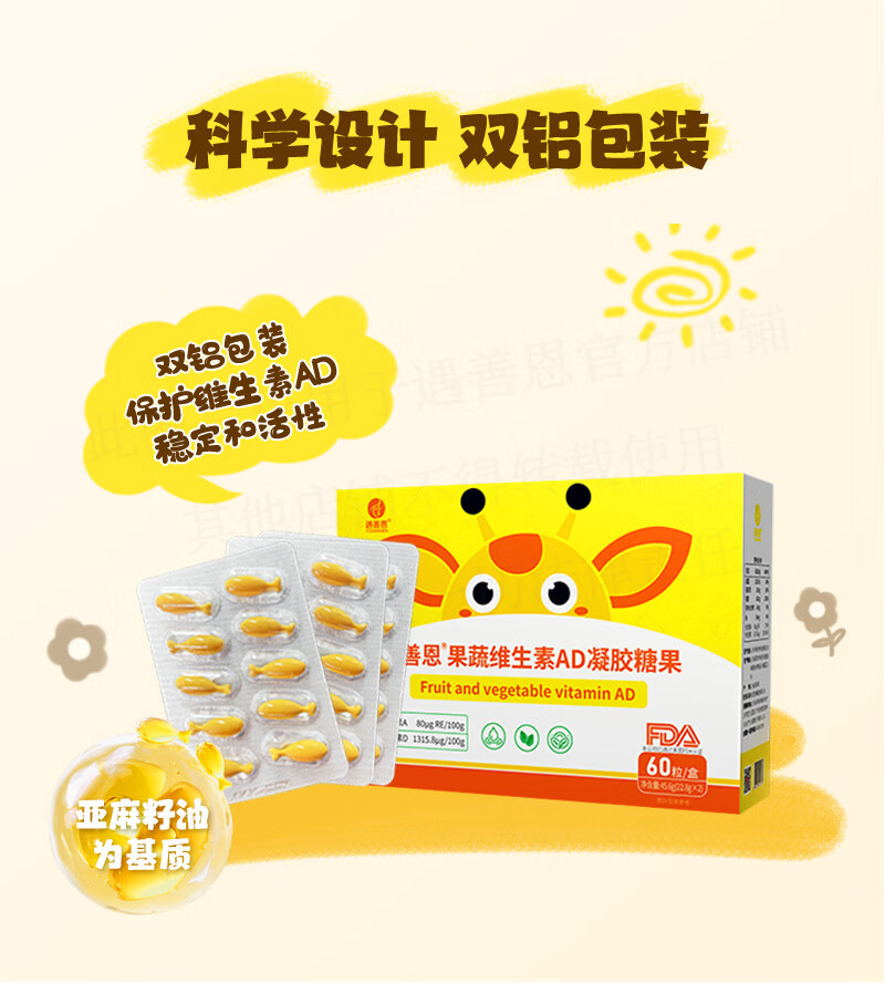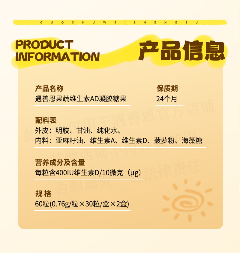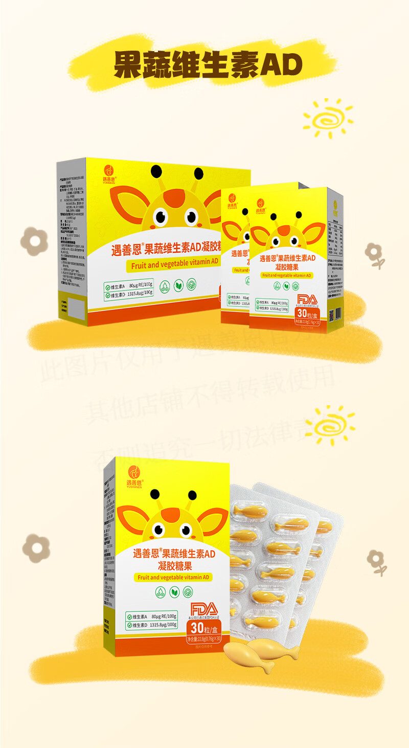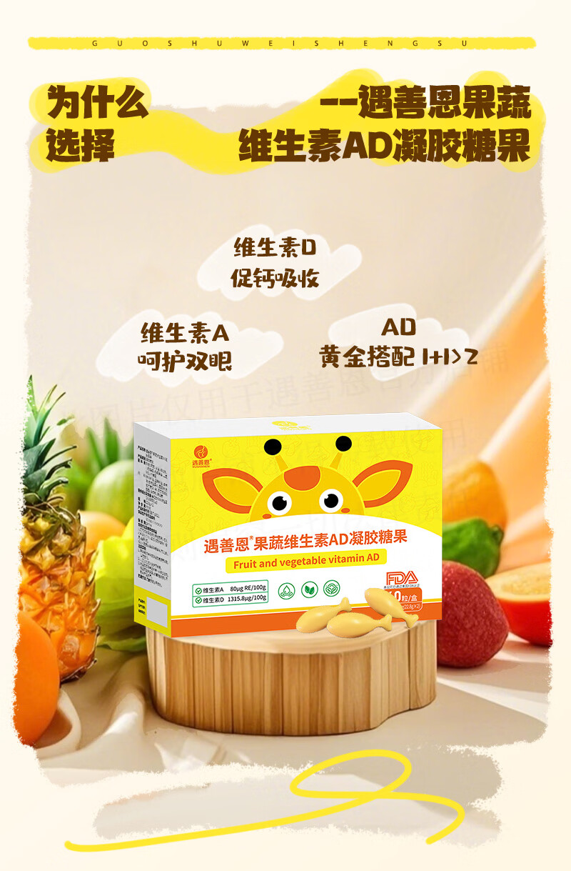 遇善恩果蔬维生素AD凝胶糖果婴幼儿儿童营养补充剂400IU维生素D60粒每盒 AD促钙吸收 60粒*1盒