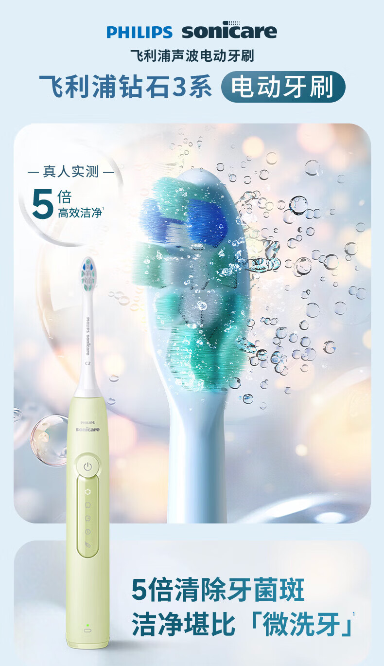 飞利浦(PHILIPS)声波电动牙刷钻石3系 生日礼物 情侣款送男生/女友礼物 微泡水流 绿色 HX5161/05