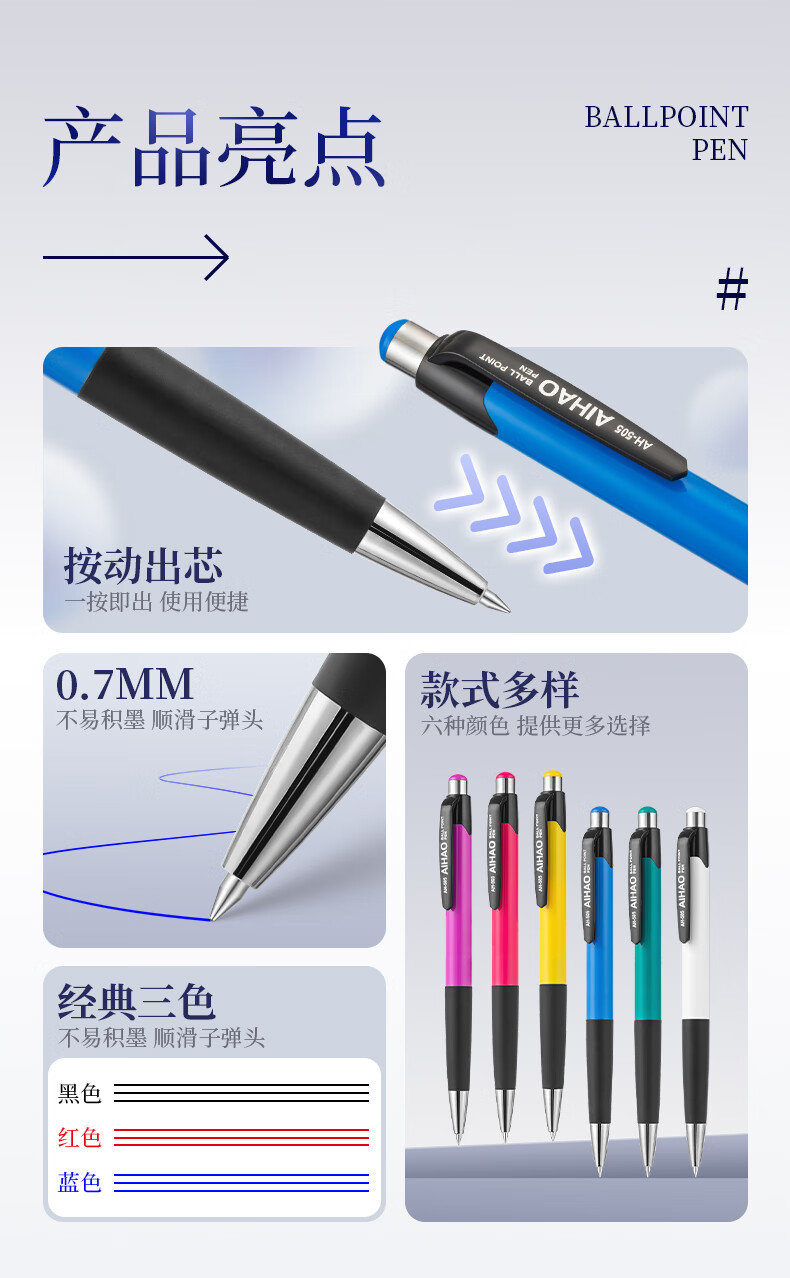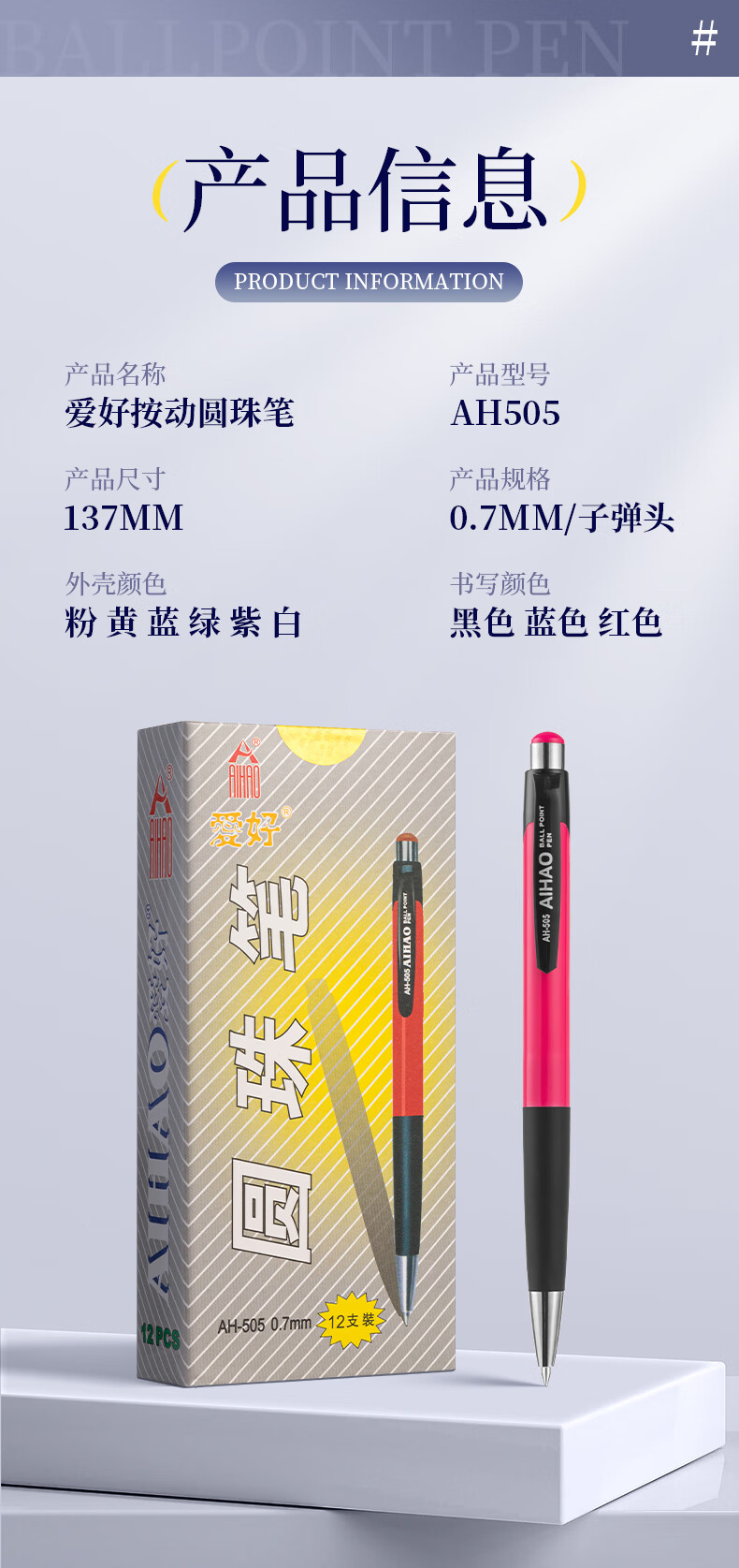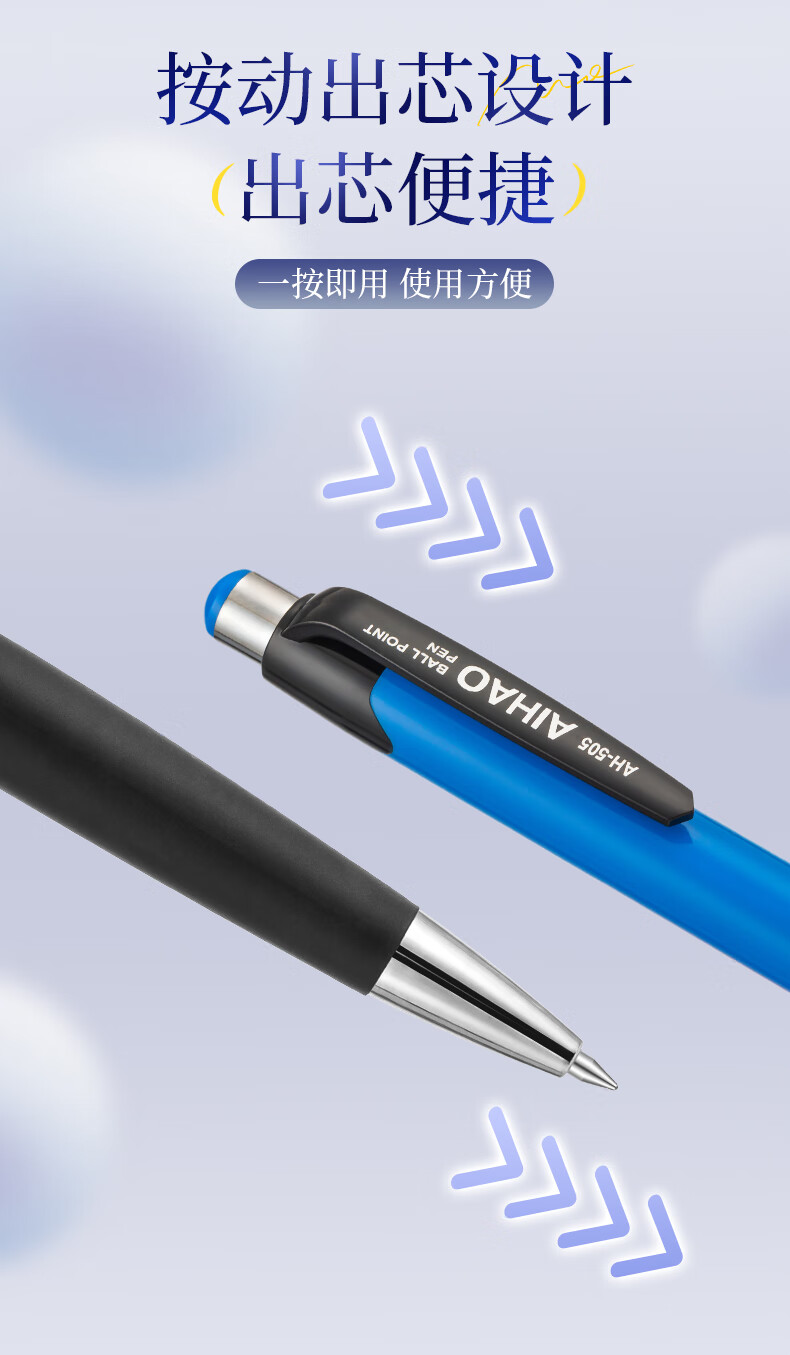 爱好(AIHAO)按动圆珠笔0.7mm中油笔子弹头原珠笔商务办公笔学生蓝色经典圆珠笔12支/盒 ah505